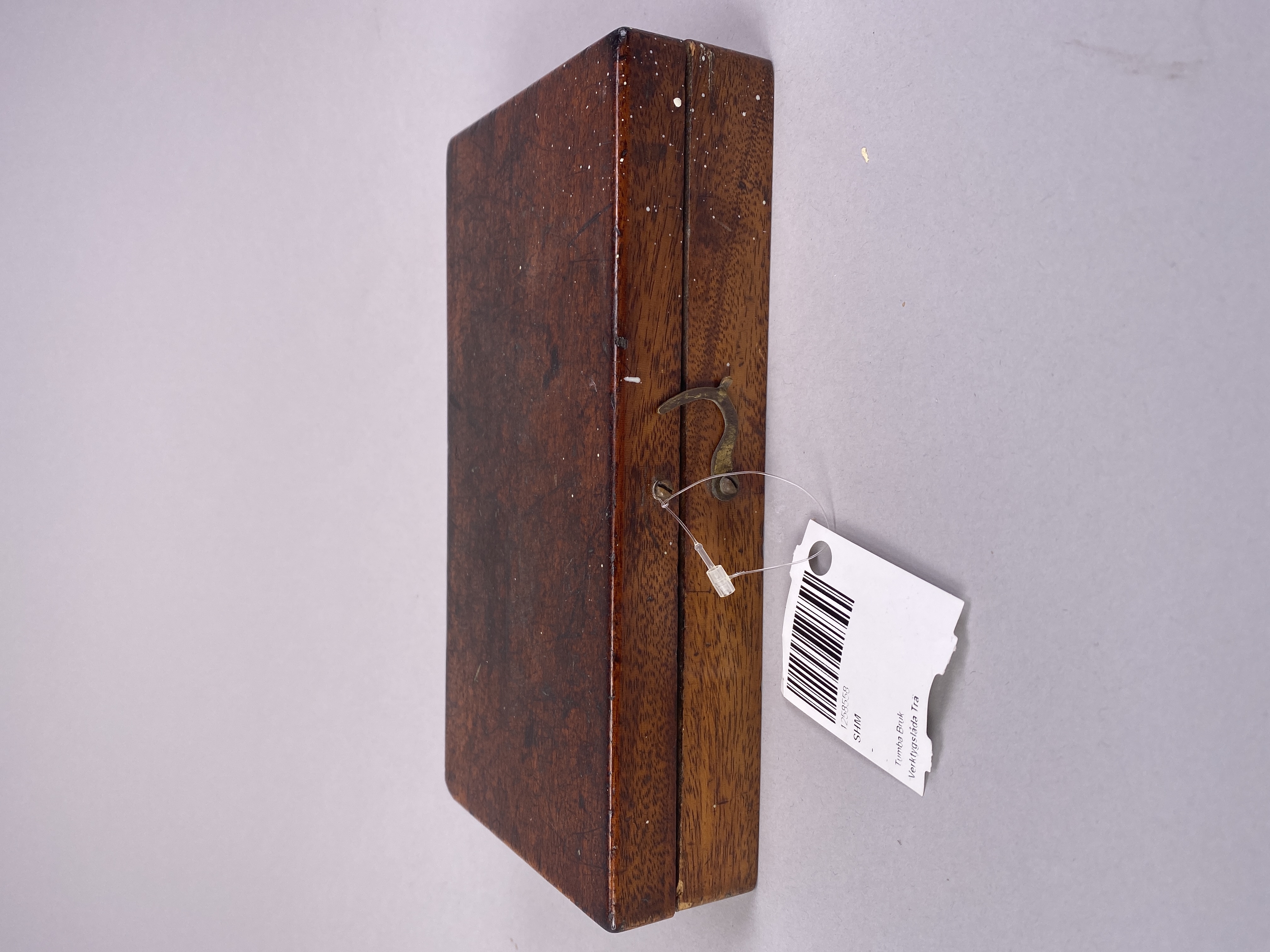 En verktygslåda av trä för borrar och gängsats med en lös trä lock.