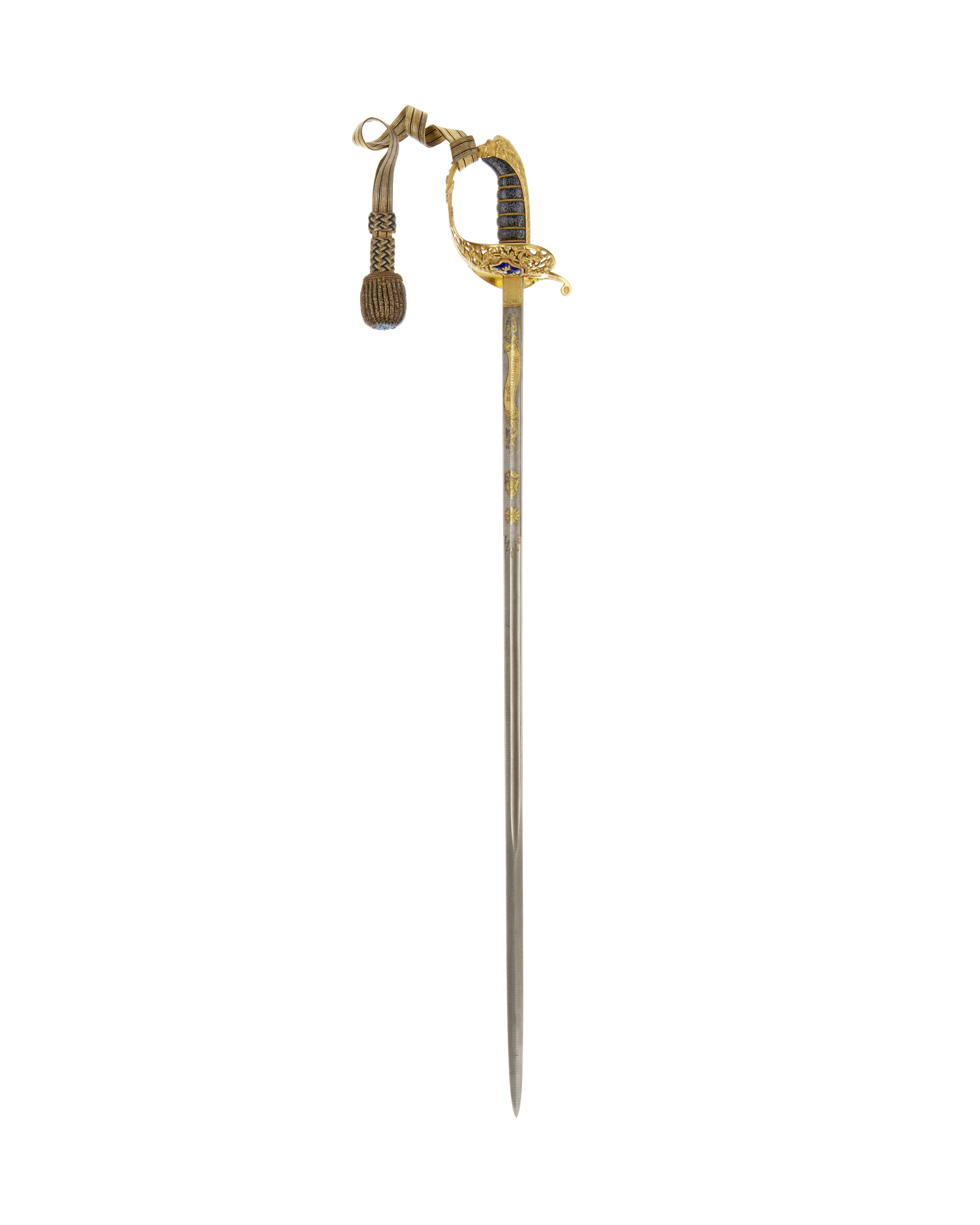 Fäste av förgylld, reliefornerad, gjuten mässing, återgående på fäste till svenska officerssabel av 1859 års modell. Kappa i form av ett lejonhuvud, vars man följer ryggskenan ned till krysset. Handbygel bågformig; överdelen med ett längsgående hål (för fästandet av portepén), härnedanför en slinga av akantusblad. Till handbygelns nederdel ansluter på utsidan en skålad, bred, uppåtböjd parerplåt, på insidan en smal nedåtböjd dylik. Bakre, kort parerstång med rundad ytterände något inrullad. På dess utsida oval stämpel: " J. A. EK ". Utsidans parerplåt med genombruten ornering av lagerkvistar och svärd, i mitten en 32 mm hög snedställd, konturerad sköld, vari tre kronor mot blåemaljerad botten. Insidans parerplåt slät, framtill och baktill sparsamt ornerad med akantusblad. Kaveln klädd med svärtat fiskskinn och lindad med sju varv dubbla parter av tvinnad , förgylld, tunn mässingstråd. Kring krysset (vid kavelns nedre ände) en ring, ornerad med lagerblad. Klinga med äkta damaskering, rak, eneggad till c. 240 mm från spetsen, där tvåeggad (eggarna ej slipade). Ricasso slät, förgylld. Starka delen med ett fält av förgylld ornering, bestående av en liggande S-formig banderoll, vari inskription i fraktur, på utsidan: " Konungen ", på insidan: " Fäderneslandet "; banderollerna avslutade med akantusrankor. Ovanför banderollerna en krönt smal trekronorssköld med lejon som sköldhållare, stående på ett postament; härovanför en strålande nordstjärna. Starka delens ornerade fält avslutade med en förgylld flikig bladkontur. På insidan av ricasson en inslagen tillverkarstämpel i form av en sköld krönt med öppen krona omslutande tre tecken, sannolikt imiterande arabiska skrivtecken: två rombiska punkter, varemellan ett med vinklar avslutat rakt streck. Tillbehör: Portepé m: 1897-1845, fäst genom hålet i handbygelns överdel, lindad runt handbygeln och därnedanför fritt hängande.