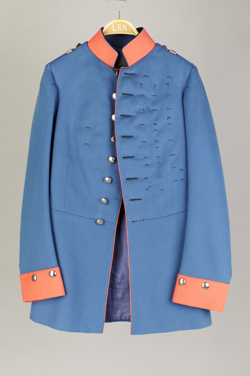 Vapenrock av blått kläde med krage av rött kläde. I kragen svart sidenklaff och snedställd hälla samt tre häkten. Utefter framkanten en röd klädespasspoal. Enkelknäppt med åtta släta försilvrade knappar, d: 20 mm, på undersidan märkta: "L. H. BERGER, COLLANI & C:O". Tränsar på båda brösten. På var axel en hälla av rött kläde med silvergalon, en knapp som föregående,d: 18 mm och en hälla av blått kläde. Ärmuppslag av rött kläde, b: 80 mm med två knappar, d: 20 mm. I skörtvecken spetsiga passpoalerade ficklock med tre knappar, d: 20 mm. Tillhörande tvärställda fickor i fodret under ficklocken. Foder av blå sidendiagonal med en bröstficka och spänntampar med häkte i midjan. Livstyckena tjockt vadderade. Ärmfoder av vit diagonalsiden.