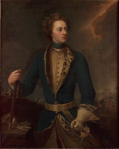 Blå pälsfodrad rock, gult kyller, värja och kommandostav. Runt halsen blå bindel. Yvigt, halvlångt hår. I fonden strid mellan ryttare. Hög mörk himmel. På dukens baksida skrivet med bläck “ T.L 1842”. Kopierad av Theodor Lund efter ett orginal på Drottningholms slott (1845 inv.). Kilad spännram. Förgylld ram med bladslingor av pastellage i hörnen, bredd ca 130 mm.