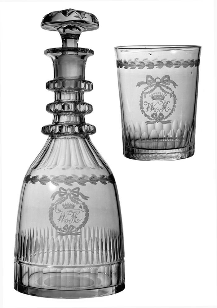 VATTENSERVISER Bestående av tolv karaffiner med proppar och tjugofyra dricksglas. Dekor: slipad och etsad. Karaffiner med proppar: Nästan cylindriska samt sluttande skuldra övergående i en cylindrisk hals med snett utstående mynningskant med tolvsidig ytterkant. Proppar koniska, mattslipade med stor kullrig knopp med åtta radiellt gående skär. Höjd med propp: 29,5 cm, utan propp: 24,9, diameter: 11 cm. Proppar höjd: 7,8 cm, diameter: 6 cm. Dricksglas: Omvänt koniska, nedanför brädden en etsad bladkrans. Höjd: 9,9 cm, diameter: omkring 8 cm. Inköpta efter beställning av Walther och Wilhelmina von Hallwyl från J & L Lobmeyr und Königl. Hof-Glaswaaren-Fabriks-Niederlage, Wien maj 1893. Tillverkade efter utsänt mönster.