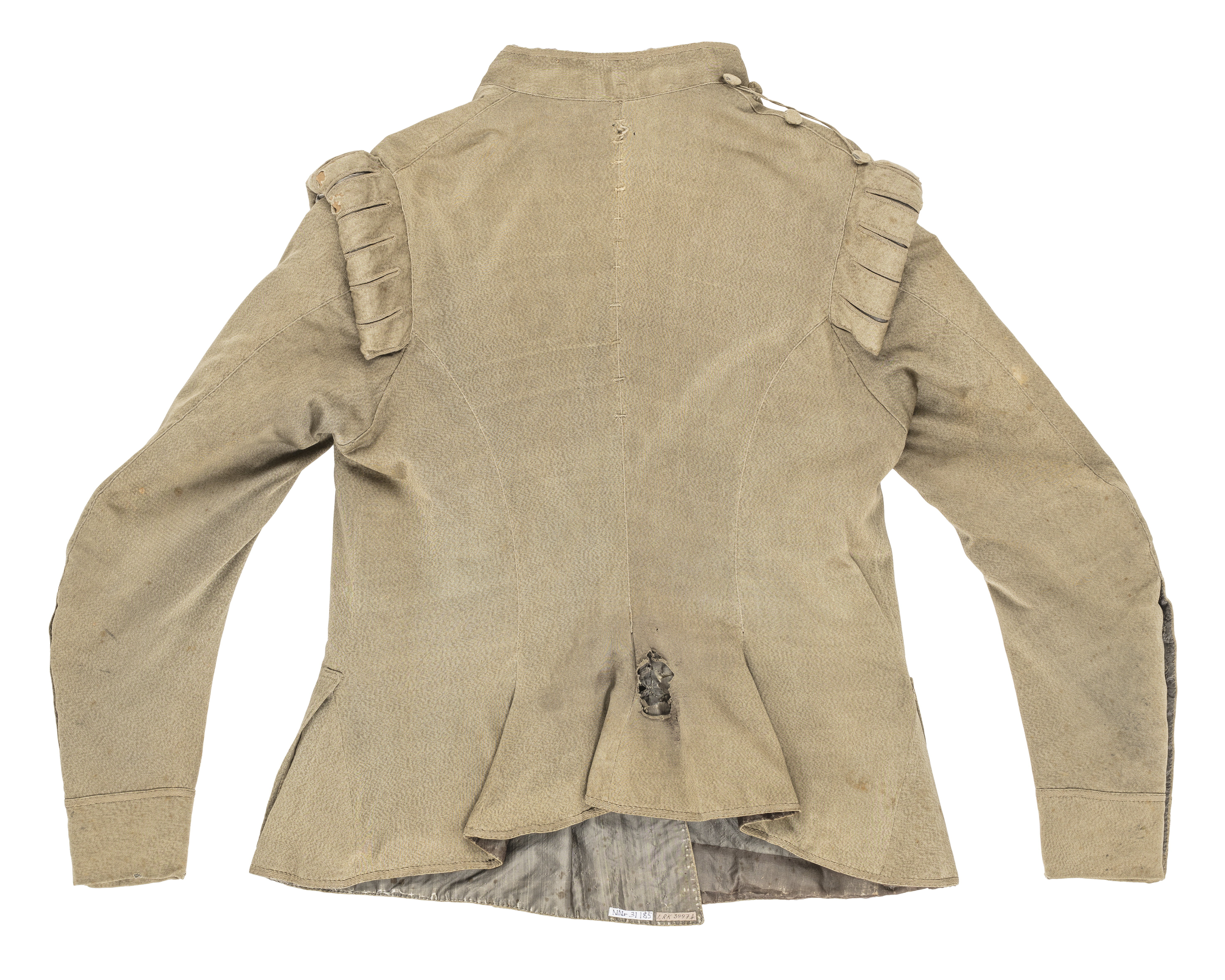Jackan har nationella dräktens snitt med kroppsnära skärning och vida skört, axelkarmar och snäva ärmar. Kvaliteten är småmönstrad silkestrikå i en ljusbrun-och blågrönmönstrad tråd som vid stickningen gett en melerad yta. Originalfärgen var antagligen mycket skimrande, i skärpet under rosetten kan ursprungsfärgen anas. Framstyckena är helskurna och längre än bakstycket. Framkanten aningen böjd typ. Fågelbröst. Jackan har 13 knapphål och 13 runda trådknappar med blom-mönster. Ett band kantar framkanten och inramar knappraden resp. knapphålen. I halsen en ståkrage ca 3 cm, kragen är lågt fästad och långt ifrån 1800-talets kragisättningar då halslinjen gick mycket högre. Axelkarmarna (26 cm långa) är banddekorerade i slitsarna där ett siden som kan ha varit metalliskt blå/grått är synligt. Karmarna är troligen stoppade med ylletyg jfr karmarna på flottans jackor där stoppen kan ses. Jfr Armens Flottas Uniformsjackor nnr 21480, 25569. Två liggande fickstolpar, ungefär i midjehöjd, med lodräta knapphål. Knapphålen sydda på vår tids sätt. Innanför ficköpningarna på vardera sidan spår av igensydd öppning. Ryggen är skuren i fyra stycken. Dessutom en trekantig kil i sömmen mellan fram och bak vilken ökar skörtvidden. Fickstolpe är infälld i sidsömmen mot framstycket. Fickpåsen är dubbelriktad, både framåt och bakåt. Över mittsömmen bak finns 11 st tränsar för ordenskrokar. De fem översta är trasiga. Ärmarna är i två delar och snäva och svängda. Ärmsprund i en av sömmarna med 9 knapphål, vinkelrätt mot sprundet. Sprundets längd är 24 cm. Manschett i tyget i samma vidd som ärmen. Fodret i svart sidentaft har ingen sidsöm, i övrigt skuret som yttertyget. Vadden är en bomullsvadd typ fetvadd, som sytts fast i fodret. Själva plagget är "dubbelsytt" med samma tyg som fodret troligen för att hindra att tyget töjer sig. Knappar: 38 st totalt 13 st trådknappar mitt fram, rund kulle (diameter 12 mm) höjd 8 mm, blommönster på kullen 16 st platta trådknappar vid ärmsprunden (9 st på v. ärm och 7 på h. ärm två saknas), samma mönster som framkantens knappar ( diam. 12 mm, höjd 3 mm) 2 st trikåklädda knappar vid fickorna (12 mm) 7 st trikåklädda knappar (15 mm) därav tre på höger axel, två vid ärmhålorna för kapp-knappar + två vid halsen. Dekor: Bandkant: Totalt 888 cm (bandåtgång till en axelkarm: 182 cm). Snodd: 401 cm Serafimerstjärna och svärdsorden påv. bröst se resp. nnr 18986, 18969