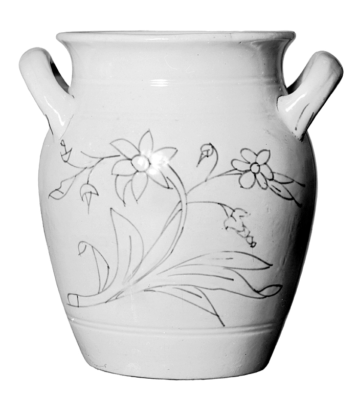 KRUKA (sylt-) av stengods ("stenmassa") med blåskiftande glasyr. Tunnformig, med plan botten, utsvängd mynningskant samt två öron. På utsidan tre grupper insänkta ränder med två i varje grupp, en upptill, en i höjd med öronens fästen och en nedtill; mellan de två sistnämnda randgrupperna på två motsatta sidor en blom- och bladornering i blå konturteckning under glasyren. Öron flackstaviga, ögleformiga och snett utstående. Höjd: 21,5 cm.; diameter: 17,8 cm. Svensk tillverkning; Rörstrand.