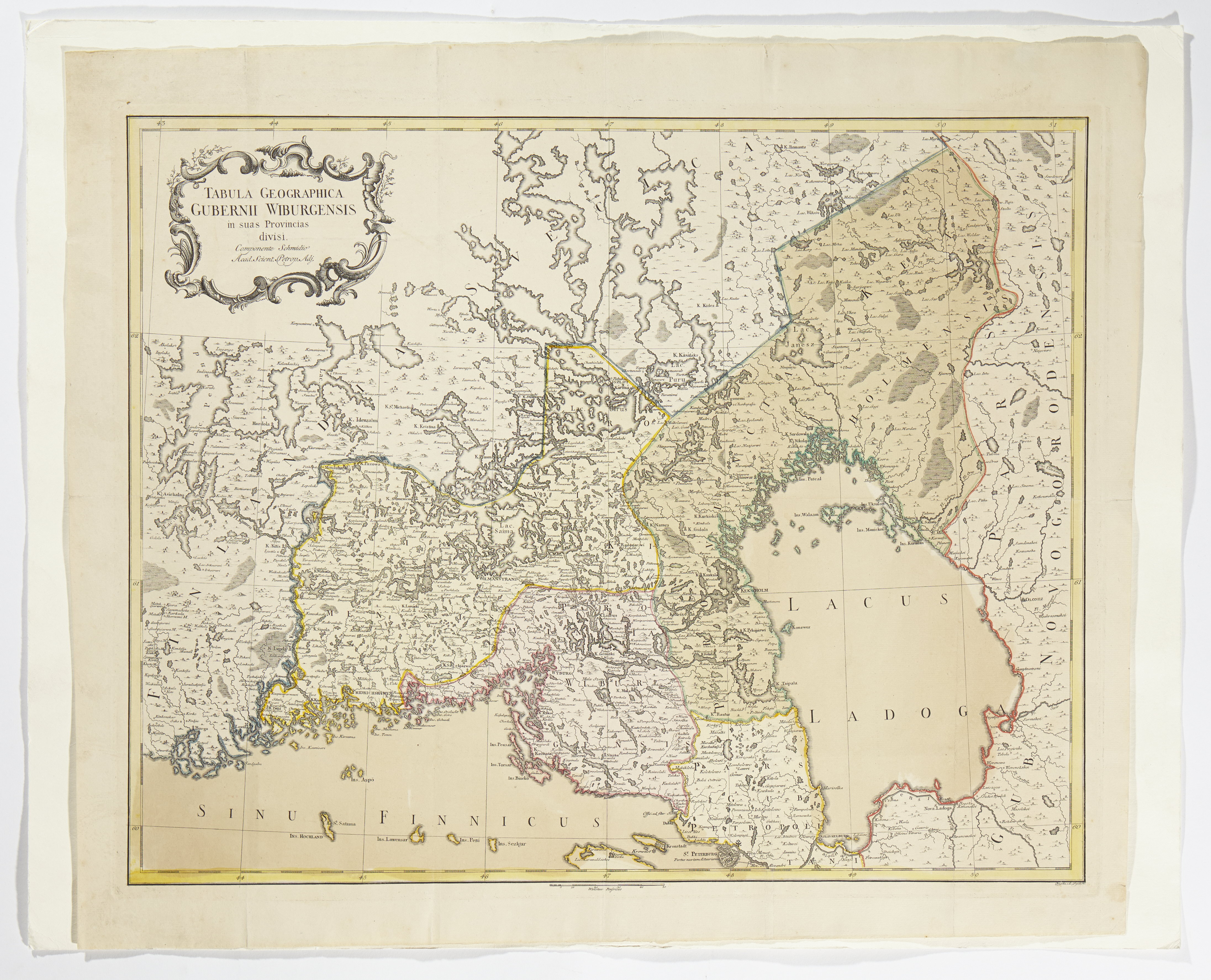 I kartusch ”Tabula Geographica Gubernii Wiburgensis in suas Provincias divisi. Componente Schmidio Acad. Scient. Pehop. Adj.” Nedtill t.h.? ”Scripta A. Tepckon” (gravör?). På baksidan med bläck ” Wiborgs Guvernement”. Koppartryck + handkolorerad.