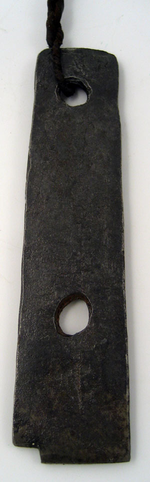 Kulmått av rektangulär platt stålprofil med två borrade hål, diam 6 och 8 mm. Nedre änden med utsmidd rak spets, mejsel.