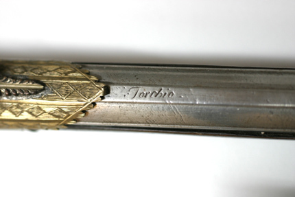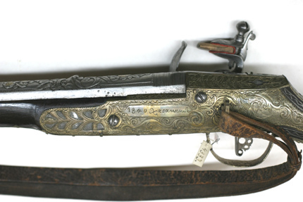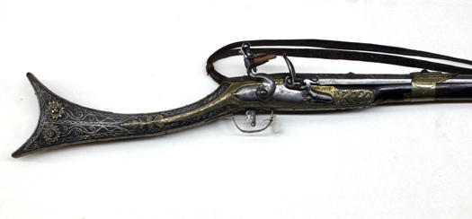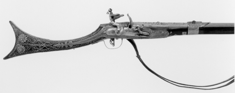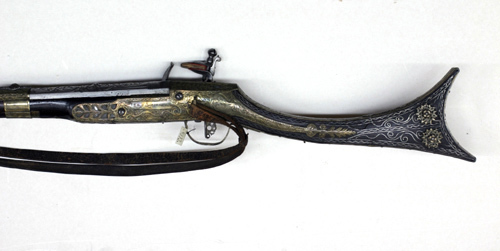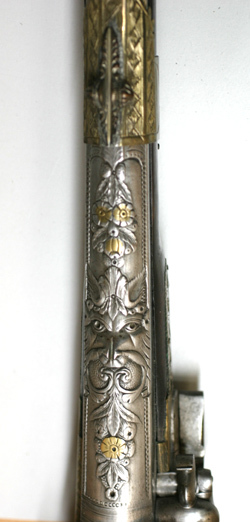 Rund, slätborrad pipa av stål med längsgående, plan ribba. Kammarstycket ciselerat på ovansidan med dekor i form av en maskaron i hög relief, omgiven av blad och bladornament, i maskaronens näsa en siktskåra. På blommorna påslaget guld. Orneringen avslutas med graverade bladornament. På ribban längs ryggen graverat: "F.a C.o Paris. Torchio". Mynningen något vidgad med vulst runtom. På svansskruvbladet graverat, treflikigt blad. Riktmedel: På bakersta pipbandet ett ciselerat ståndsikte av försilvrad koppar. Fästning: Fem pipband av mässing, på ovansidan breda, konturerade och graverade. Flintlås av stål. Välvt låsbleck med graverad dekor runt kanten, framför hanen: "F C Paris", därovanför kunglig krona och grekiskt ord: "alemema"(?). Välvd, s-formig hane, hankropp och skruv med graverad dekor. Lös överkäke, graverad på ovansidan. Graverad hangren. Päronformig käkskruv. Fängpanna med vattenpanna och fals. Räfflat eldstål med åsad baksida med graverad volut- och bladdekor. Utvändigt batterifjäder, något graverad, rullad mot fängpannan. På insidan av låsblecket graverat: "1840". Slagfjäder, nöt med hel- och halvspänn, studel och stångarm blånerade. Fästning: Två låsskruvar och en krysskruv av stål. Genombruten avtryckare av stål. Brun helstock av trä, smal kolv, nedåtsvängd i båge, bakåt vidgad till fiskstjärt, rektangulärt tvärsnitt. Bakplåt, kolvryggen, undersidan samt kolvnacken och partiet runt låset beslaget med mässingsplåt med graverade volutrankor och bladornament. På vänster sida graverat 1840 samt grekiskt ord "chasame"(?). Beslaget går från kolvnacken ned i konturerade flikar på kolvens sidor. Mässingsblecket på några ställen genombrutet så att en botten av tenn framträder. Kolven i övrigt inlagd med våg- och sicksacklinjer av tenn. På kolvens sidor två ciselerade och genombrutna rosetter av försilvrad koppar. Framstockens främre del beslagen med mässingsbleck med graverad bård. Skålformig varbygel av mässing med graverad dekor. Två byglar av försilvrad mässing för gehäng. Tillbehör: Laddstock av stål (fastrostad) med svarvad ände.