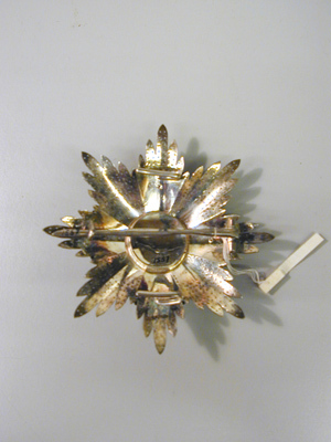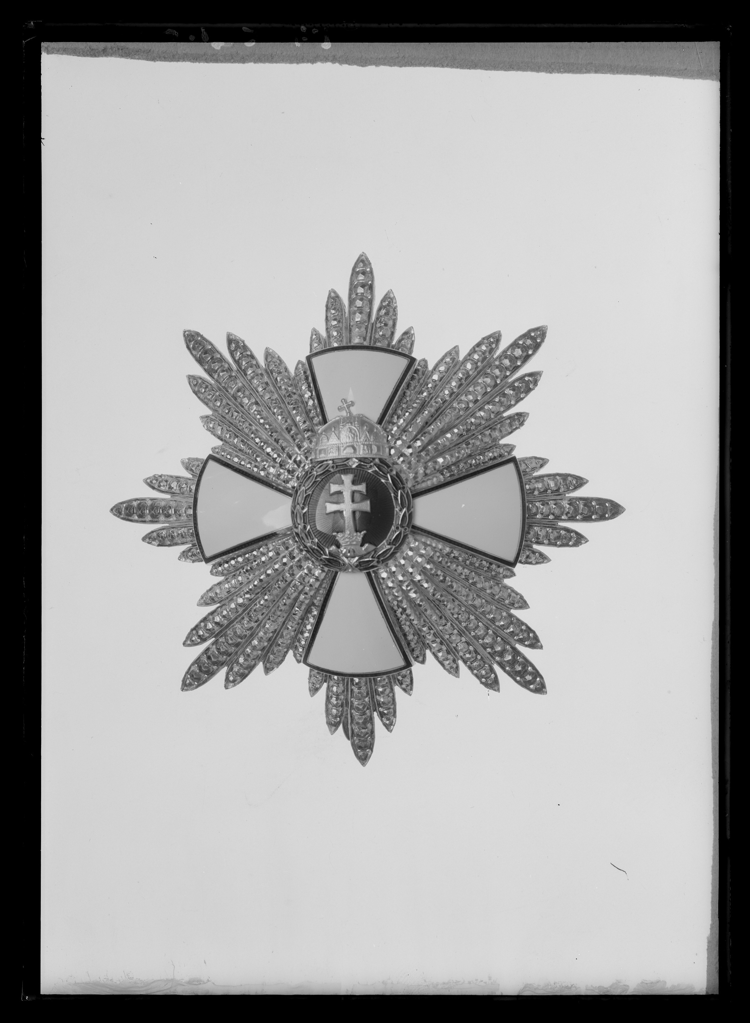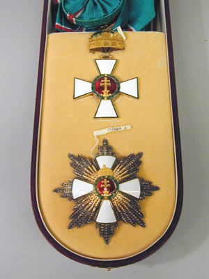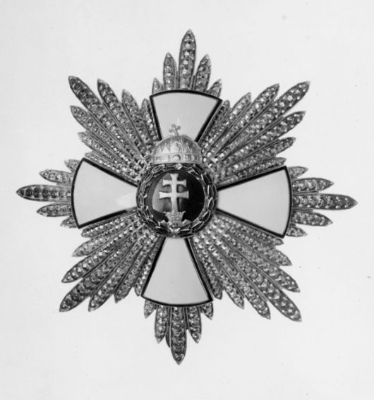 Åttauddig, välvd, flinkerad strålstjärna, sammansatt av 48 strålar med fasetterade pärlor samt repstavskanter. Därpå fäst ordenskorset, ett vitemaljerat mantuakors med en smal, grön kant, mellan korsarmarna fyra strålar av fasetterade guldpärlor. Välvd medaljong täckt med röd, genomsynlig emalj. Därpå fäst ett patriarkkors, stående på ett treberg, öppen krona om korsfoten, allt av guld. Däromkringen en grönemaljerad lagerkrans av guld, krönt med Stefanskronan av guld. På baksidan en vertikalt placerad säkerhetsnål med två hakar.