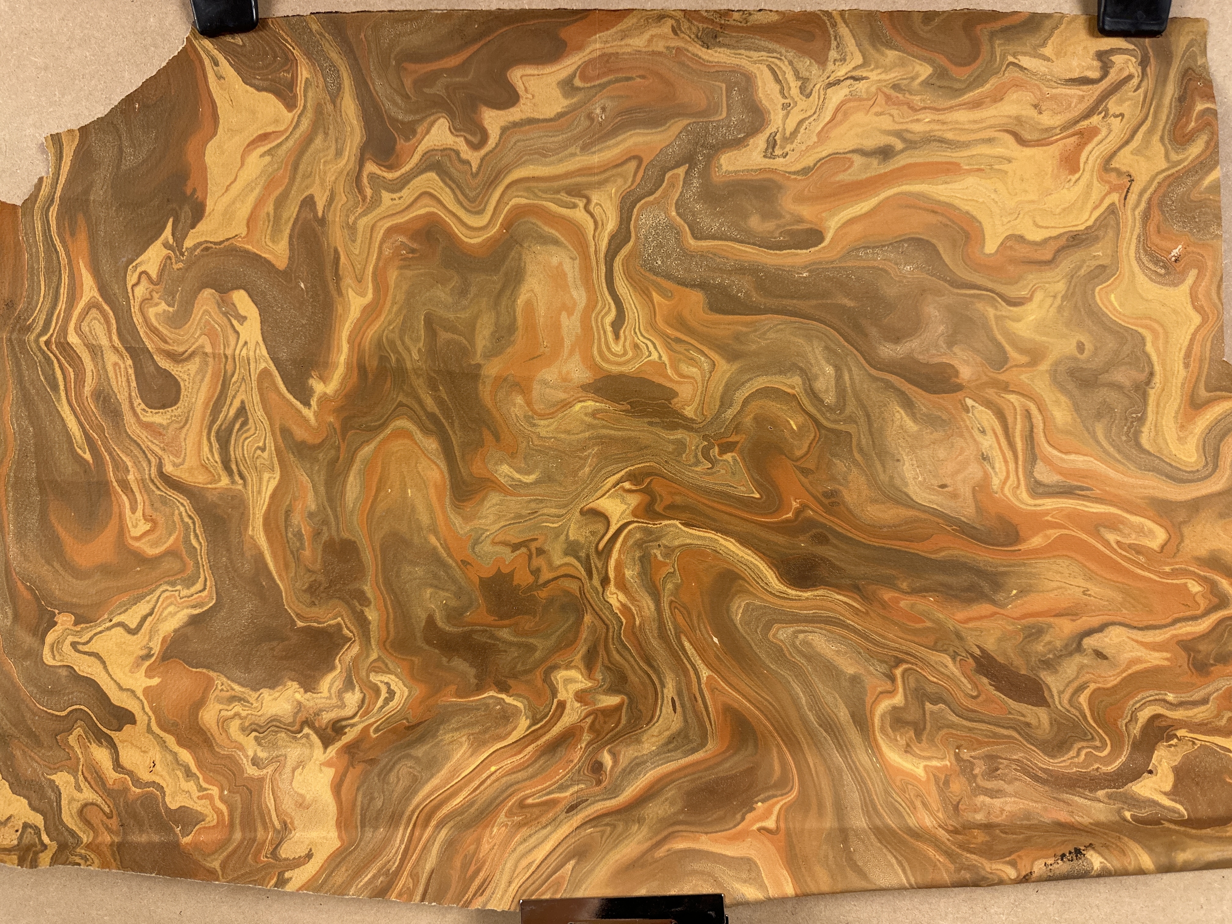 Marmorerat papper, i färgerna orange, brunt och gult. Marmoreringen utförd på pappret "Ingress" tillverkat vid Tumba bruk.