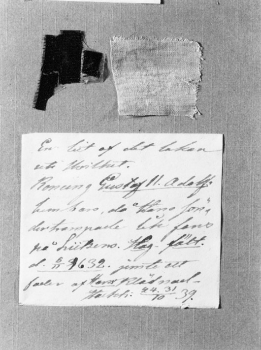 Oregelbundet, fyrkantigt stycke tunt linnetyg, tuskaft, något fläckat. Uppklistrat tillsammans med nr 15430 på tavlan. Därnedanför etikett med bläckpåskrift: "En bit av det lakan // uti hvilket // Konung Gustaf II Adolf // hembars, då Hans sön-// dertrampade lik fans // på Lützens Slag fält d. 6.11 1632 jemte ett foder af Hans Klädnad // Stockh. 24-31-10 39."