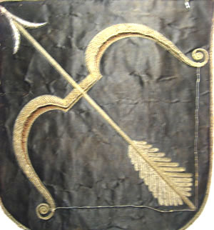 Vapensköld av svart sidenatlas med en stiliserad båge och en därpå liggande pil i relief. Pilen och bågen är broderade i läggsöm av silvertråd med spår av förgyllning. Pilen är på insidan broderad med brun silkestråd. Pilen har i ändan en fjäder broderad med vit silkestråd och ett smalt silverlan omvirade av silvertråd utdragen i små öglor. Pilspetsen är av silverlan. Pilbågen har mellan de två volutformade ändarna en streng av en smal silversnodd genom vilken pilen är spänd. Skölden kantas runtom av en tjockare och en smalare snodd av silvertråd samt med vit silkestråd och ett silverlan omvävt av silvertråd utdragen i små öglor. Vapnet kröns av en friherrekrona av silvertråd med spår av förgyllning. Kronringen är broderad i ett våffelmönster kallat gaufrure. Mitt på kronringen sitter fem stenimitationer av silverlan kring vilka virats blå respektive röd silkestråd kantat av en smal snodd av förgylld silvertråd och utav små prickar av kantiljer av förgylld silvertråd. Kronringen kantas av samma slags snoddar som skölden. Kronspetsarna utgörs av rundlar broderade i relief av vit silkestråd och silvertråd utdragen i öglor. Vapnet är på baksidan klätt med tryckt makulatur, nertill blandannat med "Tacksäyelse för Christi Pijna". Kronan är även fodrad med linnelärft. Mitt på baksidan av skölden står en påskrift med svart bläck: "Sauelax" och intill står märkt med blyerts: "No 29".