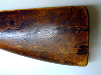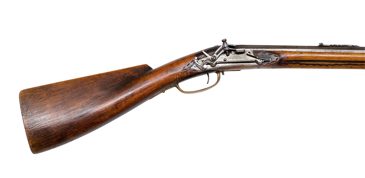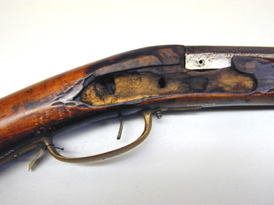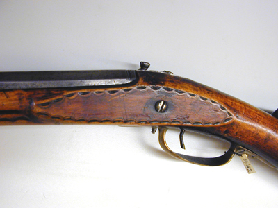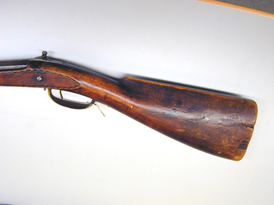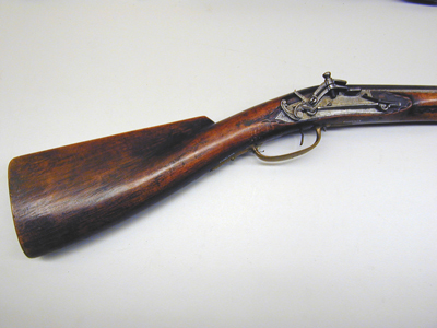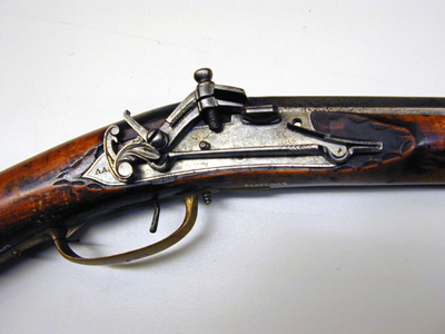 Pipa åttsidig, sexräfflad av stål. Räfflorna plana i botten med skarpa hörn. Svansskruvbladet baktill avrundat. Vid kammaren bakände infilade tre runt pipans övre fasningar löpande skåror. Omedelbart framför svansskruven på övre fasen en stämpel "EPS". Därframför är ingraverat med skrivstil: "SAS". Pipan underfasningar enbart grovfilade. Riktmedel:140 mm från pipans bakkant är ett ståndsikte inlaxat, insatsskiva av läder(?, ev. något konstmaterial). På foten en framåtriktad förlängning, S-formad med eklövsformig avslutning. Siktet pålagt på h. sida med silver. Stolpkorn av mässing, inlaxat i pipan. Fästning: Ett häfte av stål, inlaxat och fastslaget 150 mm från mynningen. Pipan fäst med krysskruven och ett pipstift av trä. Snapplås med plant låsbleck av stål, baktill utdraget i en spets, framtill avrundat. Längs bleckets kanter en graverad linje. Bakom varhaken stämplat: "AAS". Hane med hanfoten uppdragen i en liten spets, vilken vid säkring griper om varhaken. Hane av svensk typ, överkäkens hals är inlaxad i underkäken. Käkarna rektangulära, från käkskruven utgår V-formigt två par parallella linjer. Käkarnas halsar med infilade repstavmönster i kanterna. Studeln S-formad med djup bladgravyr. Varhake med likadan gravyr. Slagfjäder-fängpannelocksfjädern kraftig. Fängpannan rektangulär med avfasade hörn. Fängpannelock och eldstål saknas. Stång- och stångfjäder på bleckets insida. Fästning: Låset är fäst med en genomgående skruv. Avtryckare av stål, rektangulär, fästad i snöre i stocken(???). Helstock av björk(?). Kolvens genomskärning droppformig, undersidan svängd, ryggen plan, kraftig näsa. Kolven saknar bakplåt och kindstöd. Runt låset och sidbleckssidan är med holkjärn inskuret "halvmånar". Framstocken har öppen laddstocksränna till ungeför 2/3 längd. Två rörkor av delvis graverad mässingsplåt, fästade med två stålstift vardera. Näsband av stålplåt fästat med ett mässingsstift. Längs framstocken löper på båda sidor en urmejslad ränna, svärtad, samt från början av laddstocksrännans slutna del till låset en på varje sida löpande grupp "halvmånar" inskurna med holkjärn. Varbygel av mässing. Själva bygeln oval med ett sirligt ingraverat S. Främre armen utdragen i spets. Bakre arvsmalnande med instämplat namn: "ANDREAS ANDREEFII".