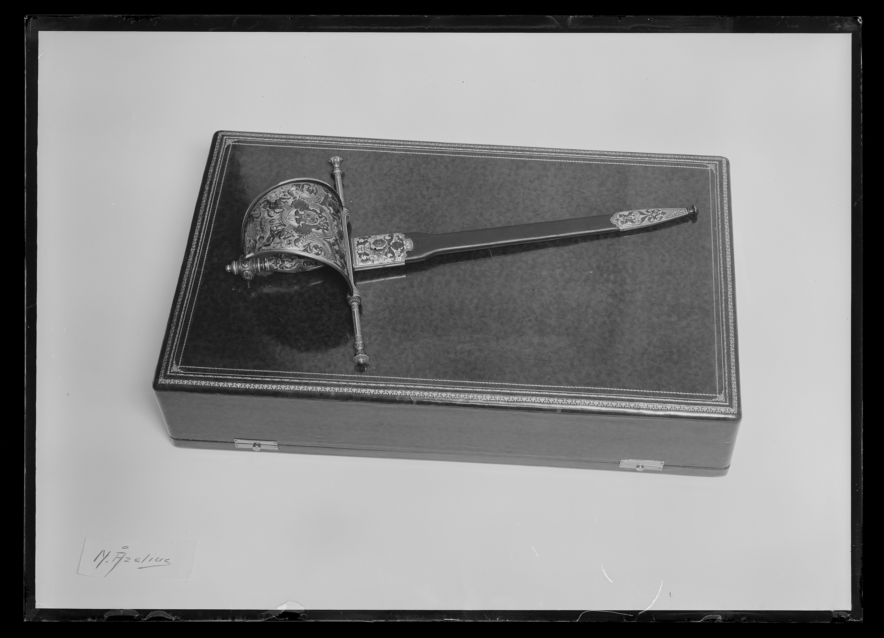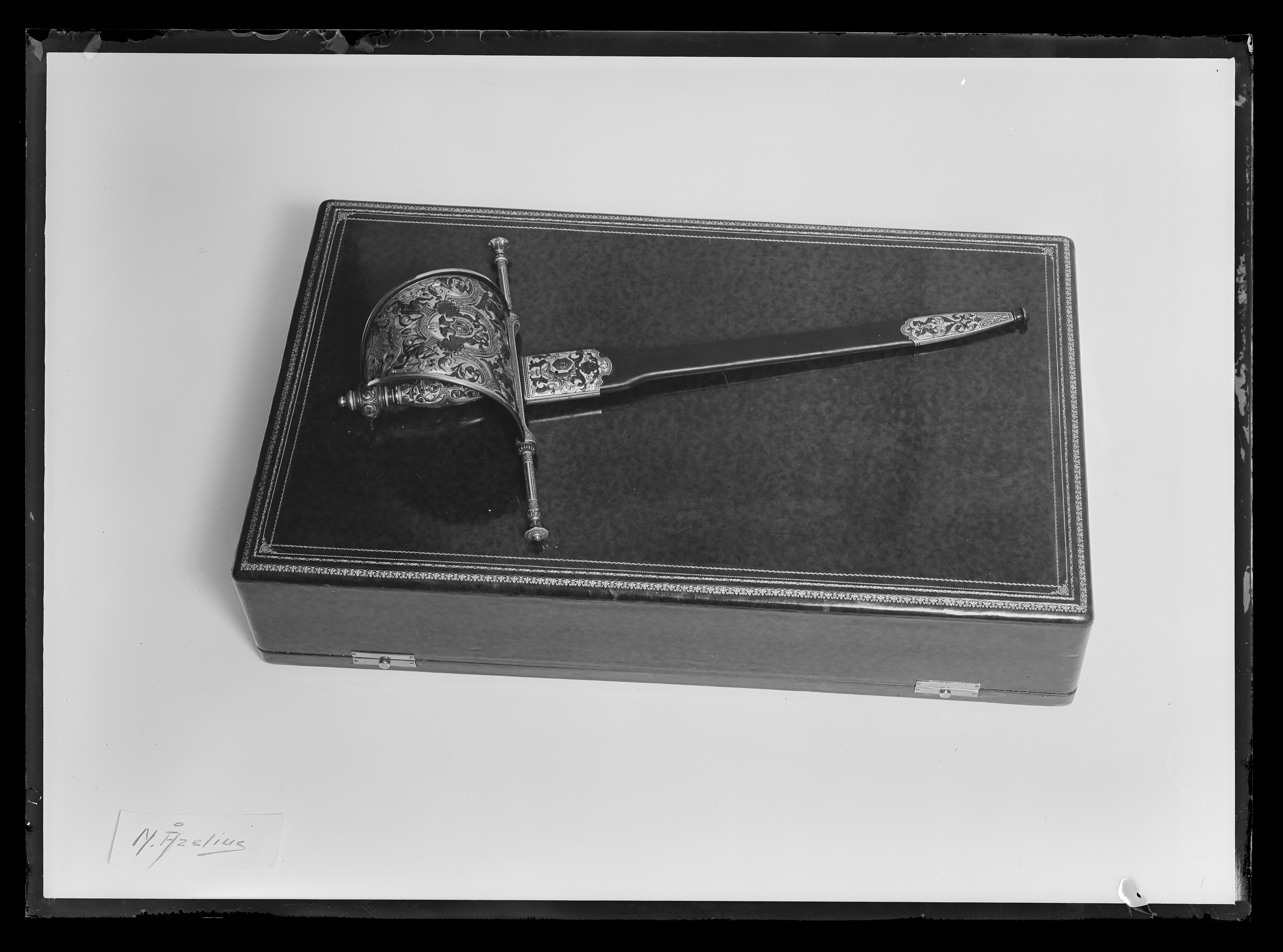Helt av stål. Fäste med tryckt rund knapp, däröver mindre, tryckt rund kula krönt av rund kula. Långa raka parerstänger, runt tvärsnitt, avslutade med lotuskapitäl, mittpartiet fyrsidigt. Tresidig, rundat uppåtböjd parerplåt med basen införd i spår i parerstängerna och spetsen fastskruvad vid utskott på knappen, kanterna omböjda framåt (rompepuntas). Spolformig kavel. Fästet dekorerad med driven, punsad, ciselerad, svärtad och förgylld dekor. På parerplåtens utsida mot punsad och förgylld botten svärtad samt polerad, förgylld rankdekorer, i mitten oval och däri, delvis täckande ovalen en svärtad, med guldkrona krönt dubbelörn, på bröstet sköld med Spaniens vapen, svärtat och förgyllt, kvadrerat Kastillien och Leon, i mantelsnitt Granada, runt sköld Gyllene Skinnets orden. Bland rankorna fyra putti, en lejon- samt en ansiktsmask, rankorna övergående på två ställen i hundar och på två ställen i ansiktsmasker, insidan svärtad. På kaveln två groteska masker samt rankor, på knappen rankor övergående i hundhuvuden. Klinga, rak med konturerat basparti, avslutat med ett kommaformigt hål på vardera sidan, därnedanför är den ena sidan slipad till spetsen, den andra utmed starka delen stum och försedd med kantprofilering, därefter eggslipad till spetsen, slipningens mötande skär bildar ås. Etsad, graverad, svärtad och förgylld dekor. Klingan förgylld fram till den tvåeggadedelen samt därnedanför ett 37 mm långt parti utefter mittåsen. Ovalt tumläge fyllt med omväxlande förgyllda och blanka löv, i mitten åttkantigt rektangulärt firmamärke av guld mot mörk botten, krona, två korslagda kanoner, kulhög, samt guldtext:"ARTILLERIA F. CA DE TOLEDO". På motsatt sida ett fält med landskap, en mur med port och därigenom väg, hus samt palmer. På den eggade delen kedjeliknande dekor av omväxlande runda och långsträcktal änkar, i de runda förgyllda och blanka blad, i de långa landskapsbilder. Stötlapp av rött kläde.
