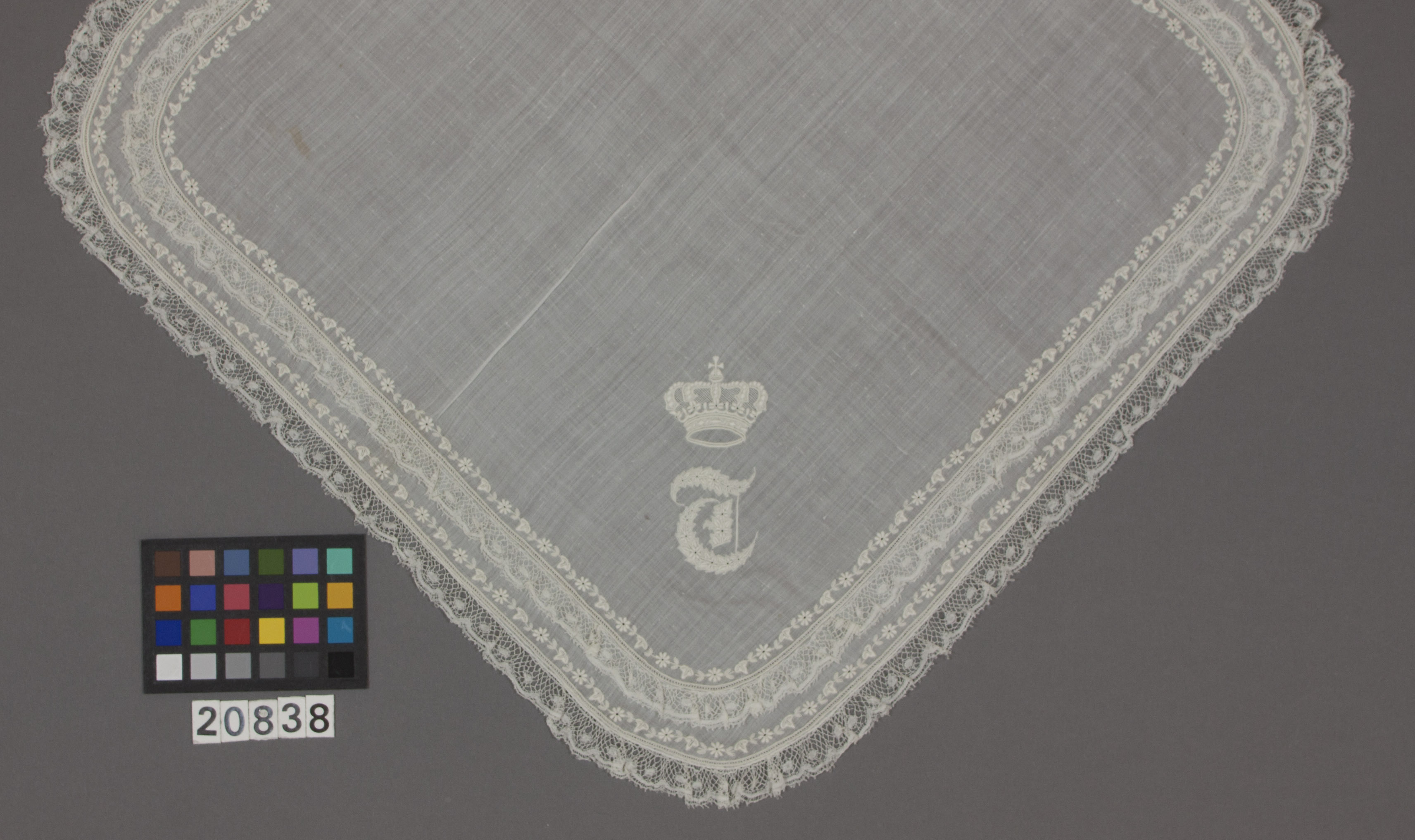 Kvadratisk näsduk av linne. En 11 mm bred bård av spets. Innanför denna en hålsöm samt ett broderat blomsterband. Samma mönster upprepas innanför ytterligare en 11 mm bred spets. I ena hörnet ett broderat monogram "T" under kunglig krona. Samtliga broderier är vita i platt- knut och hålsöm. Sidenbatist??Reen