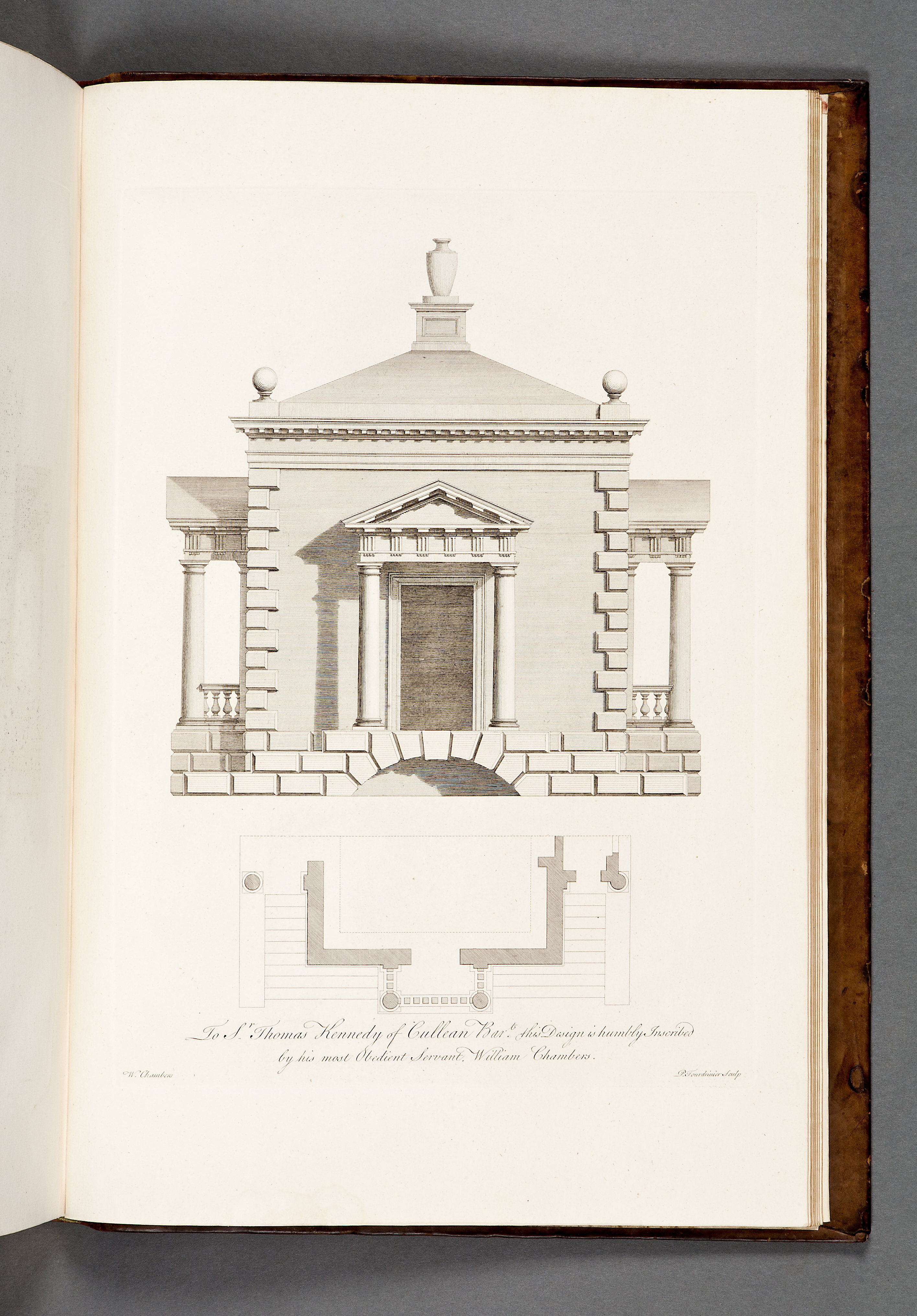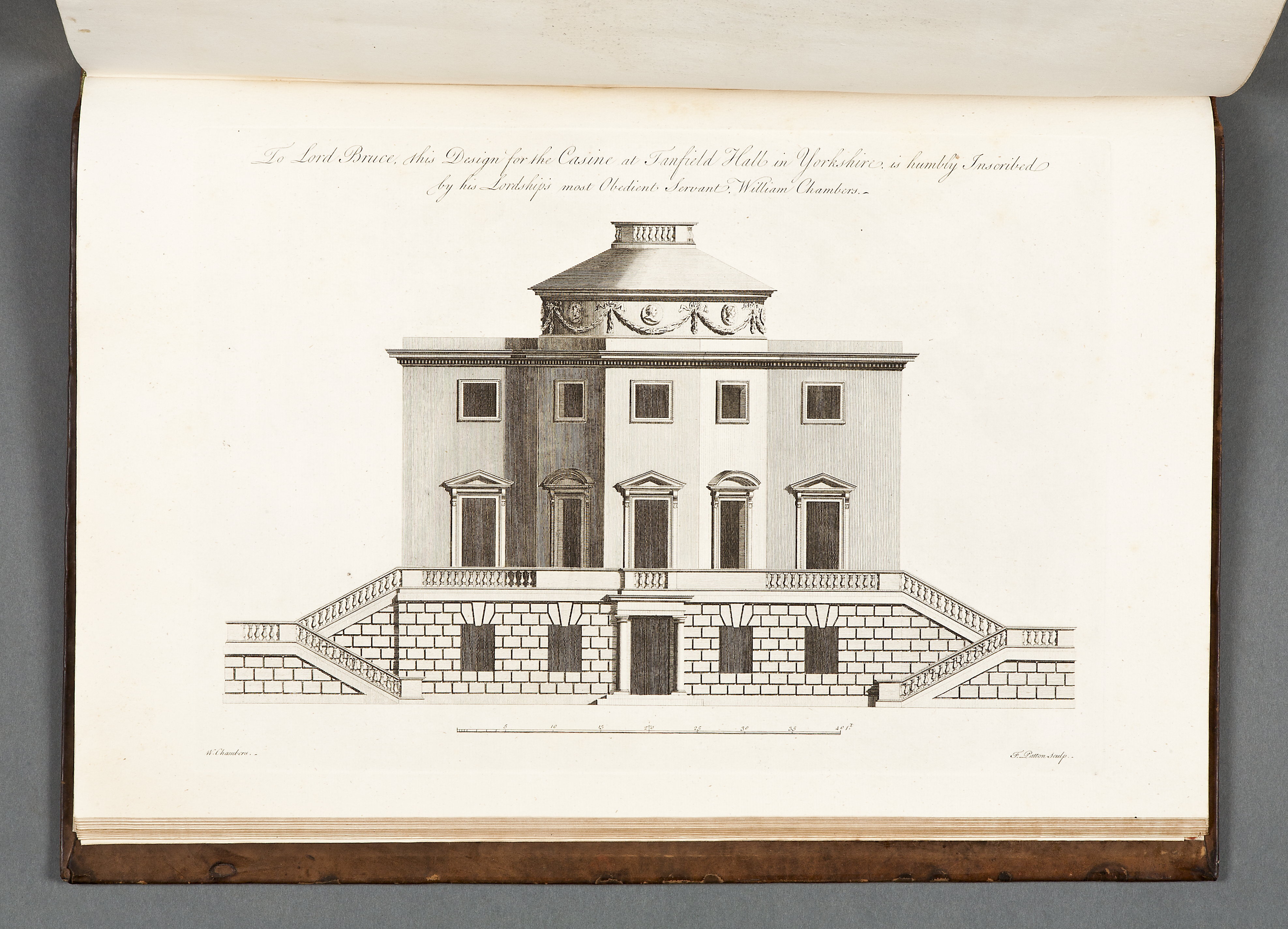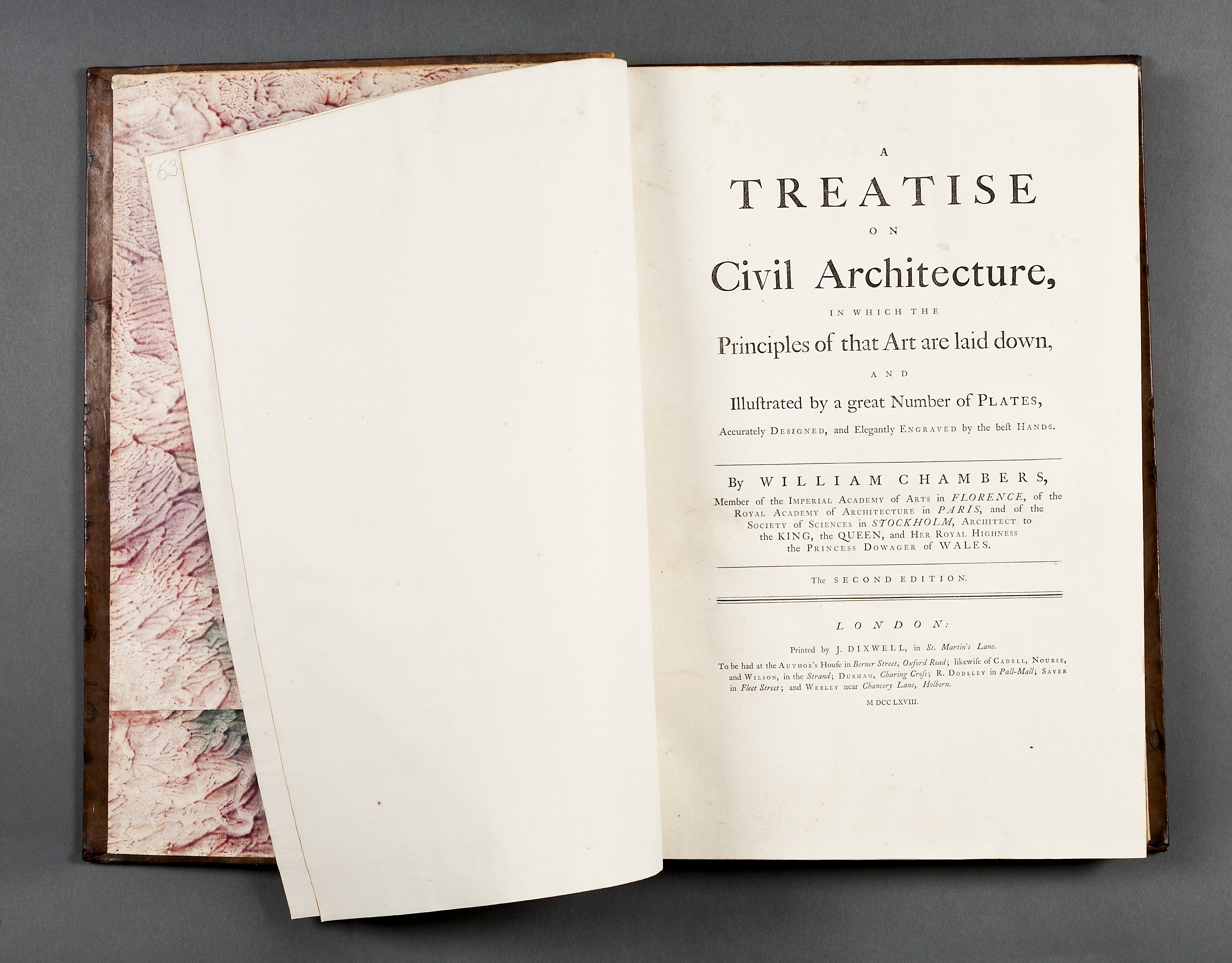 Sprängd kalv m. guldtr dekor rygg + guldtr. rambård pärmar. Marmorerat papper fp + bp ins. samt förs. r. + efters. v. Förgyllt snitt. William Chambers (1723-1796)