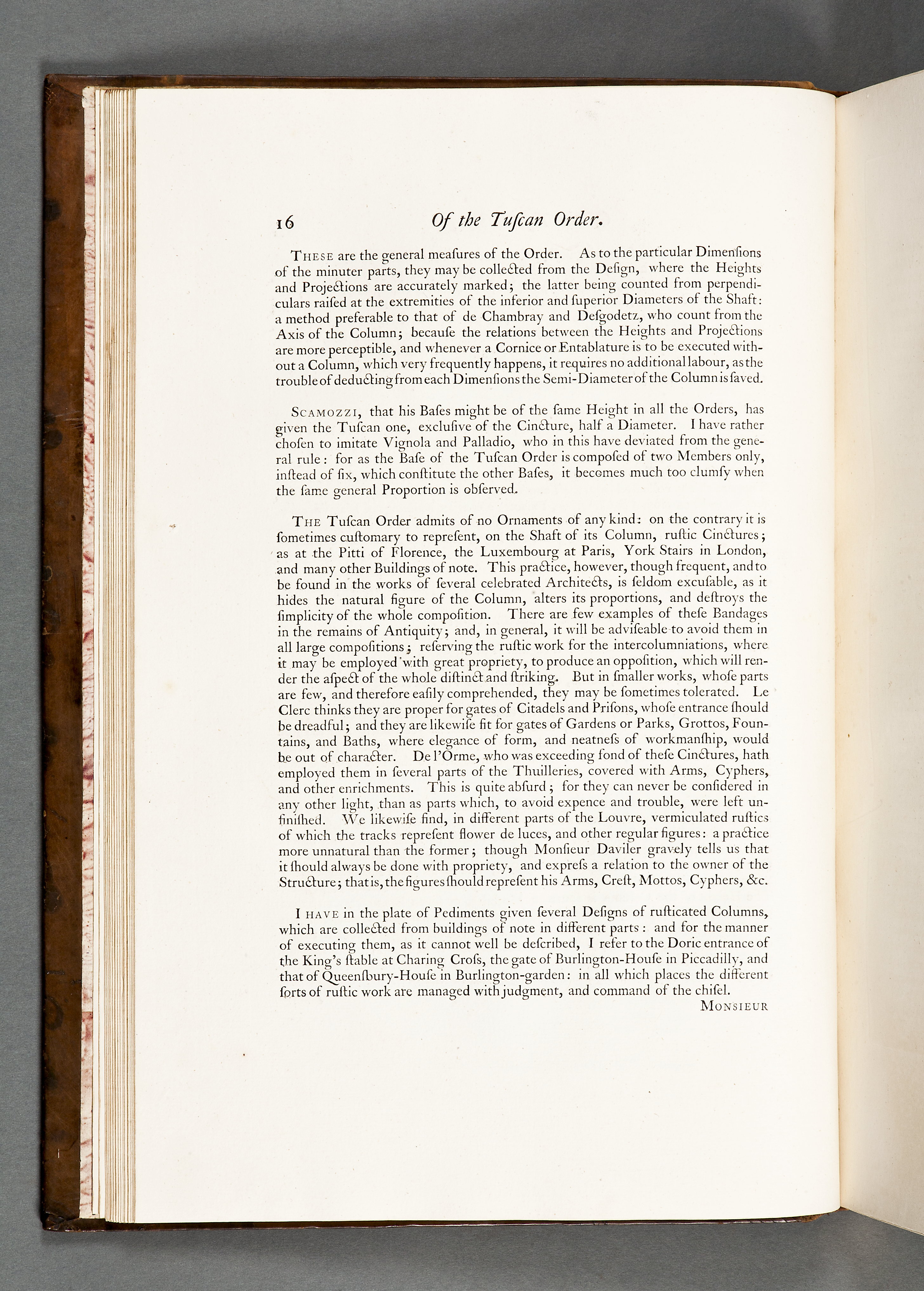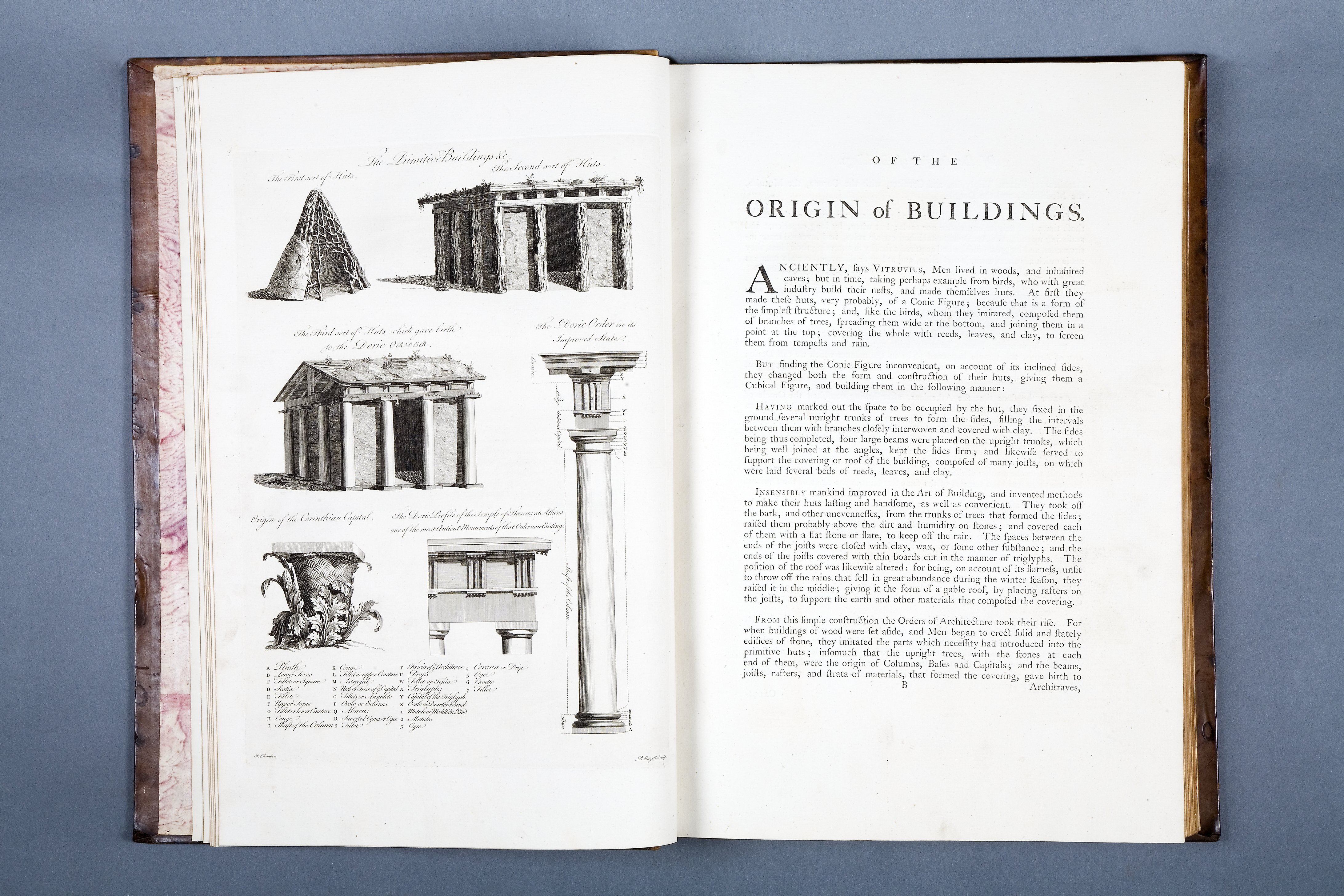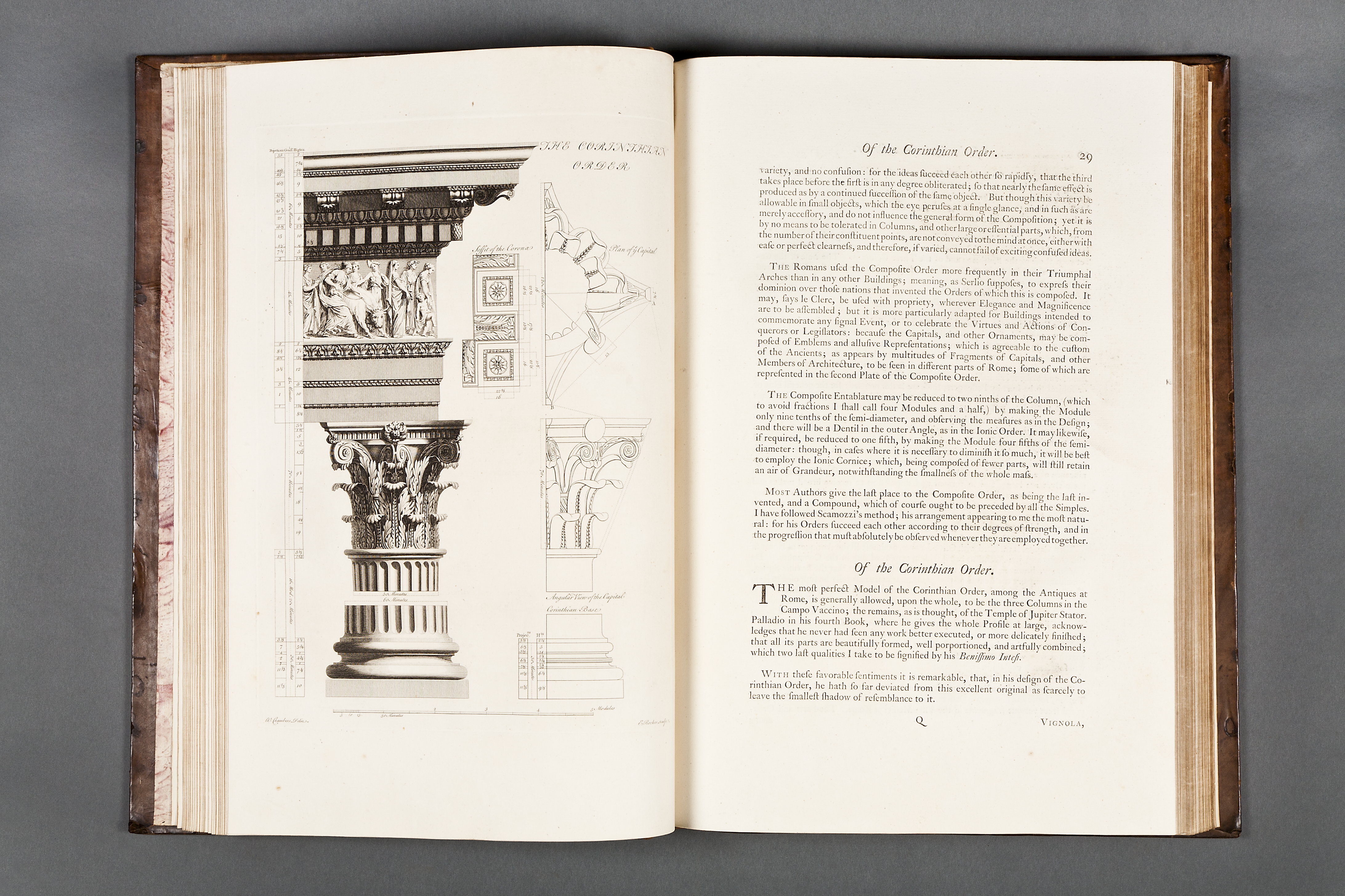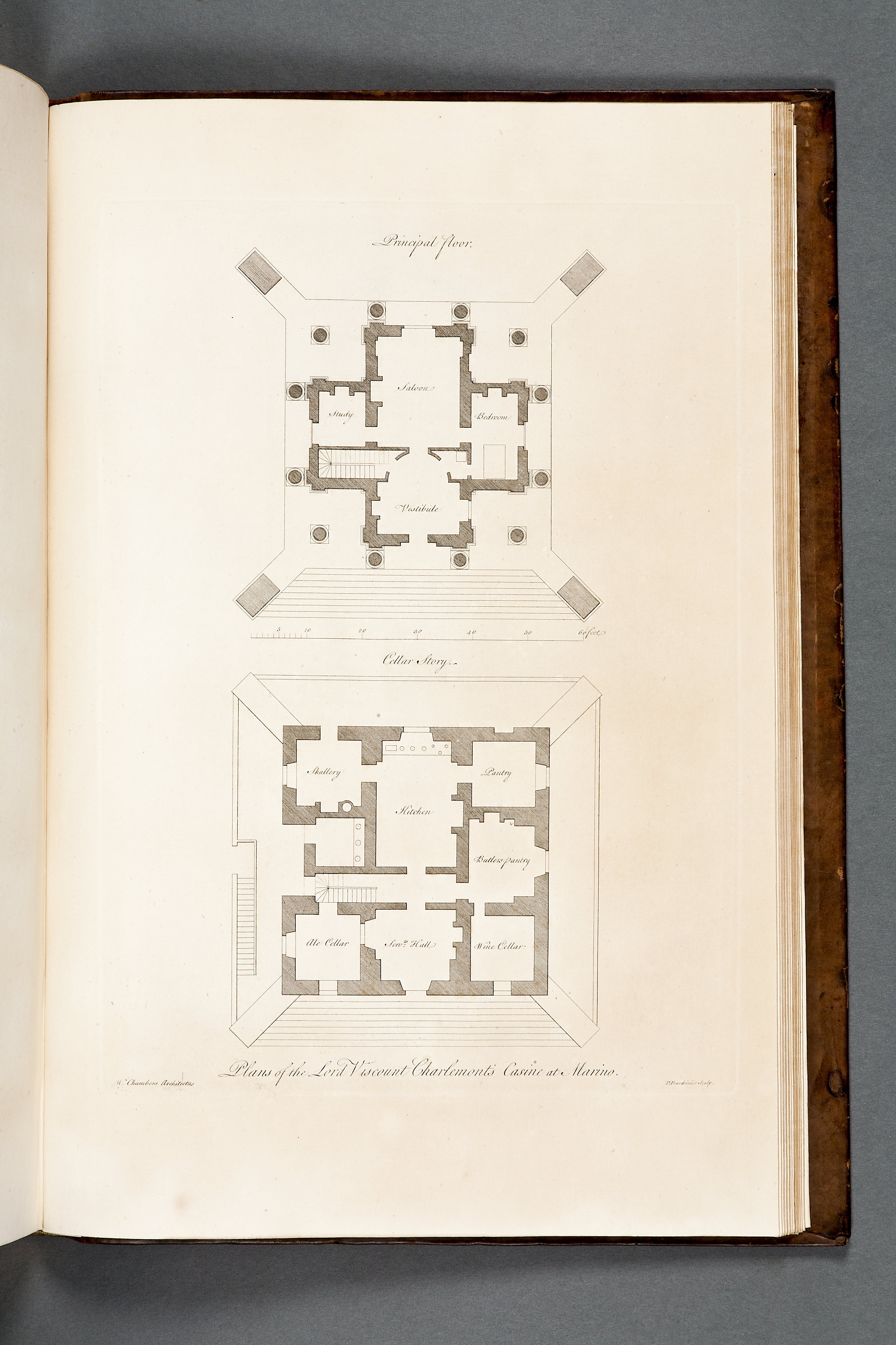Sprängd kalv m. guldtr dekor rygg + guldtr. rambård pärmar. Marmorerat papper fp + bp ins. samt förs. r. + efters. v. Förgyllt snitt. William Chambers (1723-1796)