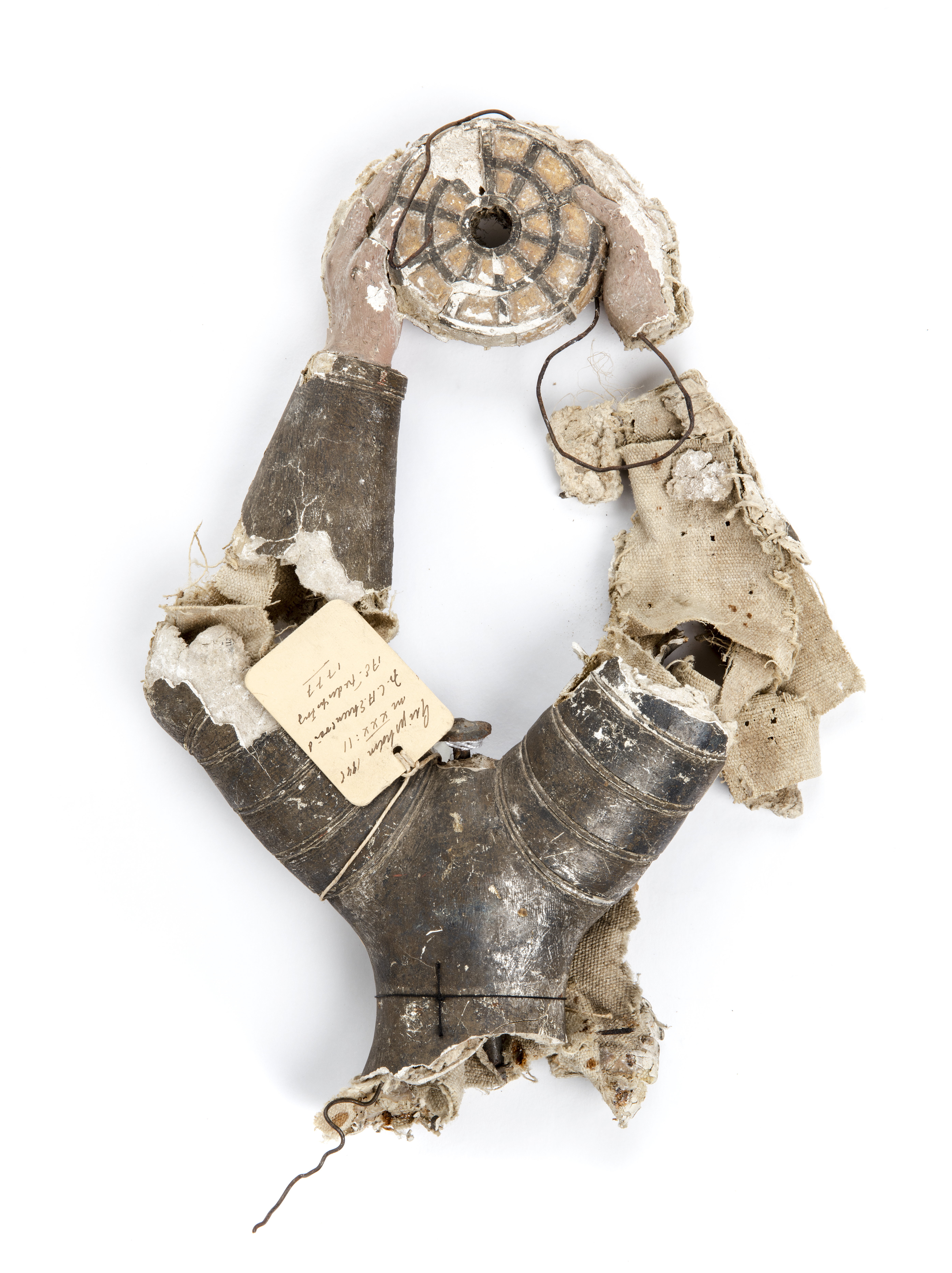 Av gips. Två försilvrade, beväpnade uppsträkta armar håller en förgylld granat, bandad med svarta linjer.