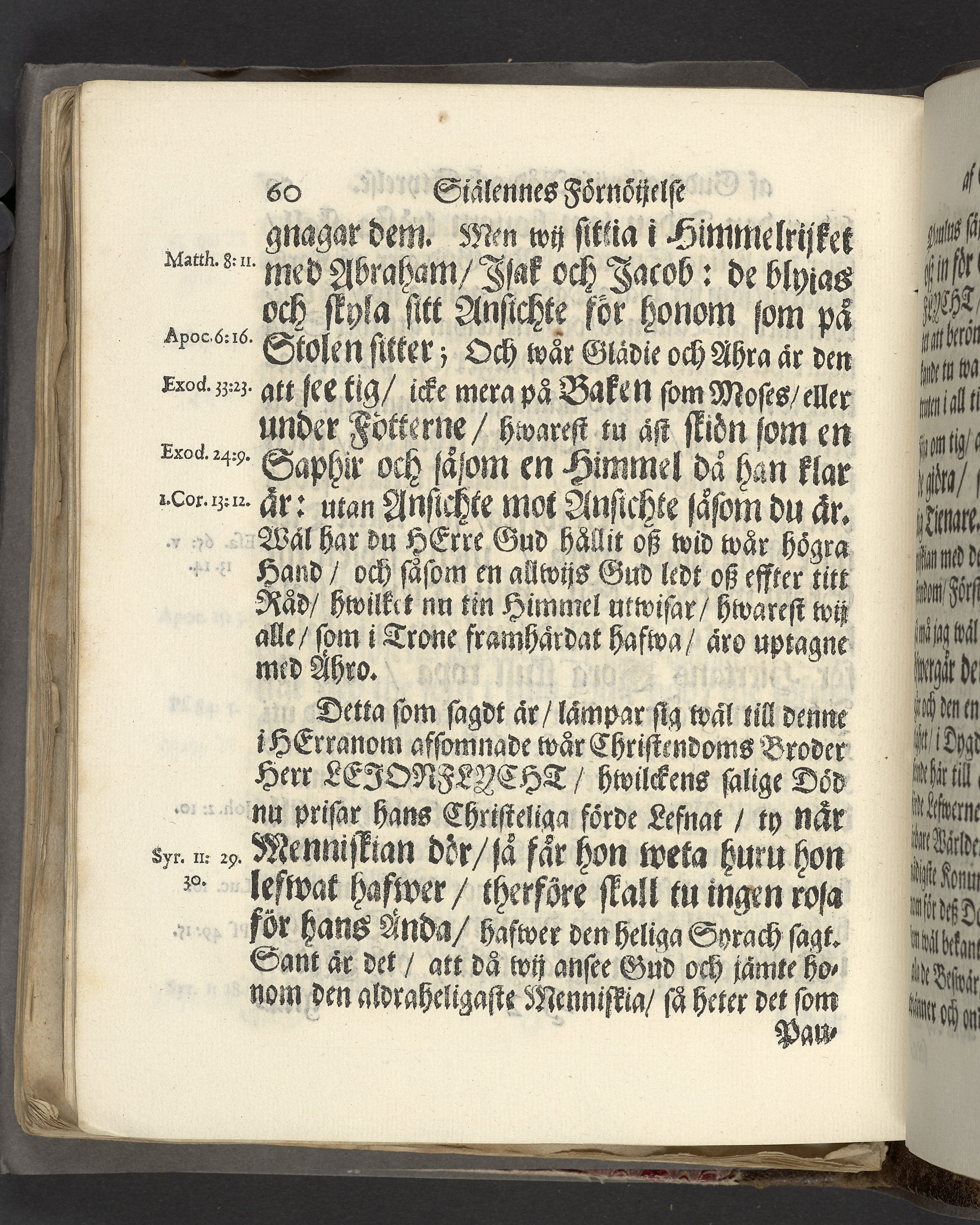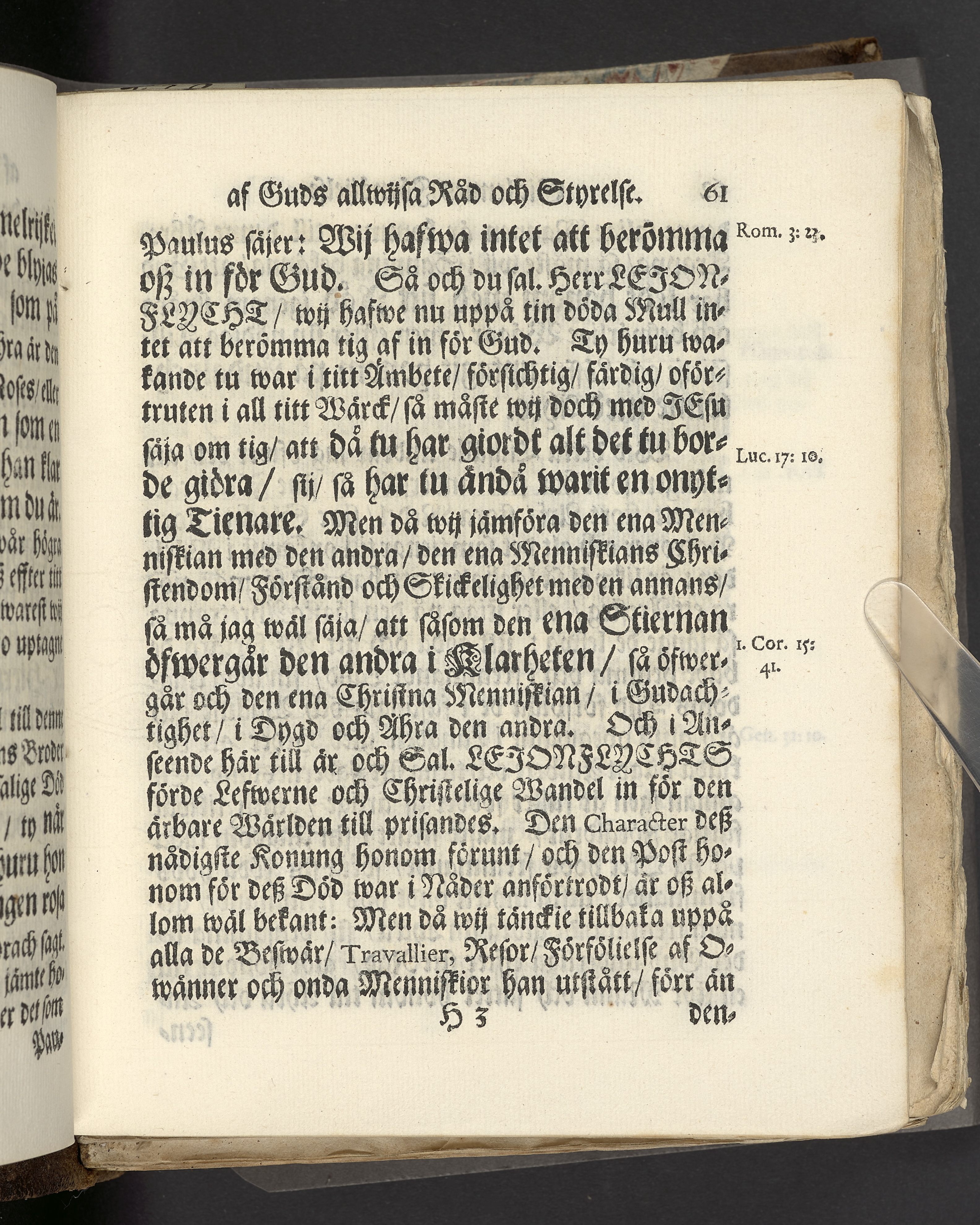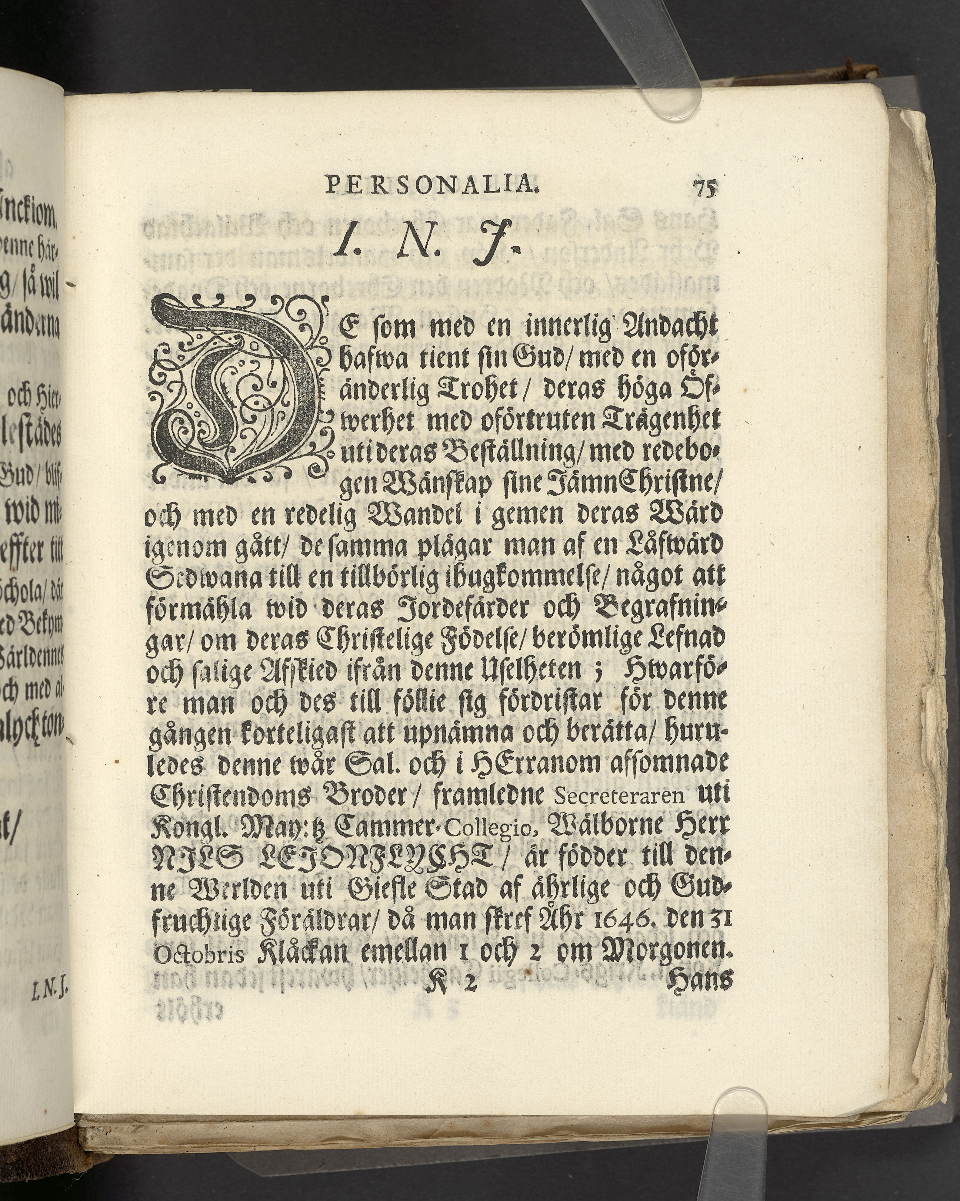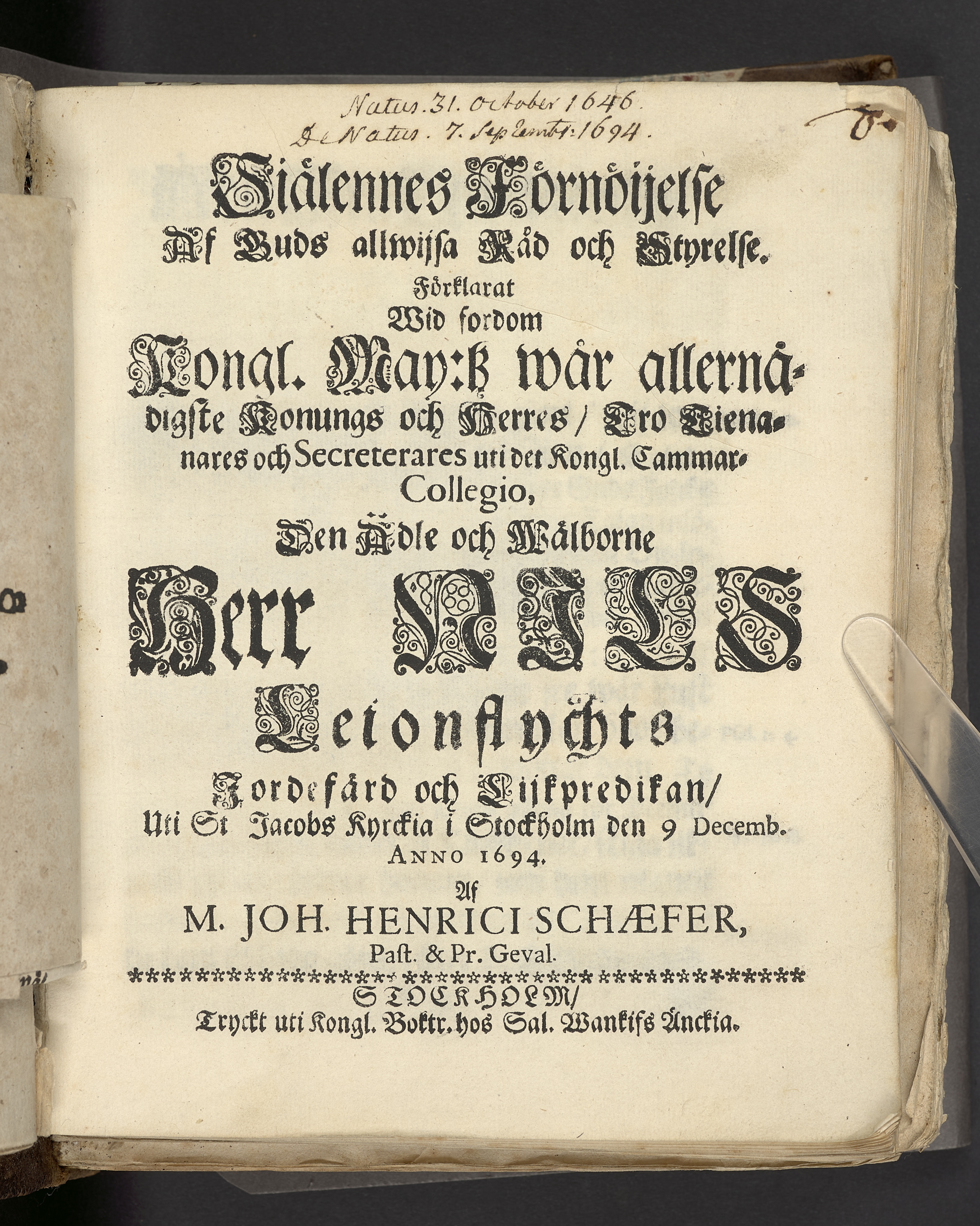 Siälennes förnöojelse af Guds allwisa råd och styrelse. Förklarat wid ... Herr Nils Leionflychts jordefärd och lijkpredikan, uti St. Jacobs kyrckia i Stockholm den 9 decemb. anno 1694. Af M. Joh. Henrici Schæfer, past. & pr. Geval. Stockholm, tryckt uti kongl. boktr. hos sal. Wankifs änckia.