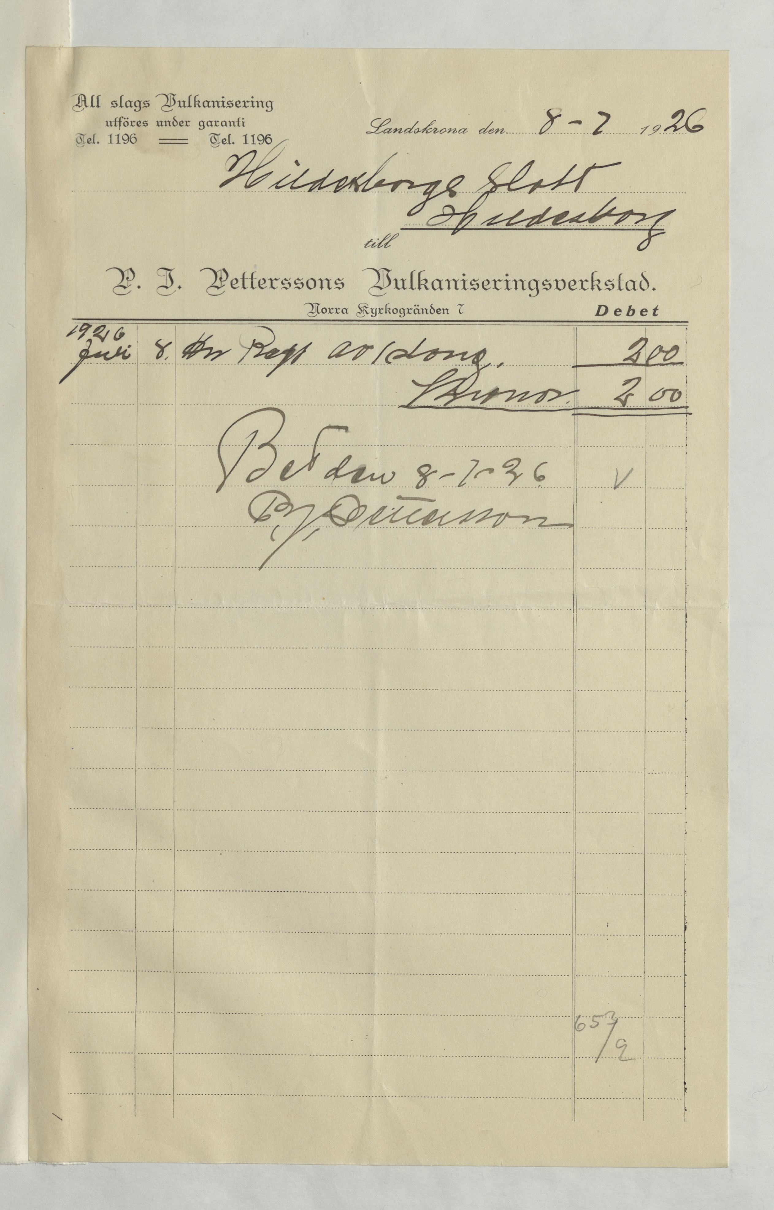 Kvitto från P.J. Petterssons Vulkaniseringsverkstad, på 2Kr. Stockholm 8 juli 1926.