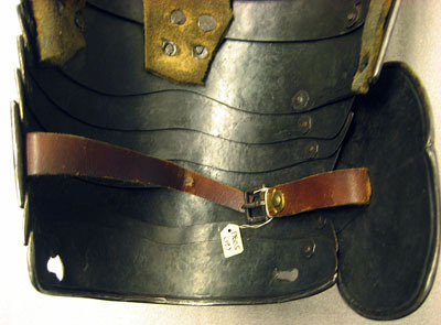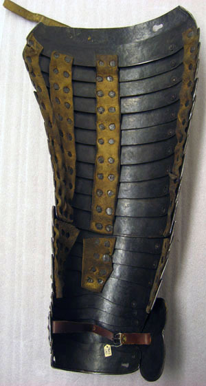 Övre del av 11 välvda skenor, nedåt minskande i bredd och svagt ökande djup. Översta skenans övre del svagt lutande inåt med åt utsidan ett nyckelhålsformat hakhål och mot insidan en nitad rem, l 190 mm, framför denna ett hål, diam 3 mm. Åt insidan en nitad läderem. I skenornas övre kant i mitten en utdragen låg spets. I sista skenan åt utsidan en vridbar tapp, i mitten en tapp och åt insidan en utstående nit.