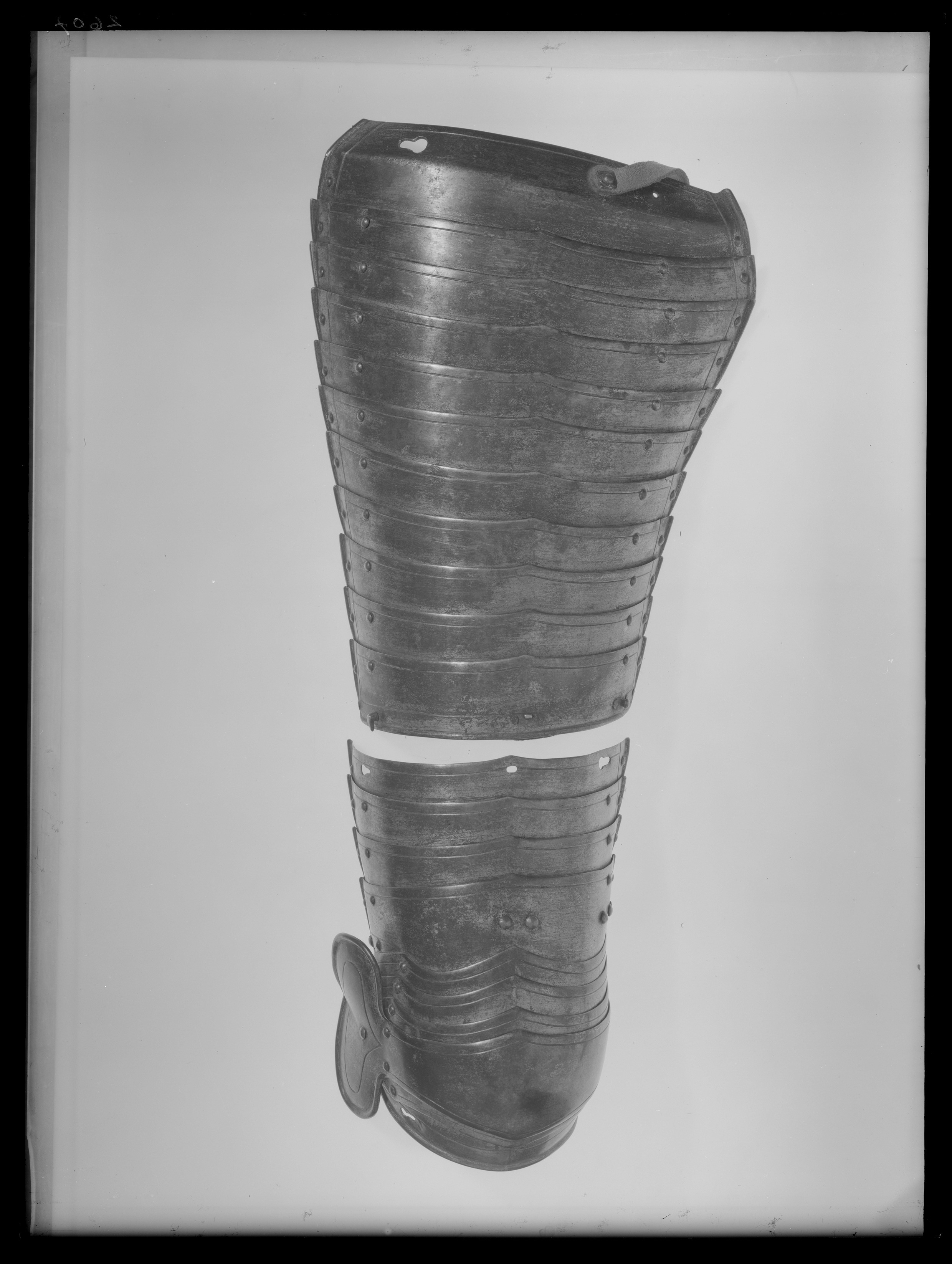 2:ne benskenor med fotbetäckning, hvardera i 12 delar och med 2:ne slöjor samt fastnitade sporrar med nedåtböjda halsar och taggiga klingor.