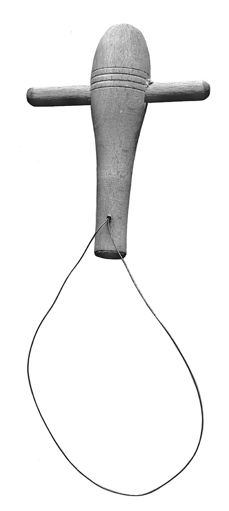 OSTKLYVARE Av ståltråd, med träskaft. Bestående av en smal ståltrådsögla med ändarna inträdda i ett genom skaftet gående hål och på motsatta sidan fästa med en liten spik. Skaft av rödbok, svarvat, långsträckt päronformigt, på den utsvällda änden fyra insvarvade ränder samt i dessa en genom skaftet gående pinne som fingerfäste. Skaft, längd: 13,3 cm. Pinne, längd: 10,3 cm.