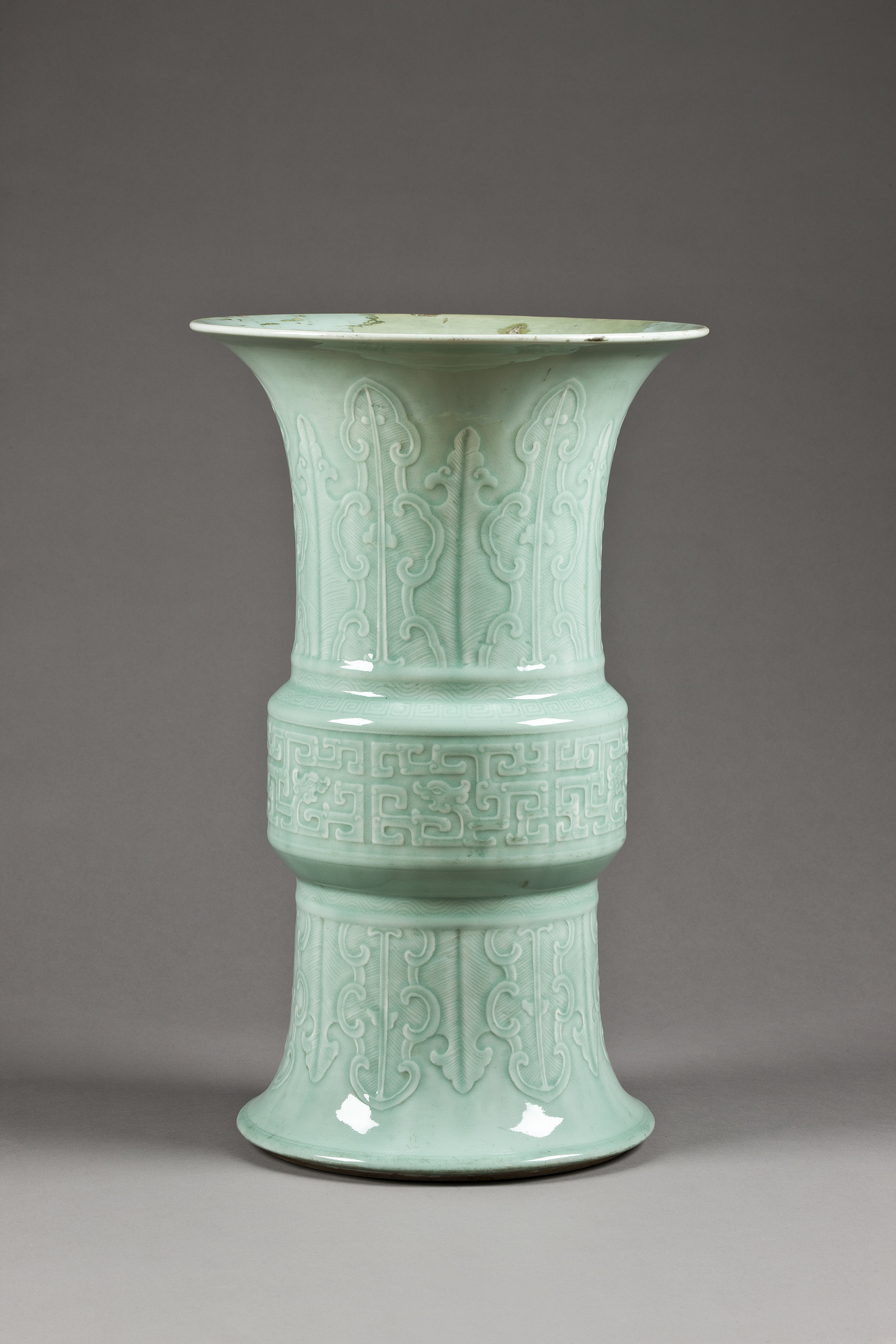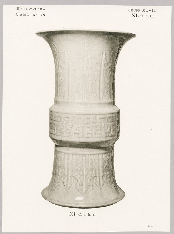 VAS. Cylindrisk med starkt utsvängd fot och mynningskant, kring mitten ett utskjutande band. Glasyren ljust grågrön. Dekor ristad och i låg relief. På mittbandet sex tätt sittande grupper drakslingor. Ovan och nedan bandet sammanhängande bladornering med ju-i-flikar. Inköpt hos Bukowskis konsthandel 1909. Pris 1.000 Kr.