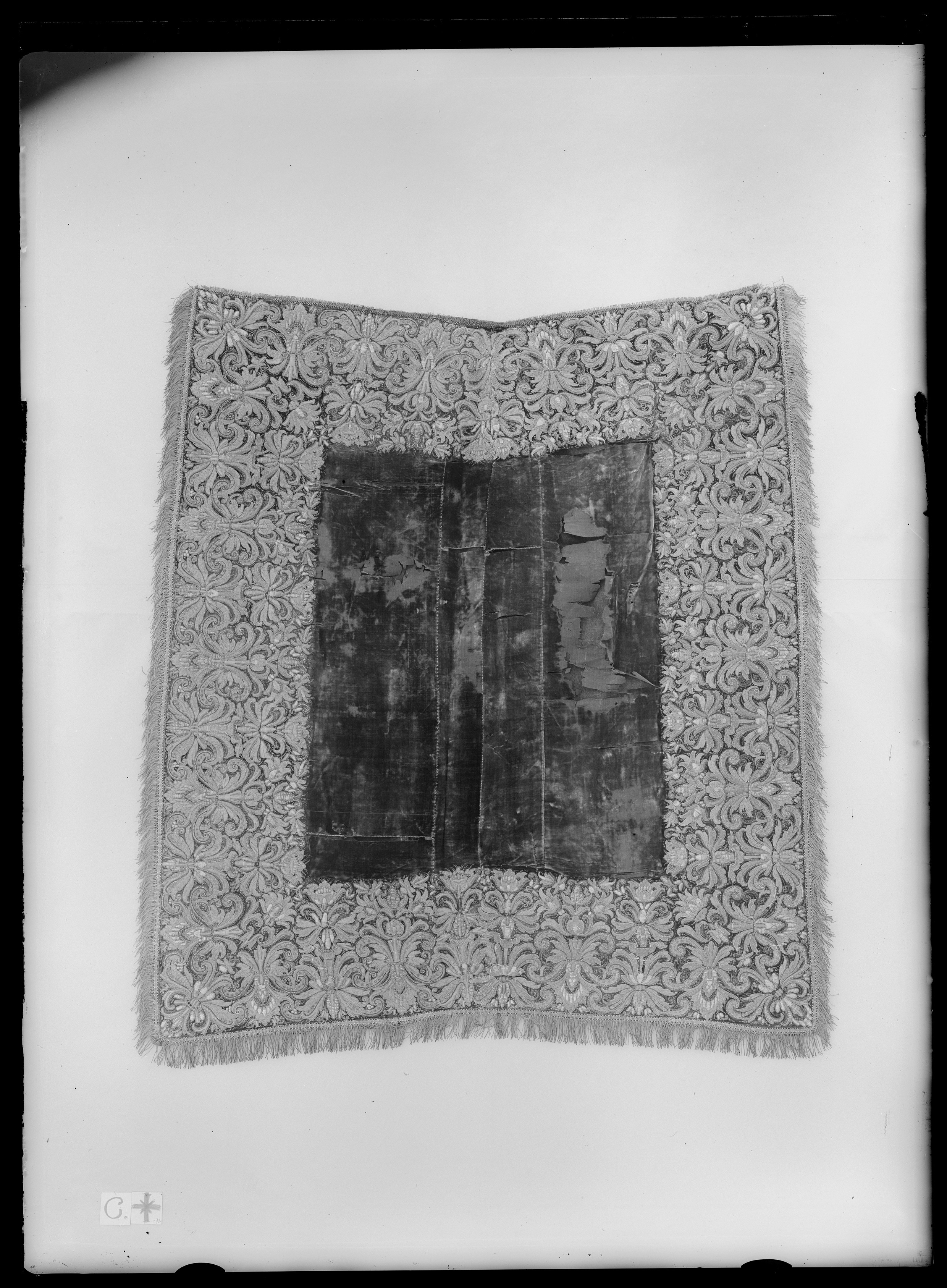 Bottentyg av blå skuren sammet vävd i kypert hopsytt på mitten. På vardera sidan om mittsömmen en kilformad remsa med smalare delen mot hästtäckets framkant som är svagt v-formad. Bård 260 mm bred längs alla kanter. Reliefbroderi med övervägande silvertråd men även svart och beige silke, i applikation. Mönstret utgående från kanterna med två omväxlande akantusmotiv och ett tredje diagonalt utgående från hörnen. Längs sidorna och nederkanten en 60 mm bred kavelfrans av silver varav 10 mm stad med två stycken 1,5 mm breda silverlan och svart och beige silke. Längs överkanten en 15 mm bred kavelfrans av silver med stad i svart och beige silke. Foder av blått ylle vävd i kypert, hopsytt längs mitten. Fem lädertampar med mässingsringar fastsydda längs bakre kanten.