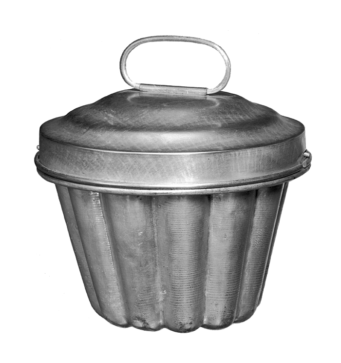 GLASSFORM med lock Av bleckplåt. Rund, omvänt konisk och vertikalt veckad, med stavformiga veck, varje veck på undersidan avslutat i en buckla, avspetsad snett inåt, bucklorna bildande en krans kring en liten plan botten; kring övre kanten en hög fals för locket, nedtill avslutad i en utstående stav med nedre kanten invikt mot vecken; på falsen två motstående nabbar, avsedda för urtagningar i locksargen. Höjd: 10,5 cm.; diameter: 14,5 cm. Lock: Lågt, kupigt, med utanpågående sarg, kring vars nedre kant en utstående stav, i denna två motstående rätvinkliga urtagningar för nabbarna i falsen; översidan med två koncentriska breda grunda kälar kring ett platt mittfält, på detta ett avlångt rundstavigt handtag, rörligt under en omvikt plåtflik. Höjd: 4,3 cm.; diameter14,5 cm.