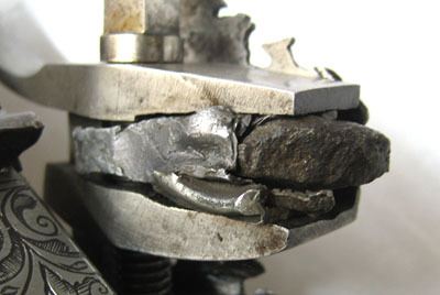 Gråaktig pyrit med grovt formad och mörkare spets. Infattad i mantel av flera tunna bitar gråaktig blyplåt.