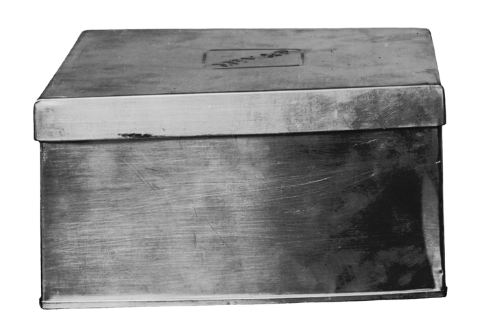 LÅDA Av bleckplåt. Rektangulär, nästan kvadratisk, med trycklock. I två diagonalt motsatta hörn en fals; övre kanten med en grov stavformig invikning; botten med en på utsidorna uppvikt smal fals. Lock plant, med utanpågående nedvikt kant. Höjd: 11,8 cm.; längd: 23,4 cm.; bredd 21,7 cm.
