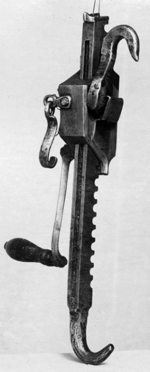 Helt av stål. Hjulhuset med täckplatta med yttäckande, etsad ornering av rankor, löpande hundar och vargar, allt mot en prickmönstrad bakgrund. Vid hjulhusets ena kant en lång, smal vev med fyrsidigt tvärsnitt, böjd i ytteränden med balusterformigt, svarvat handtag av trä med ringformig mässingsskoning vid inre delen. På hjulhusets ena sida en stor krok samt på undersidan en ögla med en rörlig hake av stål. Tandstången med en krok i ena änden och årtalet 1577 inslaget.