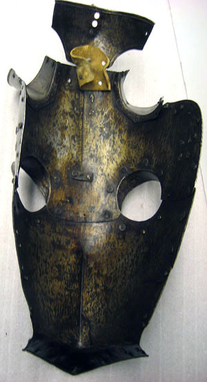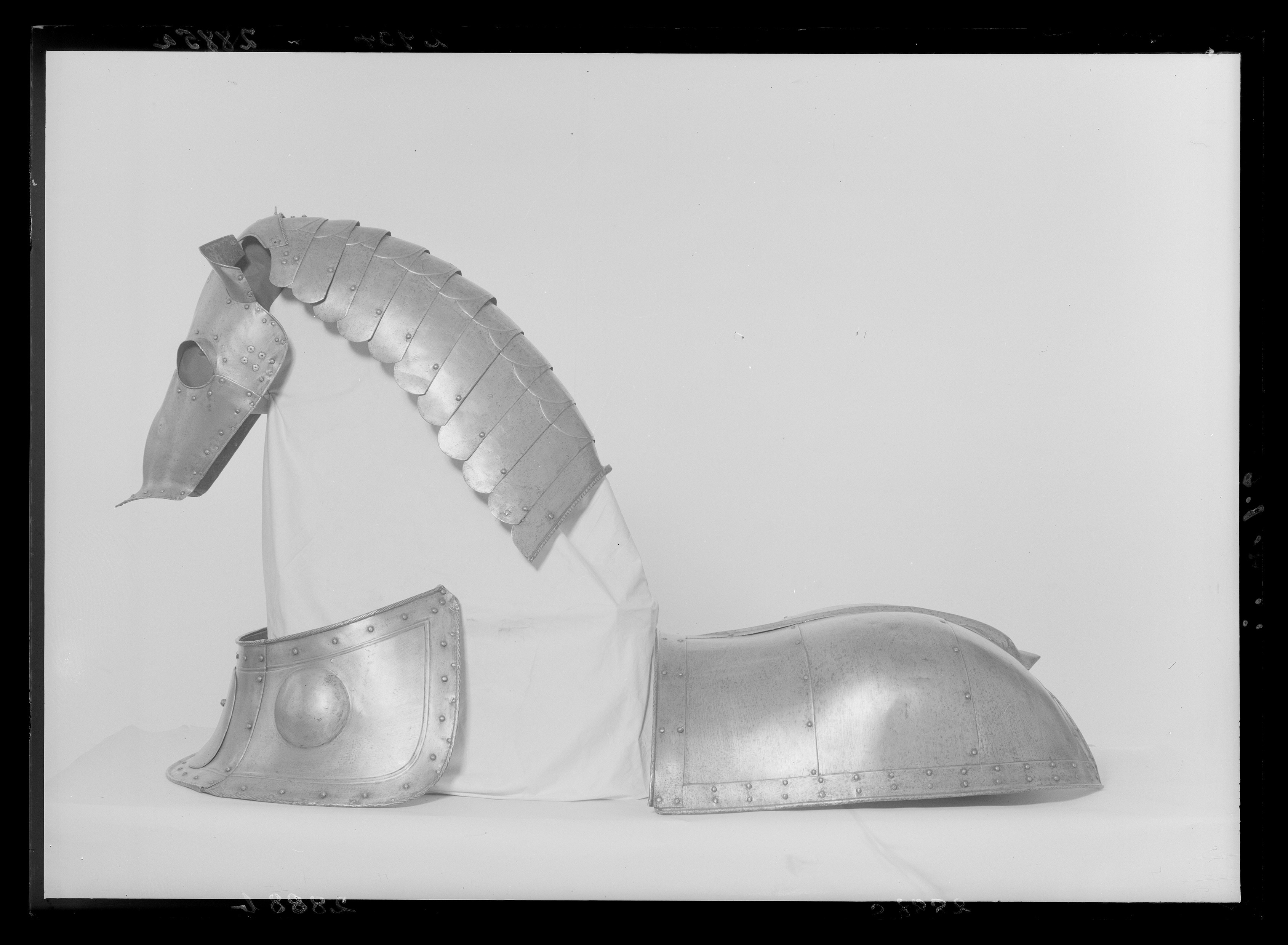 Driven stålplåt med blankpolerad utsida. Sammanlagt fem delar fästade i varandra med stålnintar, omväxlande blanka och överdragna med mässingsplåt. Pannplåt med driven längsgående mittås, mittpartiet plant. Övre kanten rundad. Rundade urtagningar för öronen med nitade plåtar, välvda med mittås och riktade uppåt och utåt, högre i framkant. Rundade urtagningar för ögonen med övre kanten driven till en skärm, bredast över mitten, 35 mm, med avsmalnande sidor. Tillsammans med urtagningar i undre stycket bildar dessa två hål för ögonen. Nertill över mulen en svagt utåt driven krage, b 60 mm, framtill välvd och spetsig. Alla yttre kanter omvikta, rundsmidda och med filade snedställda linjer. Upptill över nacken en med sämskinnsband fäst plåt. Välvd med i främre kanterna rundade urtagningar. Upptill tre hål i rad, diam 5 mm, och i var sida ett hål, diam 3 mm. Vid varje kind och upptill mellan öronen fyra hål ställda i kvadrat med blomformig skoning, för plymhållare. I pannans mitt cirkulärt hål, diam 6 mm, med på insidan förstärkning av rektangulär plåtbit, för spets.