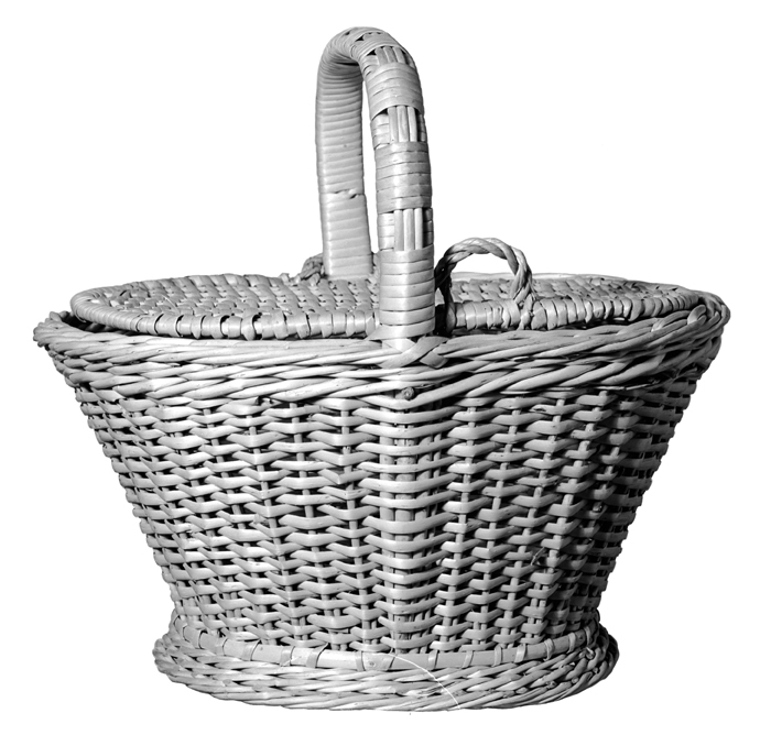 KORG. Av vide, ofärgat. Oval, starkt hopdragen nedåt samt med lock och handtag. Stommen med okluvna stakar samt inslag av skenor, flätade i sicksack mellan stakarna; tillslag (slutdrag) sammanvridet av stakarnas omvikta överändar; nedanför tillslaget flera sammanvridna spön, s. k. kim; fot låg, snett utstående, liknande tillslaget, ovanför foten en halvstavig list, glest fastsydd med en skena. Botten med radiellt ställda käppar, på dessa en runtom gående flätning av breda skenor. Lock platt, med rundstavig bygel, inom denna längdgående spröt i form av stakar, varpå en flätning som i korgstommen; vid ena kanten en s. k. omlöpare, vid den motsatta ett s. k. uppdrag, båda av sammanvridna skenor. Handtag (grepe) bågformigt och flackstavigt, tätt lindat med en skena, på utsidan tre längdgående, intill varandra liggande skenor med lindningen gående omväxlande över och under desamma. Höjd med handtag: 31 cm., utan handtag: 18 cm.; längd: 33,5 cm.; bredd: 28 cm. Fot, längd: 23 cm.; bredd: 19 cm. t.