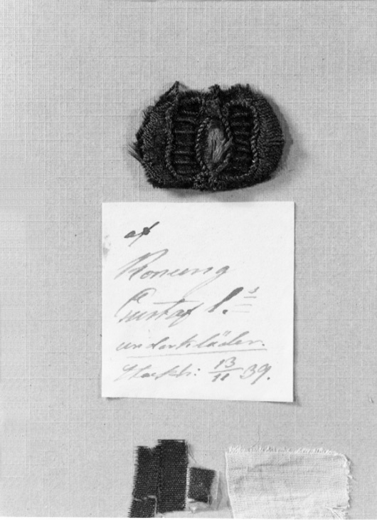 Ovalt stycke svart siden med atlasyta och däröver galler och kantning av svarta silketrådar och med fjärilsformat spetsovalt, svagt välvt mittparti. Tygstycket klistrat på tavlan. Därnedanför vit pappersetikett med bläckpåskrift: "af // Konung Gustaf I.s // underkläder // Stockh. 13-11 39."