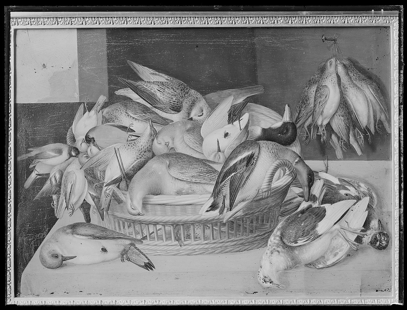 Stor flätad korg på bord med röd duk. Korgen fylld med döda fåglar (talgoxe, domherre, gulsparv, bofink el. möjl. tallbit, grönfink, gråsparv, domherre, taltrast, enkelbeckasin, ljunghare i höstdräkt, rapphöna (höna), rapphöna (tupp), kärrsnäppa, i höstdräkt, gräsand, kricka.) På väggen hänger ett knippe sånglärkor. På bordet ligger en gröngöling el. gråspett samt två tamduvor. Till vänster fönsterutsikt, spindelväv och spindel. Sign i nedre högra hörnet: "PB". Förgylld empireram. Ramlistens bredd 100 mm. På ramen skrivet med bläck "Målad av Frankfurtermästaren Peter Benoit 1613-31".