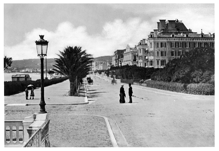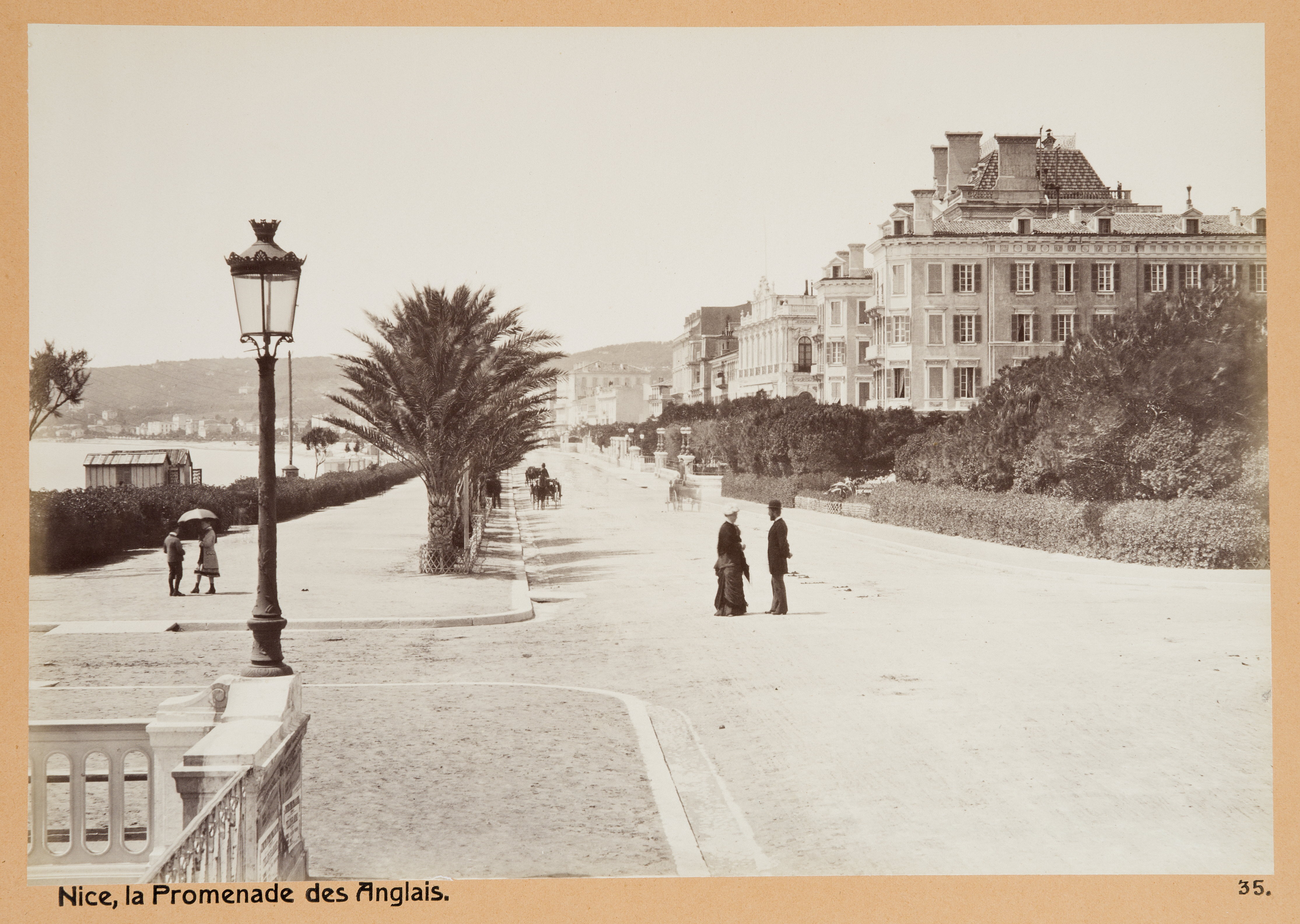 Promenade des Anglais i Nice, Frankrike. Inköpta av Wilhelmina von Hallwyl, f. Kempe, i Turin, Genua, San Remo, Cannes, Marseilles, Nîmes, Nizza, Menton, Spezia, Pisa, Florens, Bologna, Venedig, Verona, Milano, Pallanza, Lugano, Bellagio och Bad Sulz vid hennes vistelse å nämnda orter tillsammans med sin make, Walther von Hallwyl, dottern Irma samt fröken Ida Uhse under deras resa genom Rivieran och norra Italien samt åter öfver Schweiz och Tyskland 20 September 1880 - 20 Juni 1881. Förestående uppgifter lämnade med ledning af fröken Ida Uhses Reseanteckningar.
