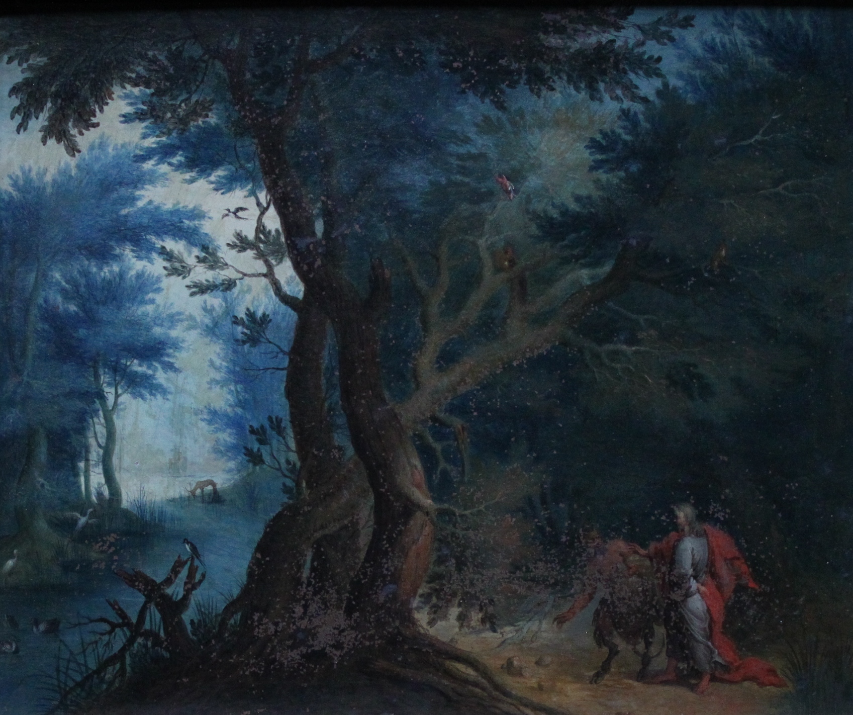 Kristus och Satan. Landskap i brunt , grönt och blått , t .v. vatten med änder , hägrar, drickande hjort . I mitten träd. Enl. 1845 års inv. : " Säg att dessa stenar varda bröd ", Lukas 4 kap:3. Förgylld rikt profilerad fururam med pastellage, på baksidan skrivet med blyerts : "F" samt ristat "4". Ramlistens bredd 100 mm. Signerad A.T : " Orginale di Rol : Savery " ( 1576- 1639 ).