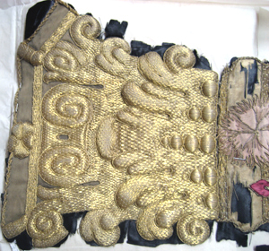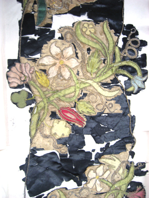 Långsmalt gardinfragment föreställande en kolonn med ett korintiskt kapitäll broderat i relief med förgylld metalltråd. Fragmentet har ett söndrigt bottentyg av svart sidenatlas. Det pryds av olika slags blommor broderade med siden och silketråd i många olika färger. Inslag av förgylld metalltråd utgör detaljer i broderiet.