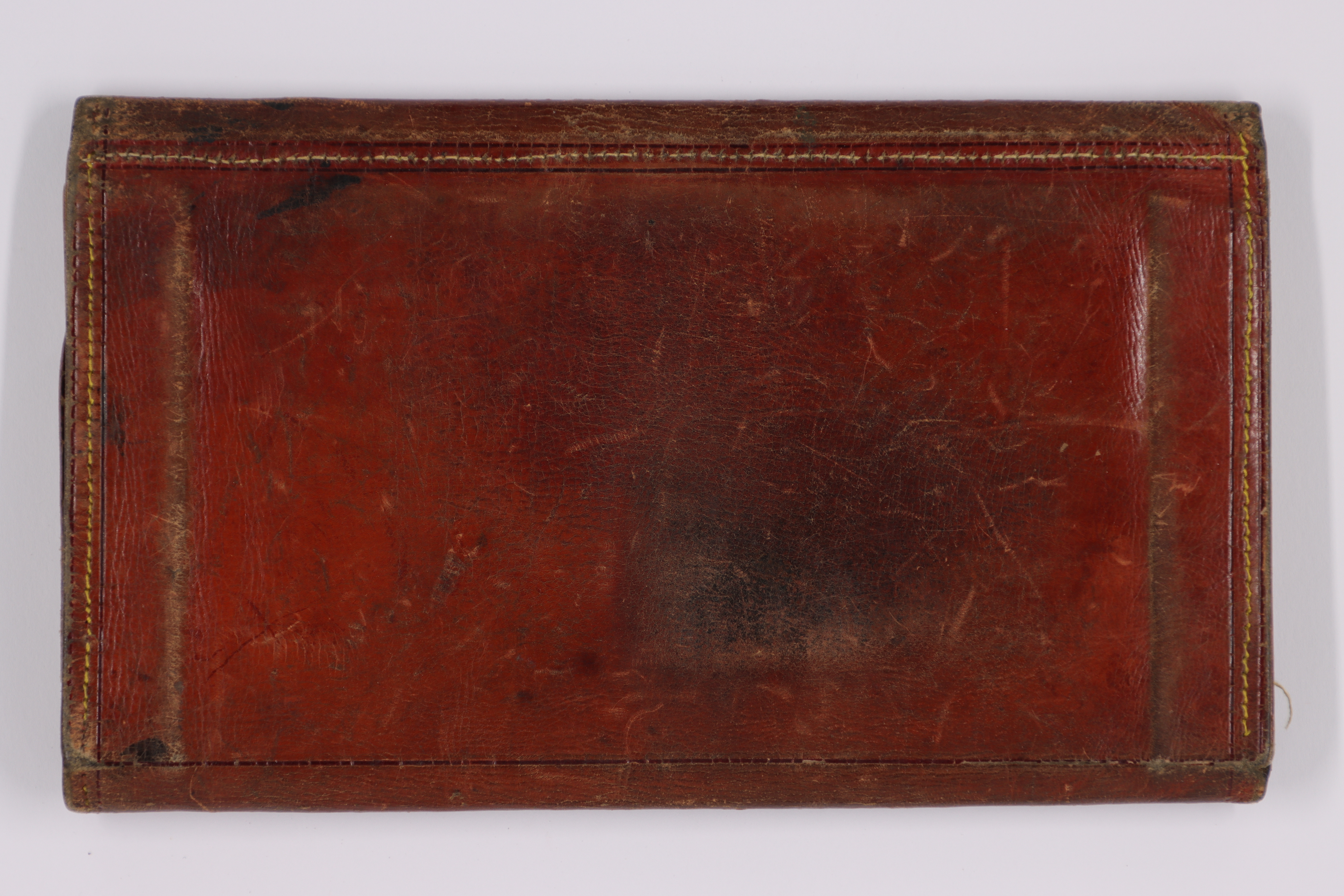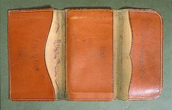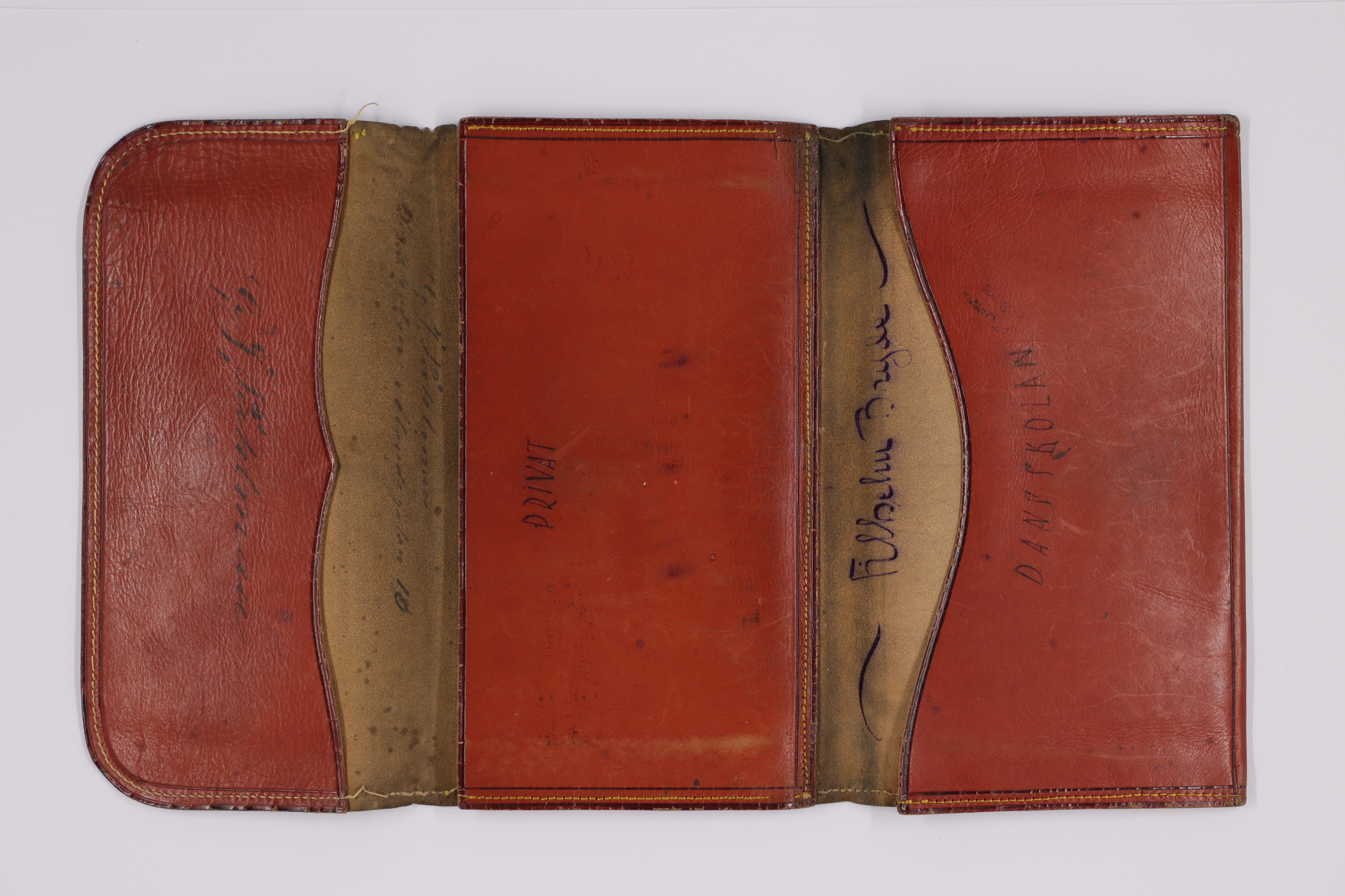 Plånbok av rödbrunt läder med ljusa sömmar. På insidan handskriven text i bläck. På en ficka G.(?) J. Påhlman och där ovanför en adress som ser ut som Ålandsgatan 10. På mittenfacket texten "PRIVAT". Ovanför den andra fickan ett namn som ser ut som Filhelm Bryde och på fickan texten "DANSSKOLAN".