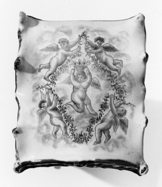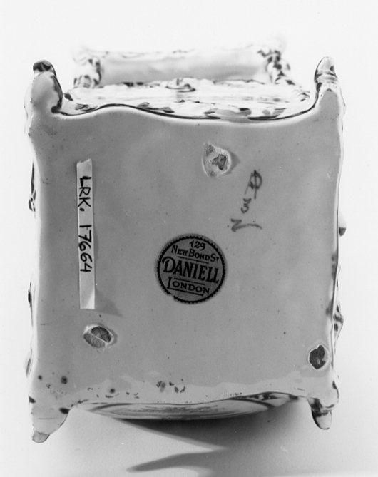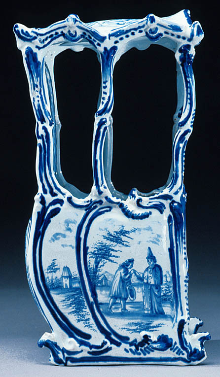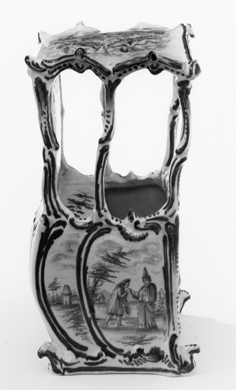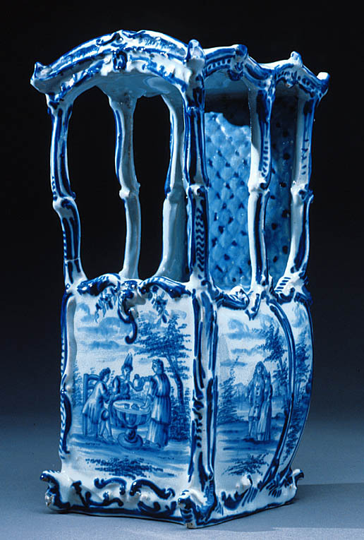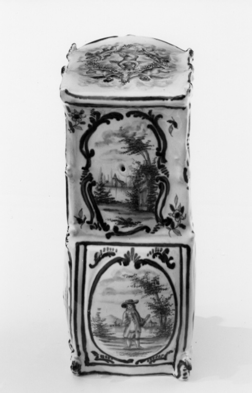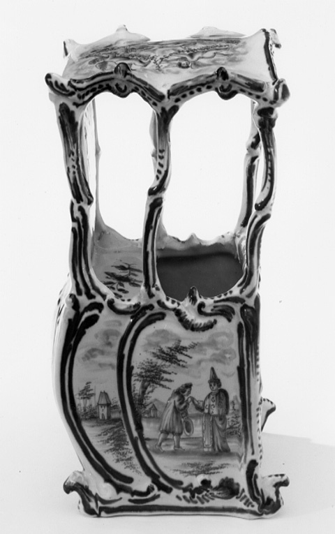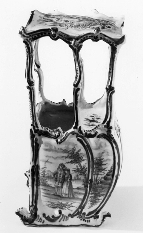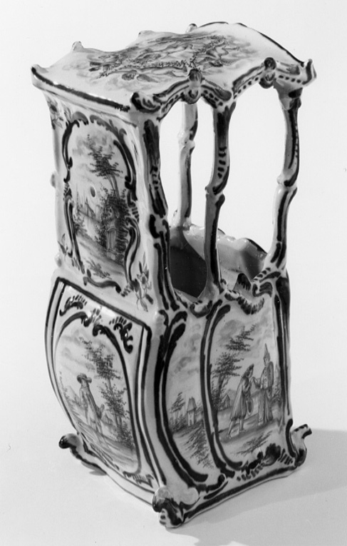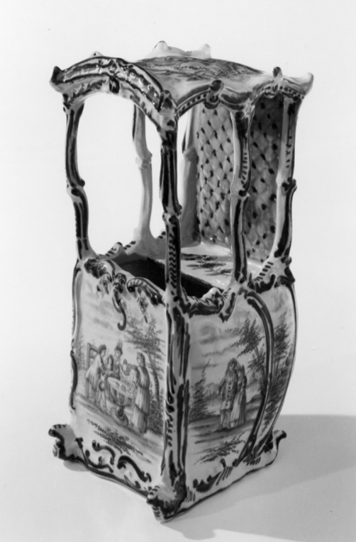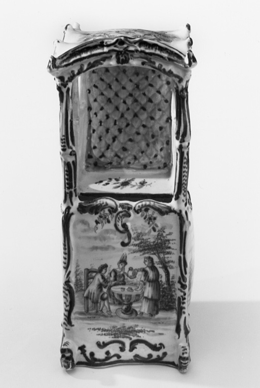 Bärstol med välvt tak, fem fönsteröppningar med bågformig avslutning upptill, ett framtill och två på sidorna. Sluten bakvägg med dekor invändigt, efterliknande matelassé. Sittbänk i fönsterhöjd, blomdekor. Bukiga väggar. Omramningarna har dekor i låg relief. Bottenfärgen är svagt blåtonad. Målad dekor i kraftigare blå glaysyr på ramverket i form av rankor och rocailler. På sidorna landskapsbilder med figurscener, utförda med finare pensel. På "dörren" två personer som serveras dryck, troligen té av en tredje person. På sidorna två par, handkyss på h. sida. På baksidan en ensam man, därovanför ett landskap med en skulpturbyst. På taket fem amoriner med blomsterkorg och girlanger. Signatur i botten: AP (ligatur) 3 z (?)