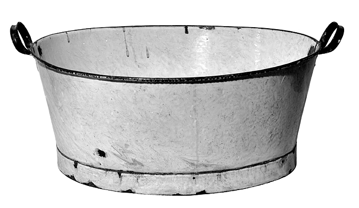 BALJA (tvätt-) Av vitemaljerad stålplåt; emaljen gråspräcklig. Oval, avsmalnande nedåt, med påsatt fotkant samt två handtag. Baljan av två stycken, hopsatta med en fals i vardera änden; fotkanten av plåt, med invikt underkant samt fäst vid baljan med sex nitar; kring brädden en utstående stav i blått. Handtag i blått, liggande ovala, av rännformig skena med ändarna platt utsmidda och fästa vardera med två nitar. Höjd: 24 cm.; längd: 59,3 cm.; bredd: 50,5 cm.