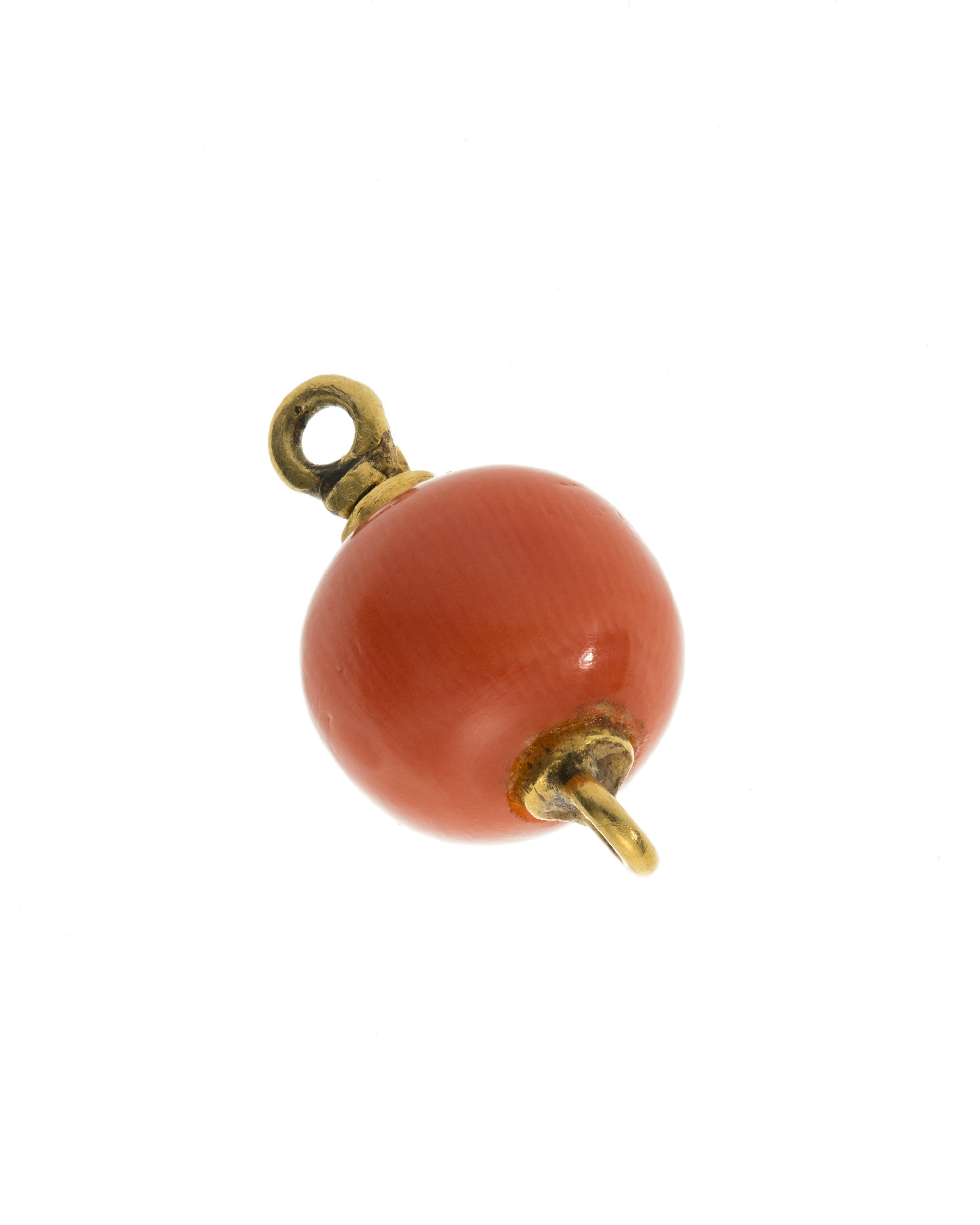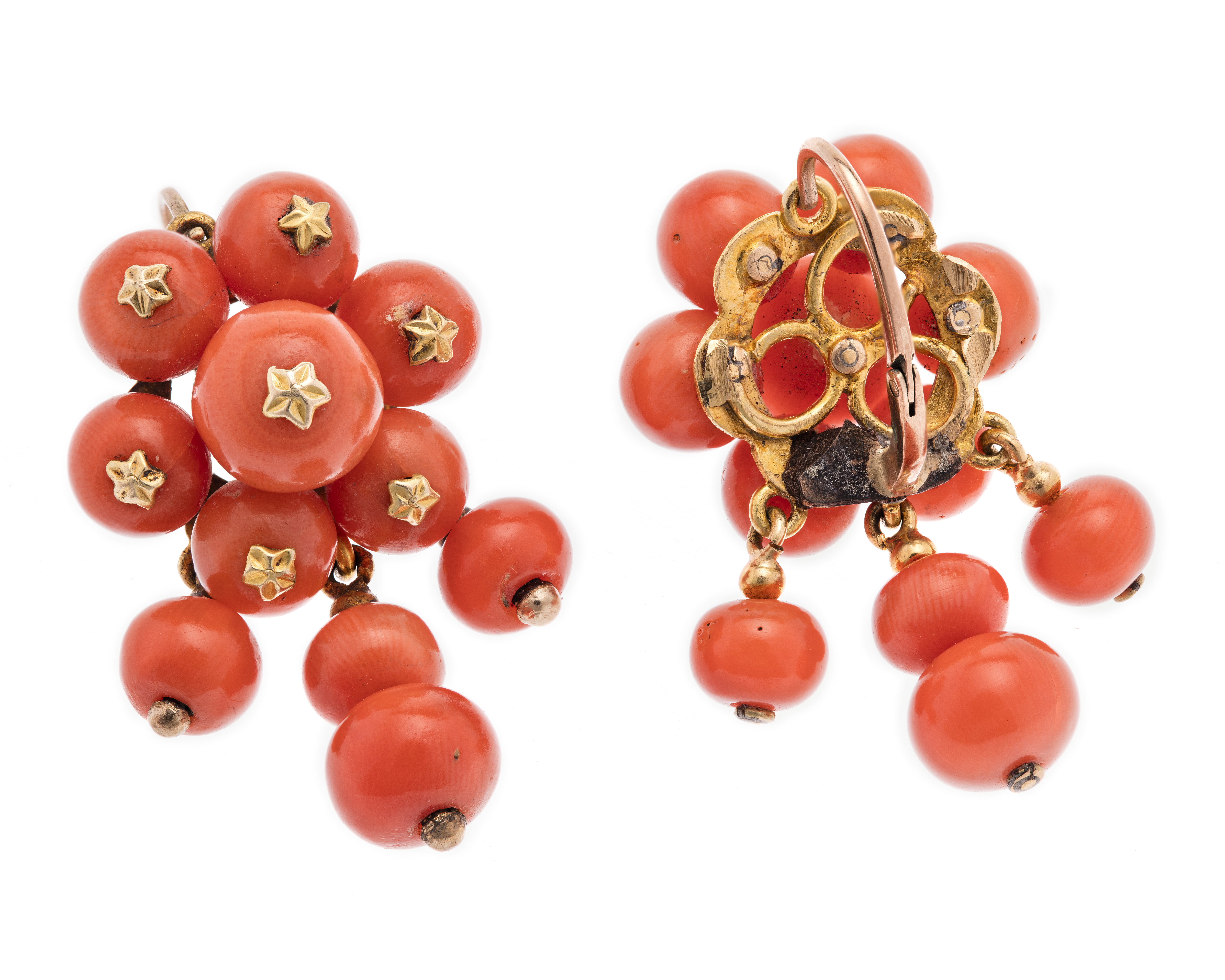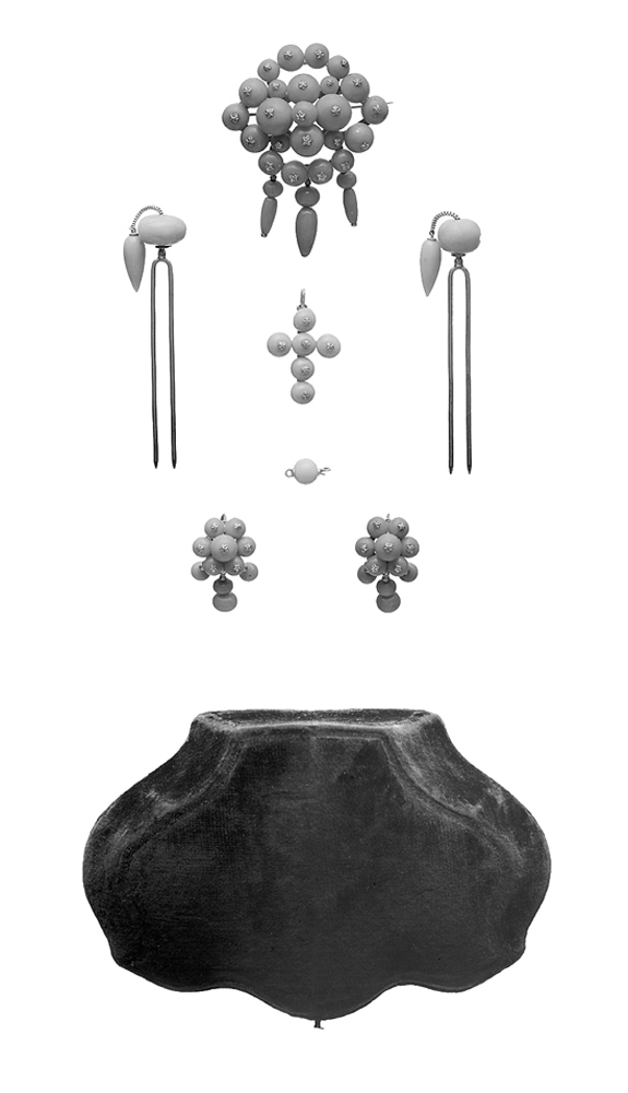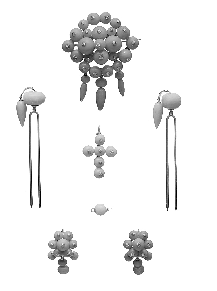 - Bestående af brosch, hängsmycke, ett lås, två hårnålar samt ett par örhängen. Af blekröda korallpärlor och förgylldt silfver. Brosch: Liggande oval. Bestående af tjugutre sfäriska korallpärlor, större och mindre, fästa på stift, utgående från en ställning af fem sammanhängande tunna ramar, å hvilkas undersidor graverade bladornament, hvarje stift med hufvud i form af en femuddig stjärna. I nedre kanten tre hängen, hvarje med en långsträckt äggformig kläpp och en rund pärla, mellersta hänget större. Å baksidan nål och krylle. Utan stämplar. Vikt: 35 gr. Höjd: 7 cm.; utan hängen, höjd: 4.6 cm.; bredd: 5.4 cm. Hängsmycke (latinskt kors): Korset bestående af sex pärlor, tre å stammen, en å hvardera armen och en i kors-ningspunkten; pärlorna fästa på stift, utgående från en ställning af två korsade skifvor, å baksidorna med graverade bladornament mot fint längdstrierad botten; hvarje pärla liggande i en liten skålformig skifva, fastlödd i ställningen; å stammens öfre ända en rund ögla, hvari en oval länk med rundad utsida, å denna graverade bladorneringar. Utan stämplar. Vikt: 6 gr. Höjd: 3.3 cm.; bredd: 2.4 cm. Lås: Bestående af en pärla, snäppare af guld med ögla och nageltrycke; snäpparhuset i pärlans ena sida, i den motsatta en ögla. Utan stämplar. Vikt: 1.5 gr. Längd: 1.6 cm.; diameter: 0.8 cm. Hårnålar: Nål lång, gaffelformig och rundstafvig, upptill bågformigt omböjd; å bågen en kort knoppformig hals. Ofvanpå halsen en stor pärla, å hvars öfre ända en långsträckt äggformig kläpp med spetsig ytterända samt fäst på en kort fyrsidig kedja af små breda ringformiga länkar. Utan stämplar. Vikt: 8.2 och 8.5 gr. Längd: 12 cm.; utan kläpp och kedja, längd: 8.4 cm. Örhängen: Runda. Hvartdera bestående af sju pärlor, en något större i midten, omgifven af sex mindre, alla fästa på stift samt utgående från en ringformig ställning; i nedre kanten tre hängen, det mellersta med två pärlor, en större och en mindre, sidohängena med endast en. Å baksidan en aflång hög bygel med slitsled samt med nedre delen fyrsidig, den öfre rundstafvig. Utan stämplar. Vikt: 7.7 och 8 gr. Längd: 3.5 cm.; diameter: 2.1 cm. Anm. Ena örhänget eftergjordt. Broschen och ena örhänget antagligen österrikiskt arbete från 1850-talets slut; häng-smycke, lås och hårnålar svenskt arbete, Stockholm, från 1860-talet, andra örhänget från 1880-talets midt. Etui (original): Af trä, aflångt, med konturerad kant och med framåtfallande högt fällock samt klädt med blå silkessammet; foder af ljusblå silkessammet och ljusblått siden (atlas). Å framkanten tryckknäppe af mässing. Höjd: 5 cm.; längd: 14.2 cm.; bredd: 9.3 cm. Broschen, ena örhänget samt etuiet inköpta af Johanna Kempe, f. Wallis, hos en juvelerare i Wien under hennes resa till Tyskland, Österrike och Schweiz tillsammans med sin make, Wilhelm- Heinrich (Henrik) Kempe, dottern Wilhelmina (Mina) samt fröken Caroline Pflaum 30 Juni—10 November 1858. Montering af hängsmycke, lås och hårnålar utförd efter beställning af Johanna Kempe, f. Wallis, på 1860-talet hos juvelerarfirman Gustaf Möllenborg (innehafvare L. C. Feron), Drottninggatan 14, Stockholm. Korallpärlorna inköpta af Johanna Kempe, f. Wallis, på 1860-talet hos en handlande i Tyskland eller Schweiz. Ena örhänget förfardigadt af hofjuvelerarfirman Gustaf Möllenborg (innehafvare L. C. Feron), Drottninggatan 14, Stockholm, i ersättning för ett till det ursprungliga garnityret hörande örhänge, som vid en bal år 1884 eller 1885 borttappades af Ebba von Hallwyl.