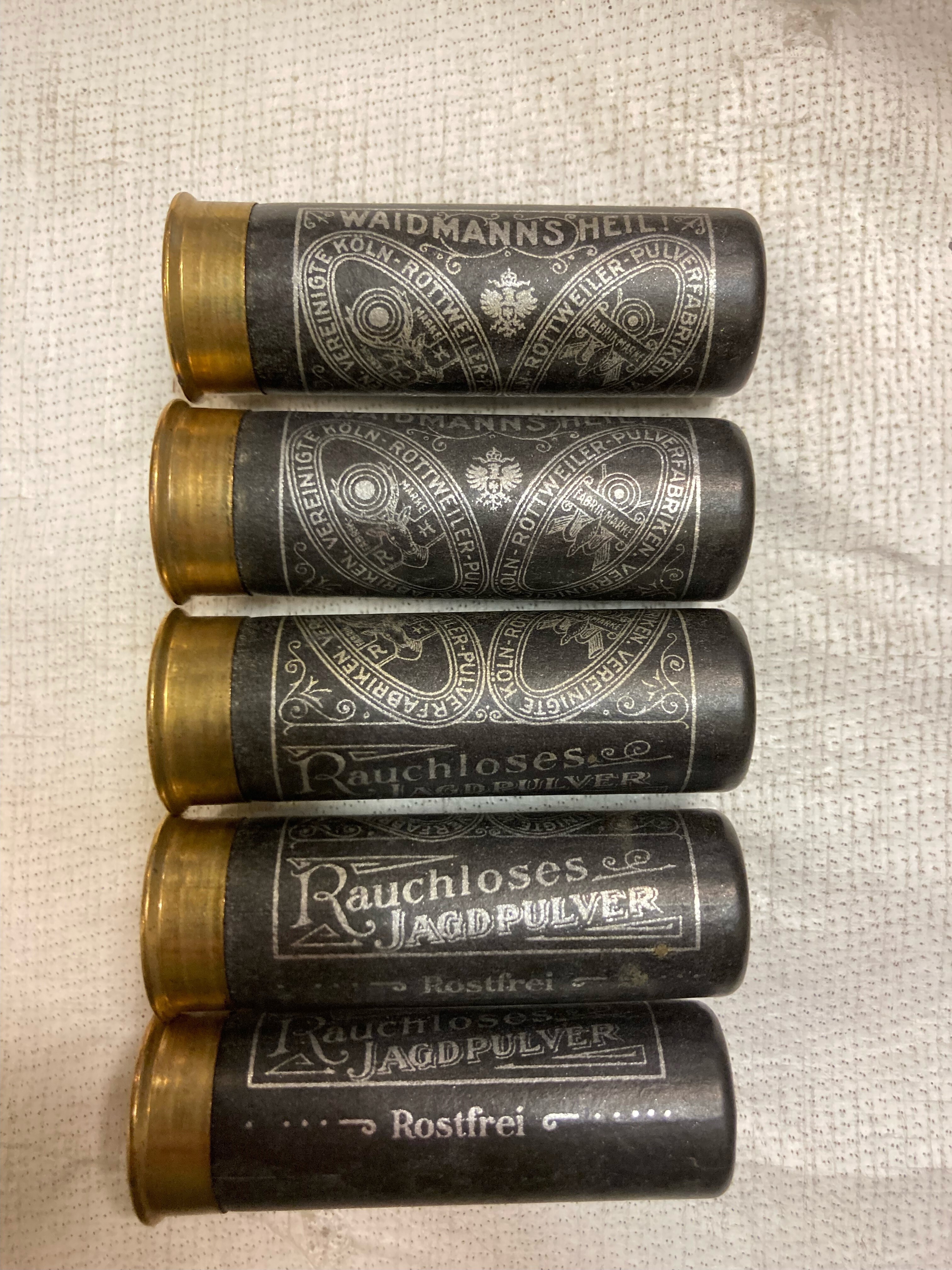 Hagelpatroner, 5 st, Ver. Köln-Rottweiler Pulverfabriken.