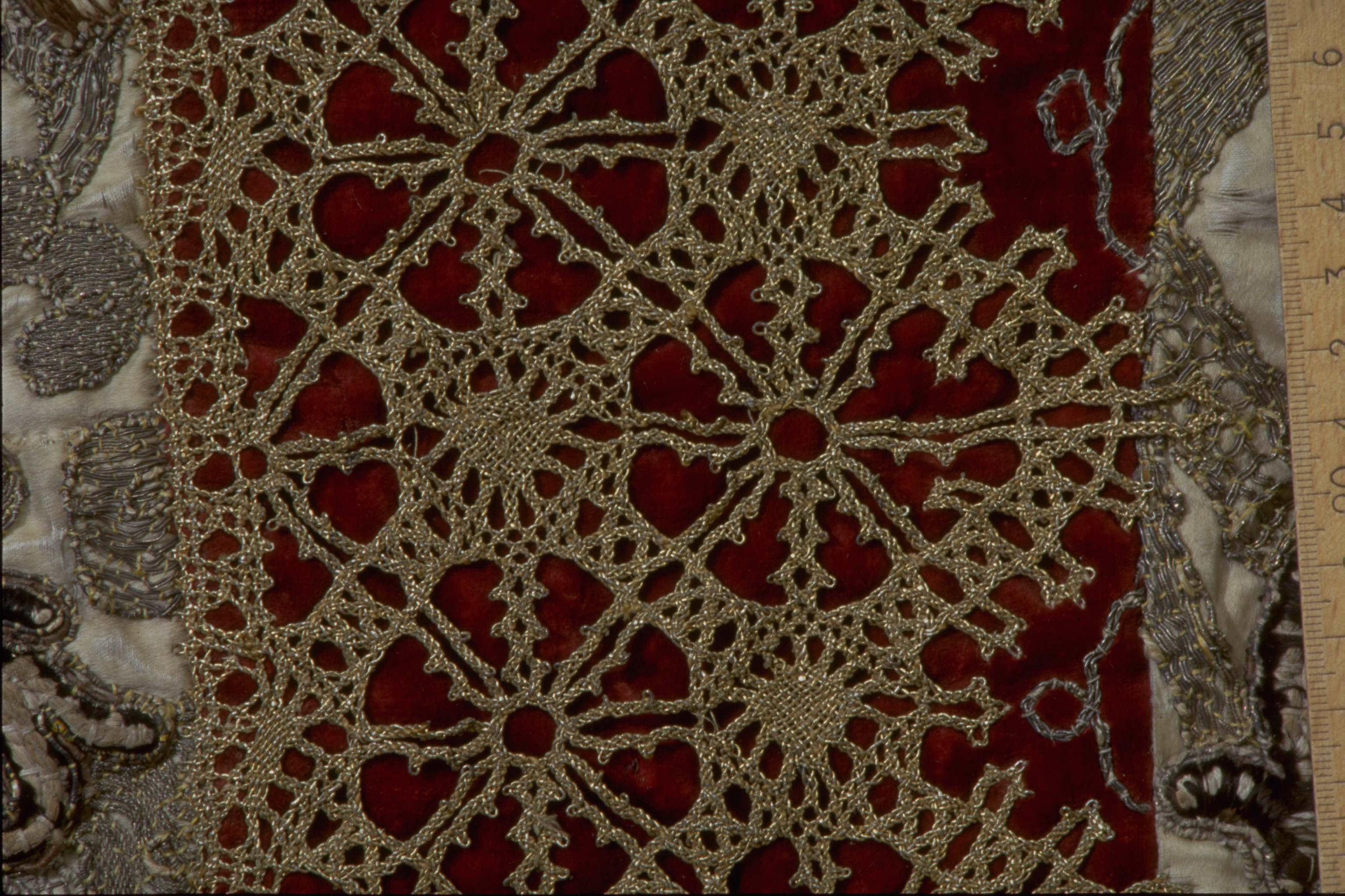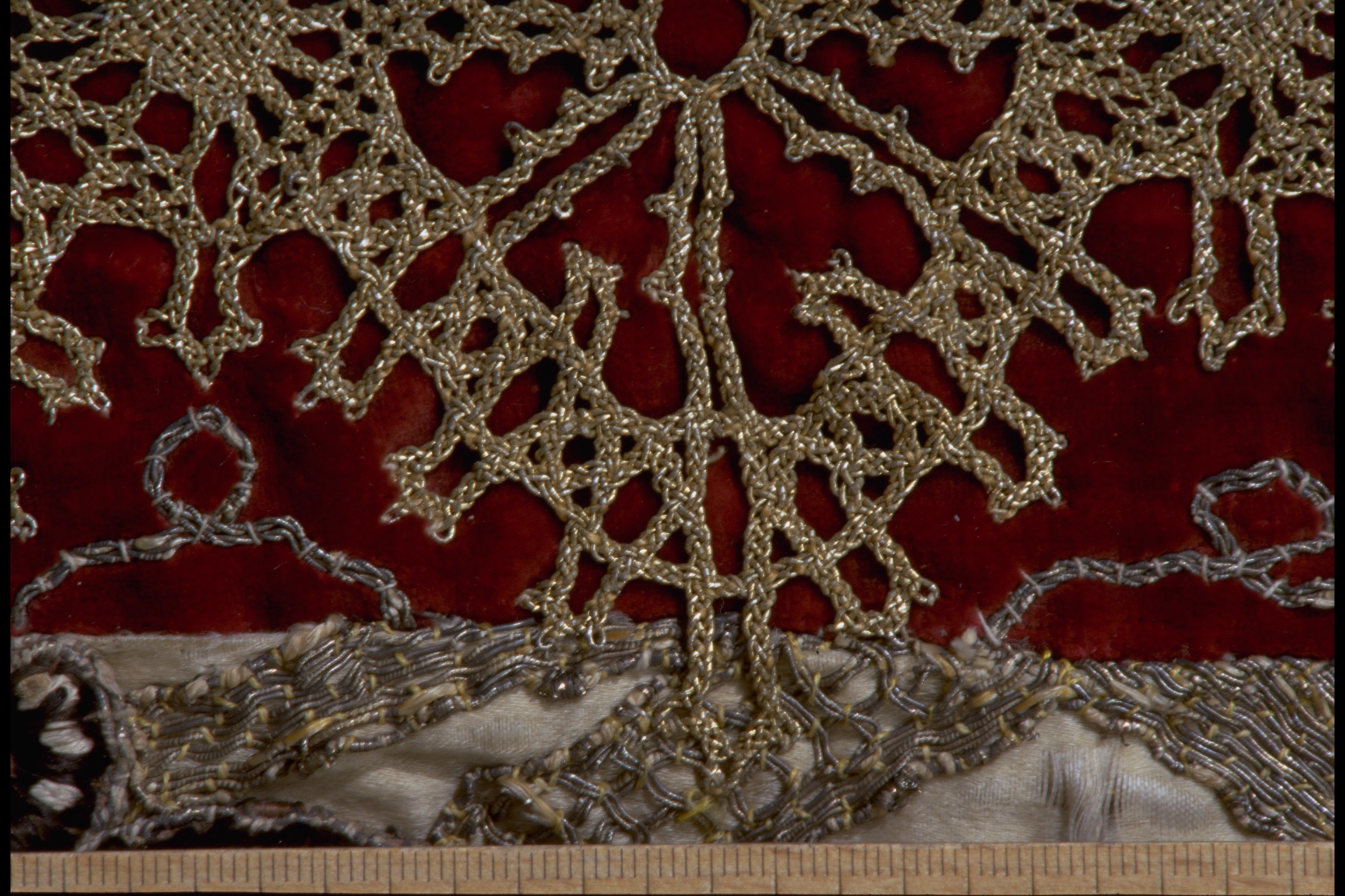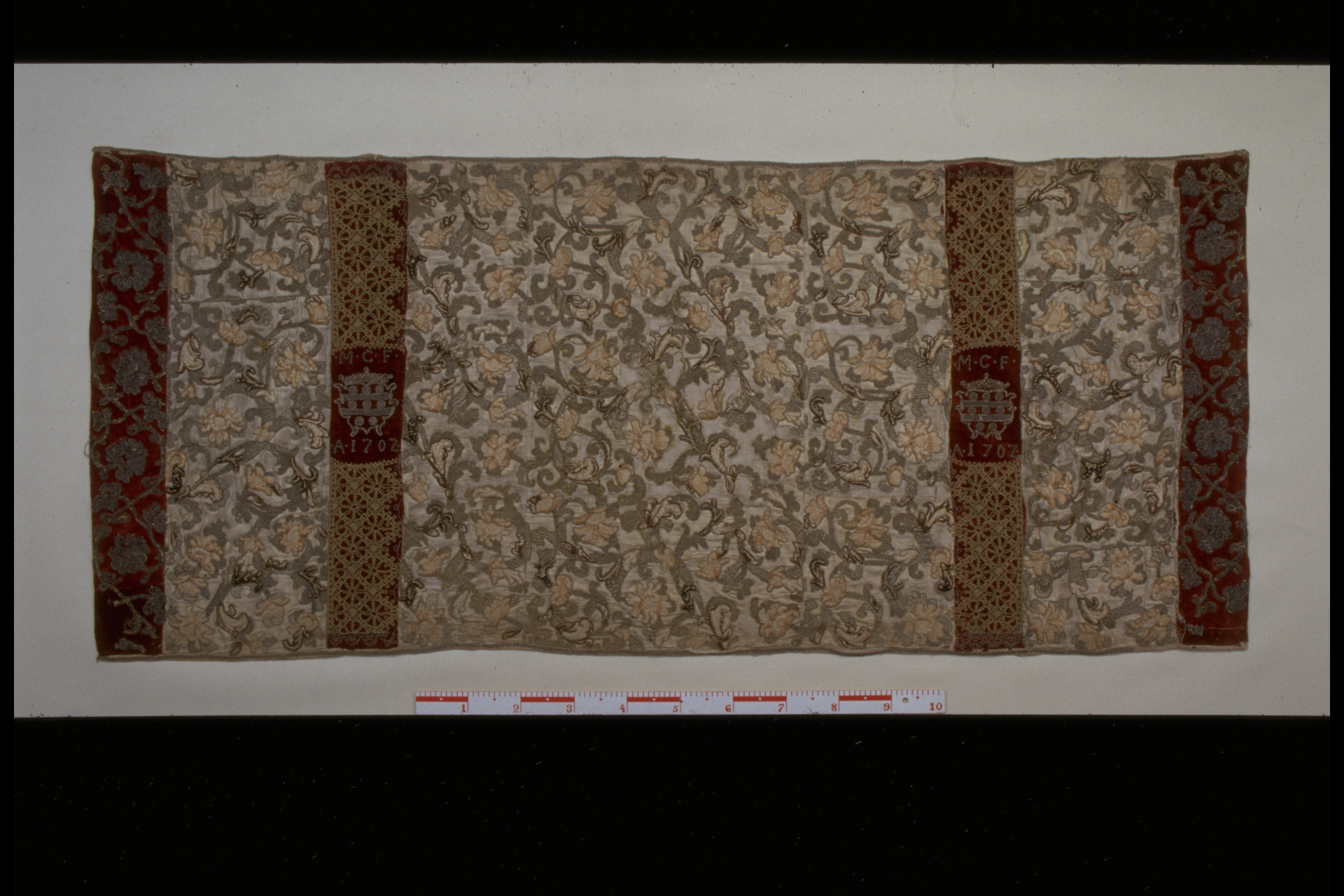 Vit atlas med guld- och silkebroderi av rankor. Vertikalt infällda bårder av röd sammet med breda knypplade guldspetsar och guldbroderat donatorsvapen, Fleming, samt initialerna M.C.F. och A. 1702. I kortändarna bårder av röd sammet med guld- och silverspets. Foder av ljusrött nu bleknad lärft. Deponerad 1949.