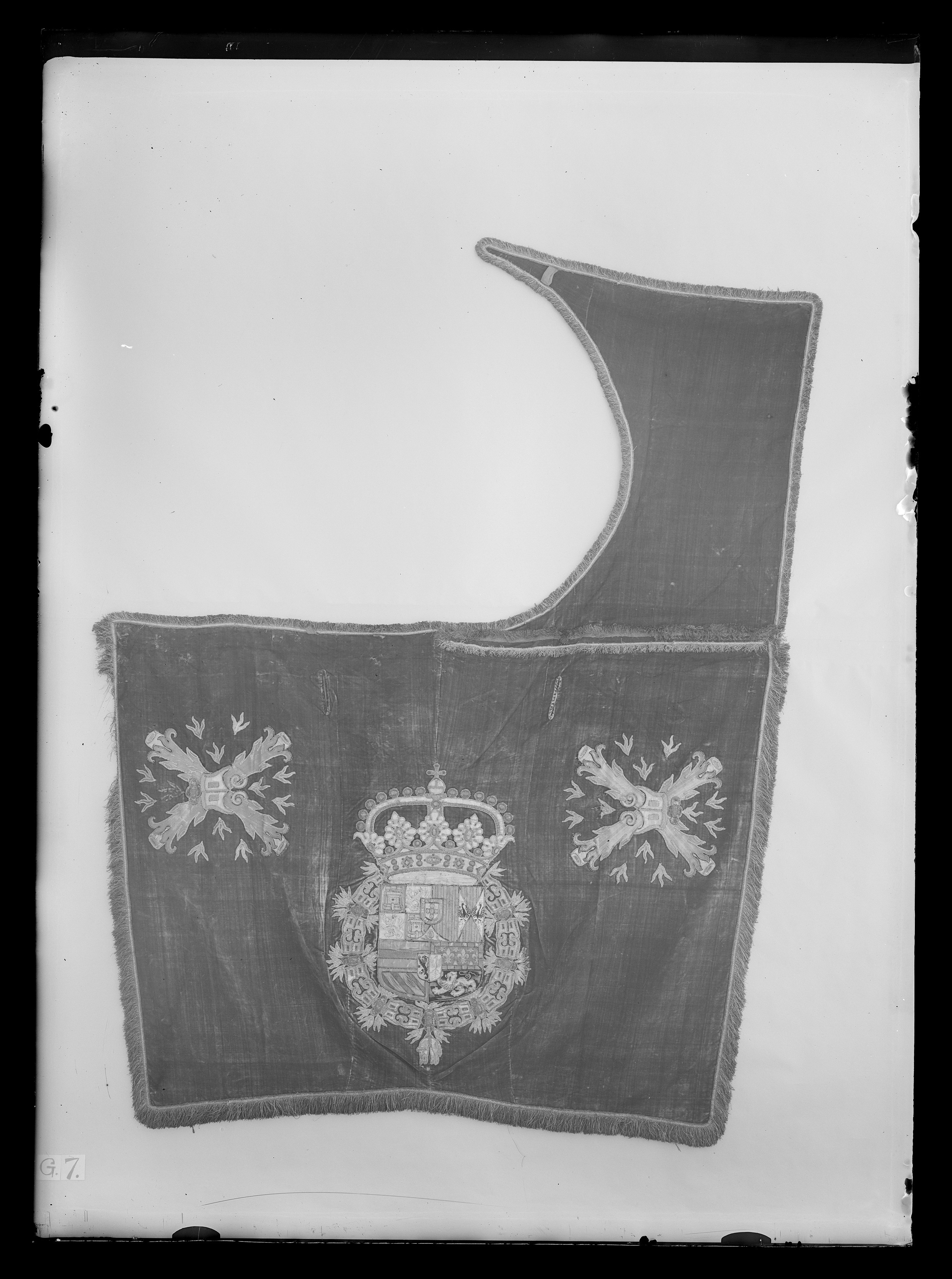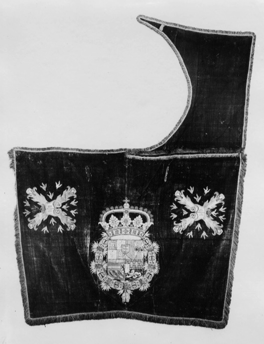 Bottentyg av röd sammet i kypert i fyra figursydda våder, de två yttre 530 mm breda till 220 mm från sammetens bakre kant där de är 460 mm. De två inre är 200 mm vid bakre kanten och 250 mm vid främre. 25 mm från sömmen mellan yttre och inre våderna och 100 mm från främre kanten 100 mm långa sprund, kantade med sammet. Bogstycket färst på höger sida. 80 mm från bakre kanten det spanska vapnet 720 mm högt och 500 mm som bredast. I de främre hörnen i kvistkors stål och flinta ca 350 mm högt och 400 mm brett, med eldtungor. Kungliga vapenskölden delad, på övre fältet Spaniens vapen med Portugal i hjärtsköld och Granada i mantelsnitt, på undre fältet Nederländenas vapen med Flandern och Tyrolen i kluven hjärtsköld. Övre fältet kluvet, högra delen kvadrerad med i fält 1 och 4 Kastilien, 1 2 och 3 Leon, vänstra delen kluven i Aragonien och Sicilien. Undre fältet kvadrerat med i fält 1 Österrike, i 2 och 3 gamla och nya Burgund och i 4 Brabant. Kastilien: kastaler av gyllenduk på röd sidenbotten. Leon: ljusa lejon av silke i schattersöm på gyllenduk. Aragonien: röd sidenbotten med bjälkar av guldtråd i läggsöm. Sicilien: örnar av svart silke i schattersöm på gyllenduk. Portugal: röd sidenbård med guldkastaler, silversköld av gyllenduk med fem små sköldar av blått silke i plattsöm med bollar, två, en och två, av silvertråd. Granada: granat av ljust rosa silke i schattersöm och gröna blad på gyllenduk. Österrike: röd sidenbotten med bjälke av metalltråd i läggsöm. Burgund, gamla: bård av rött siden och silver i läggsöm, mittfält av blått siden med franska liljor i plattsöm av guldtråd. Burgund, nya: bård av rött siden, balkat mittfält av blått siden och guldtråd i läggsöm. Brabant: gult lejon av gyllenduk på svart sidenbotten. Flandern: lejon av svart silke i schattersöm på gul gyllenduk. Tyrolen: örn av ljust rosa silke i schattersöm på gul gyllenduk. Vapnet krönes av en sluten krona, av applikationer av gul gyllenduk och pärlformer av silver och guldtråd och silke i blått, rött och rosa. Vapenskölden omges av gyllene skinnets orden av applikationer av gul gyllenduk som stål och blå gyllenduk i fyrpassblomma med stygn av blått silke och i mitten en ellipsform med läggsöm av silver, och eldgnistor broderade med lan av guld och silver. Kvistkorsets armar av röd sidenatlas och med kanonmynningar av gyllenduk och öppningar av silverlan. Flinta av gyllenduk med bård av guldsnoddar i läggsöm. Eldgnistor av guld och silverlan. Frans i två lager, det undre av rött silke, det övre av guld och silver med ca 6 mm stad. Längs schabrakets sidor och bakre kant 50 mm bred, längs framkanten och runt bostycket 30 mm, silkesfransen mellan framkant och bogstycke i sömmen, men guld och silverfransen fastsydd 15 mm innanför denna, hängande åt motsatt håll. På vänstra halvans framkant rester av två röda sidenband. 180 mm från bostyckets fria kants övre hörn är ett rött sidenband 30 mm brett sytt fast tvärsöver flikan. Fem lädertampar med mässingsringar längs framkanten. Foder av linne i tuskaft. I bakre vänstra hörnet en märklapp " No 628, 8 st Häst Täcken".