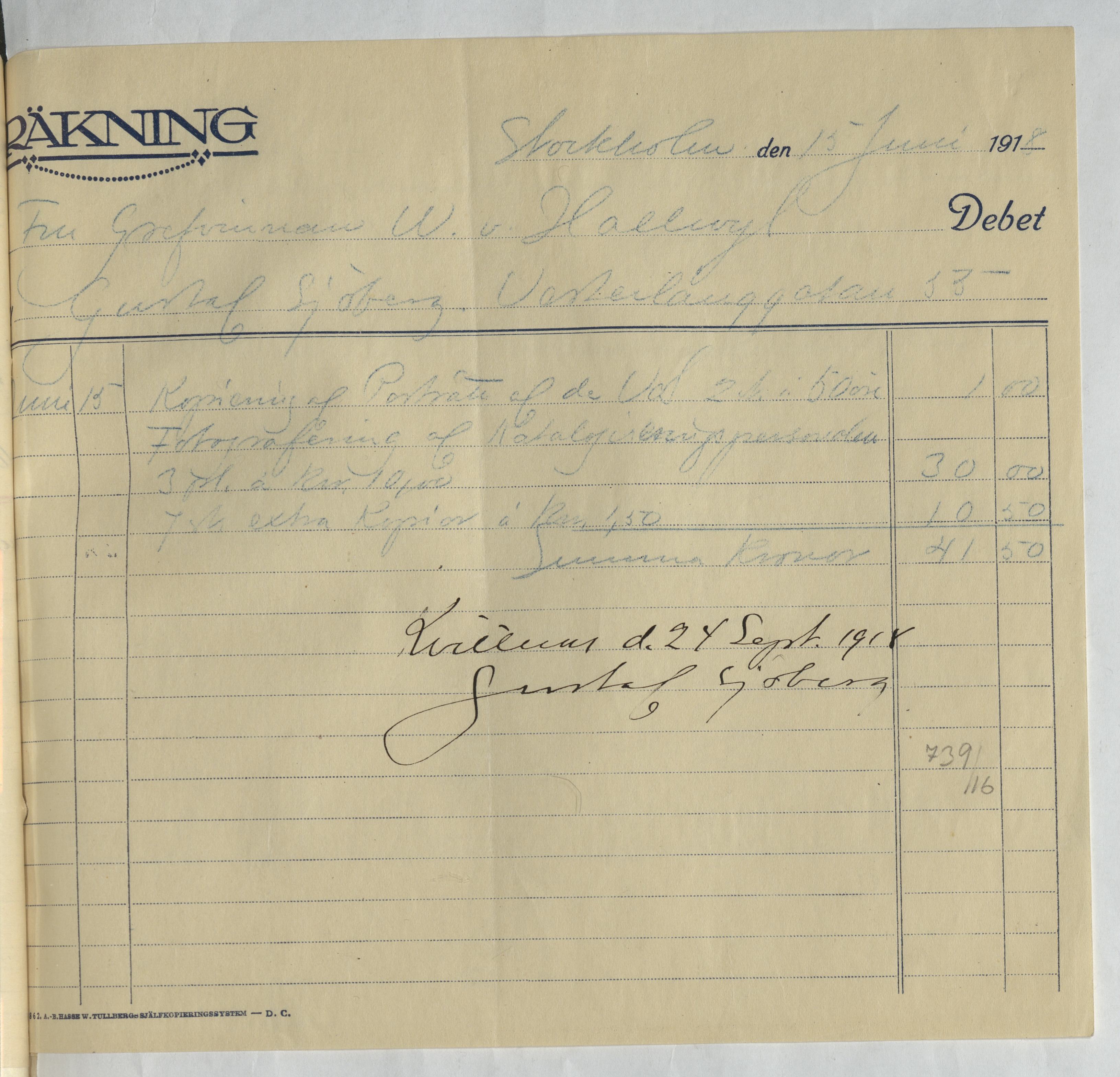 Kvitto från Gustaf Sjöberg. Gällande betalning för hans arbete med fotografering av museisamlingarna. Stockholm, 1918.