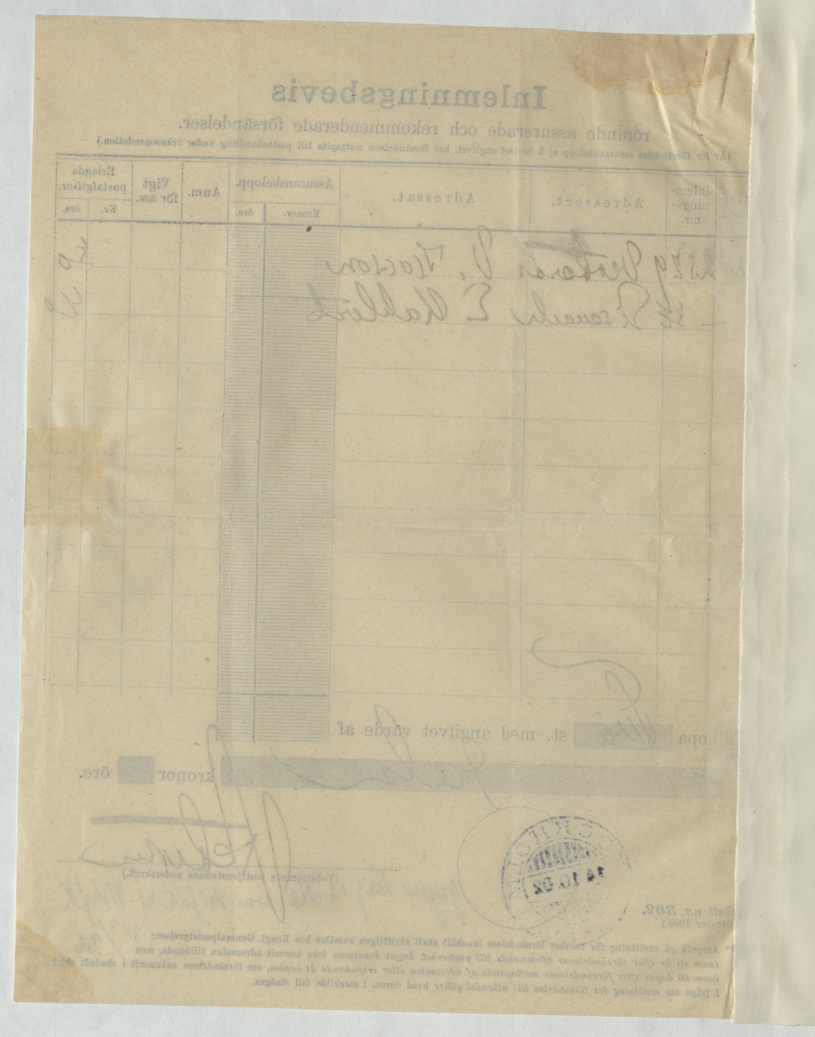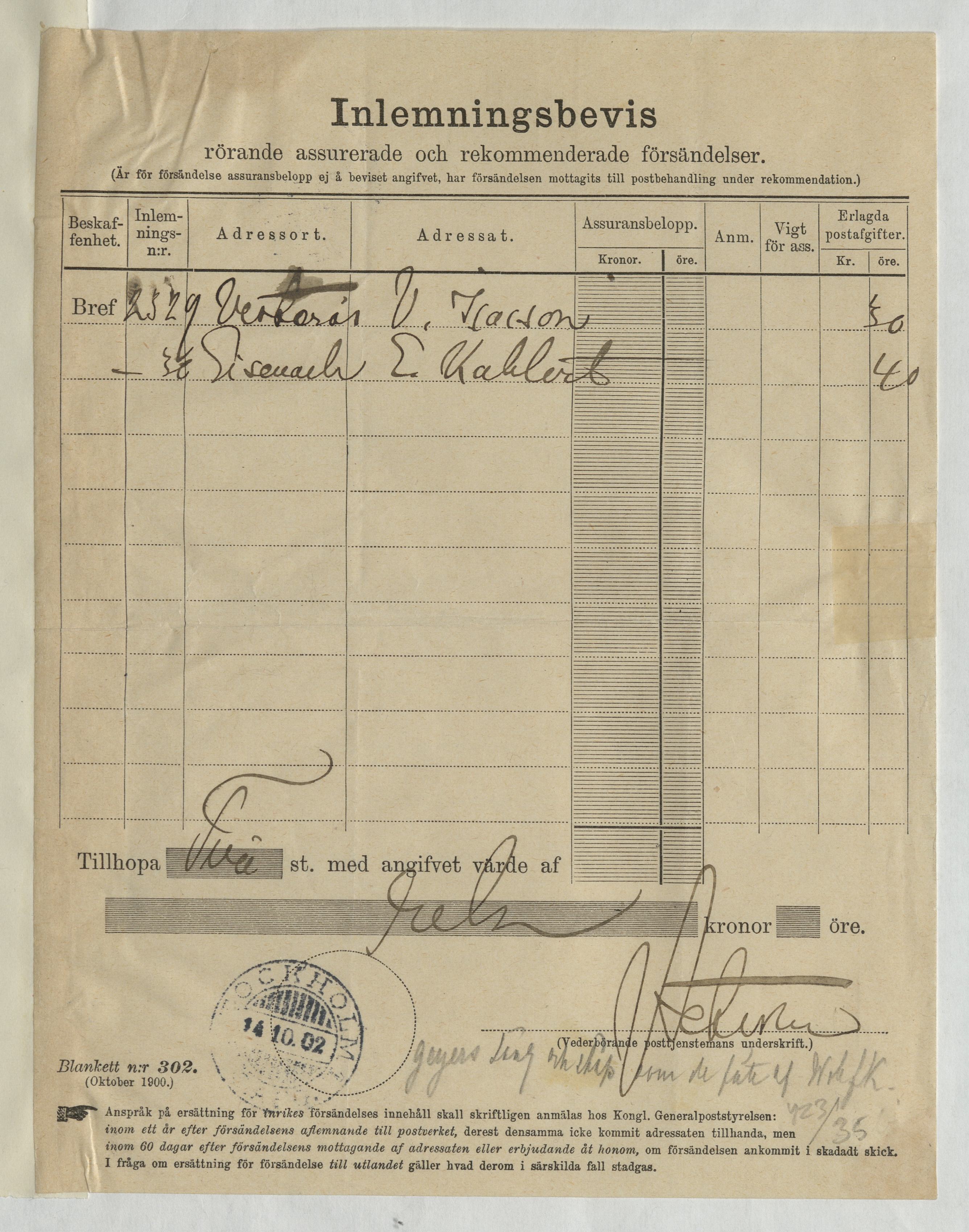 Inlämningsbevis rörande assurerade och rekommenderade försändelser gällande varor från Eduard Kahlert. Stockholm, 1902.