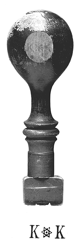 Kantställd rektangulär skiva, något avtunnad nedåt från sidorna; i nedre ändan, i högrelief en sexuddig stjärna mellan initialerna K och K (avtryck se Planschverket). Skaft av björk, svarvat, svartbetsat och polerat; nedre delen starkt inknipen, nedtill en profilerad utsvällning, nedanför denna en slät cylindrisk mässingsholk; övre ändan starkt utsvälld i form av en klotformig knopp, varpå en rund plattning, avgivande hur stämpeln skall hållas. Tillhört inventarierna på Wilh. H. Kempes kontor, inrymt i Schinkelska huset, dåvarande adress Kornhamnstorg 2 (f. d. Lilla Nygatan 29, nuvarande Kornhamnstorg 4), Stockholm, 1843 -1883; därefter på firman Wilh. H. Kempes (innehavare Walther von Hallwyl och Johanna Kempe, f. Wallis) kontor, Blasieholmstorg II, 1884 - 30 September 1896, och Hamngatan 4, 1 Oktober 1896 - 1909