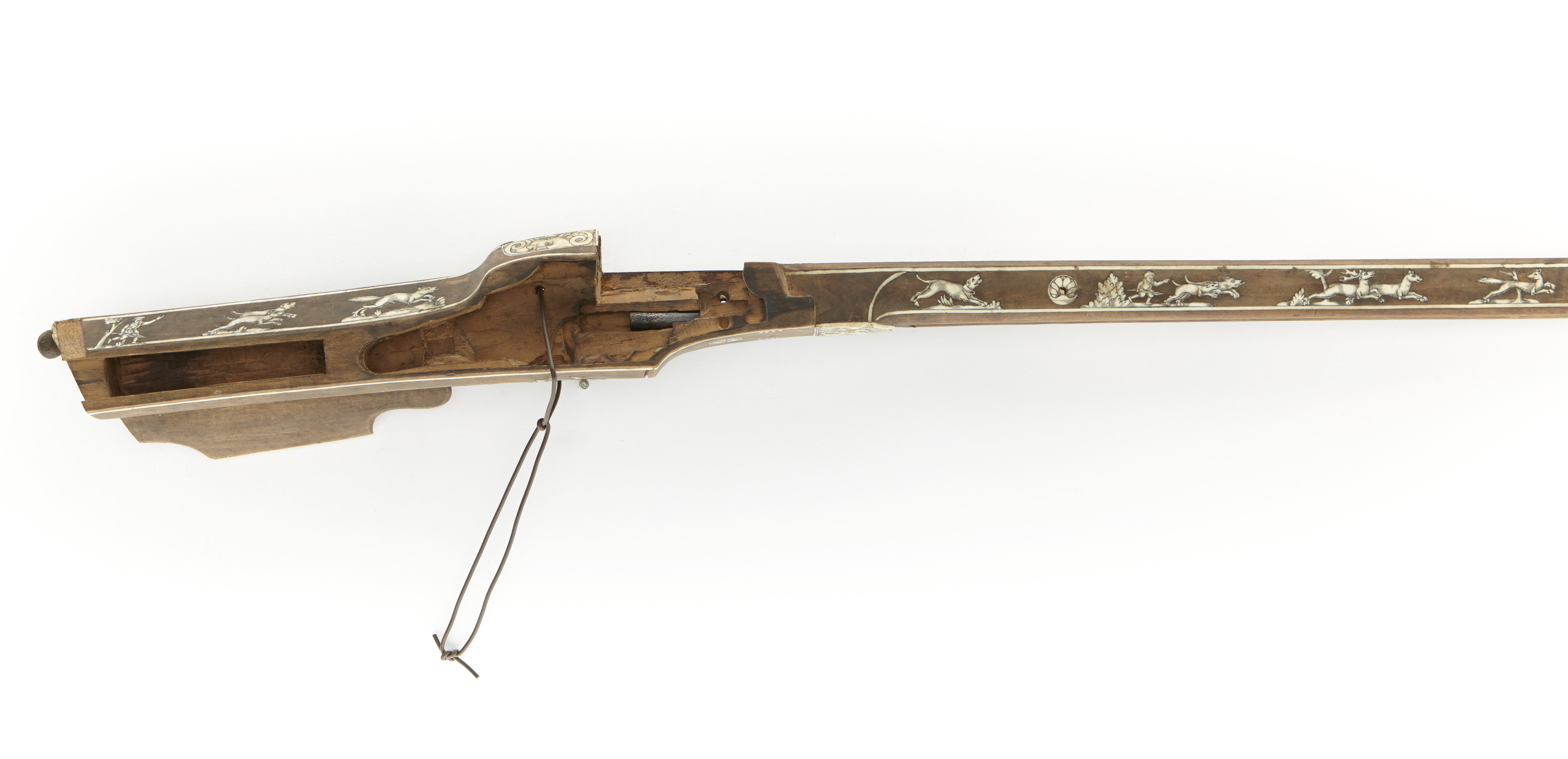Pipa och lås saknas. Brun helstock av valnöt. Kolven är av tysk typ med en bakplåt av ben och stödkula av trä samt kolvlåda. Stocken är inlagd med benlister längs kanterna och jaktscener av graverat ben förekommer på hela stocken. På anslaget avbildas en man med en hund i koppel av graverat ben. Bakom svansskruvbladet är graverat: "V.L" i ben och en det finns en lilja på själva kolven. Överrörka och näsband av graverat ben. Två låsbrickor av graverat ben. Tillbehör: Laddstock av trä med doppsko av ben, nedtill gängat stålrör. Märkt: 94 (otydligt) ovanför låsblecket, stanstyp 5376. Enligt 1710 års inventarium p. 2, rum I: "-94-1 Ståck mycket wäl beensatt, Hiulååss till men utan pijpa".