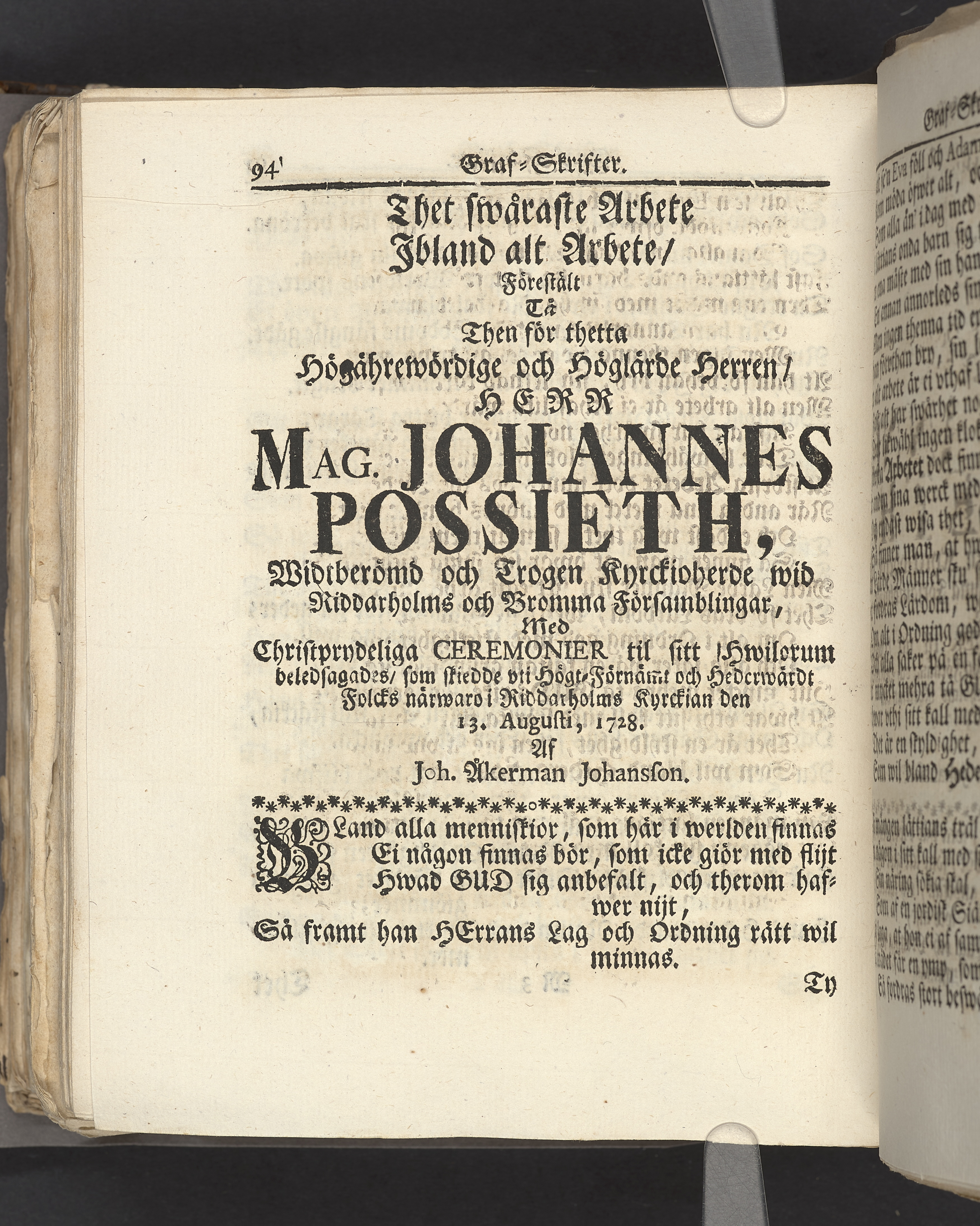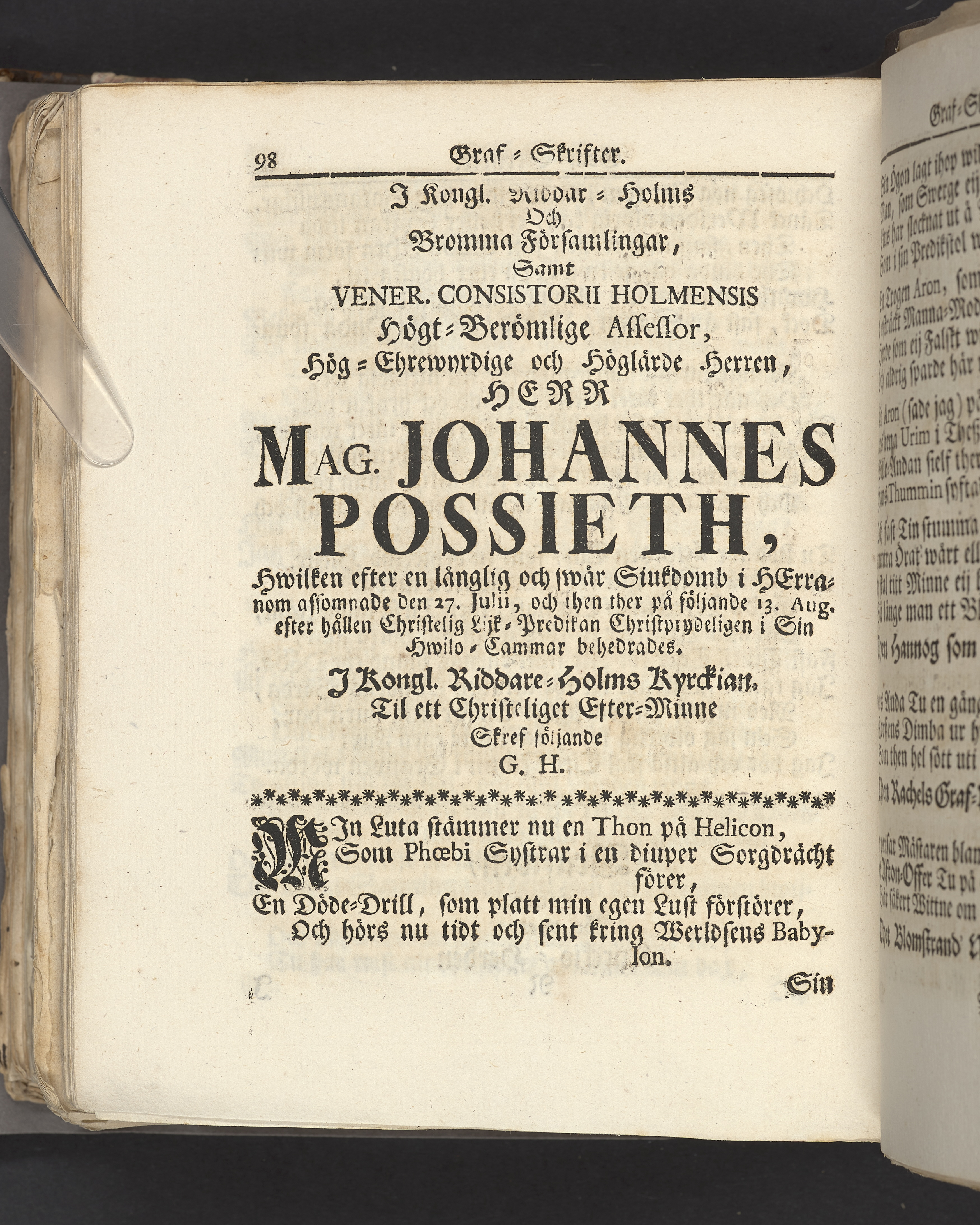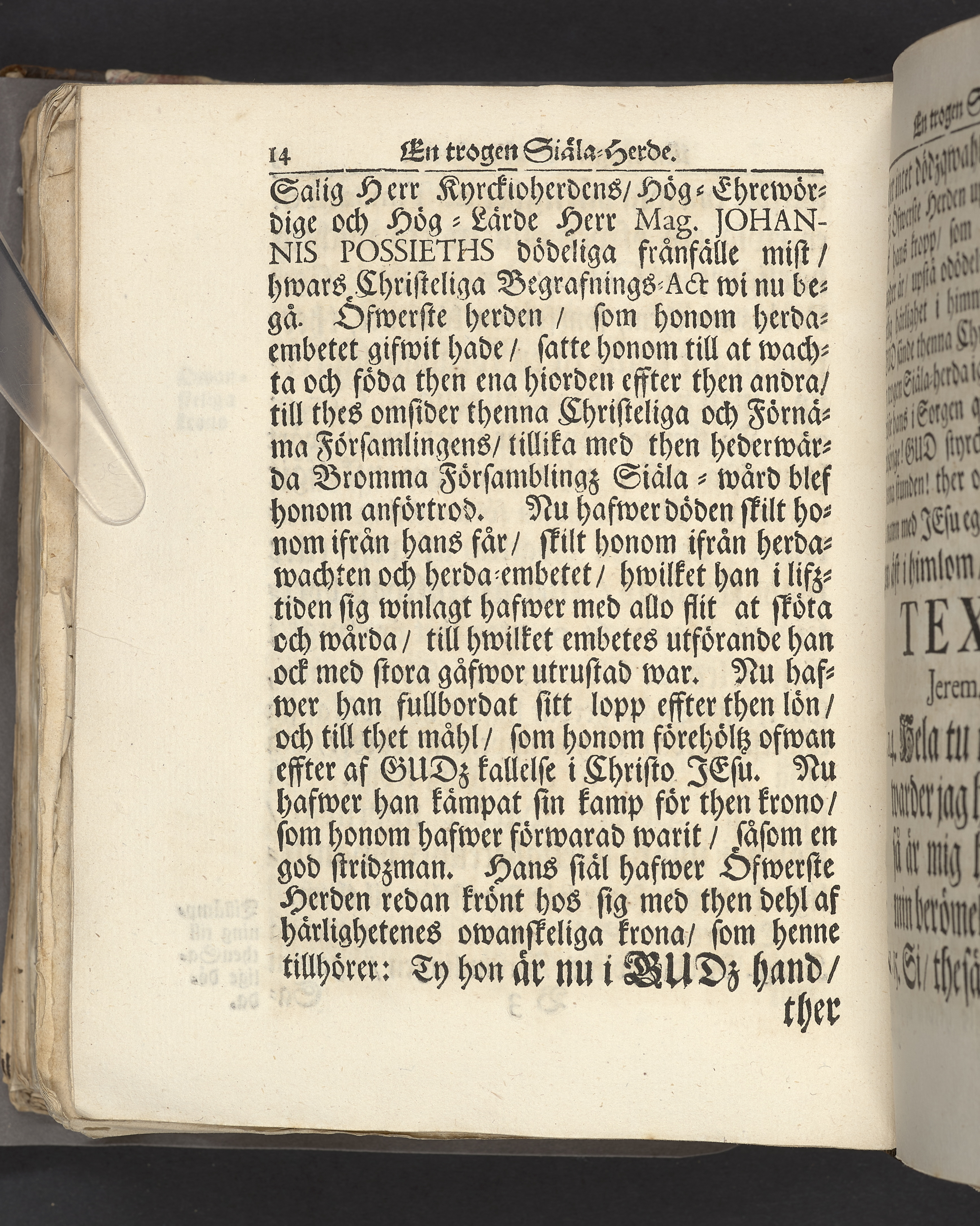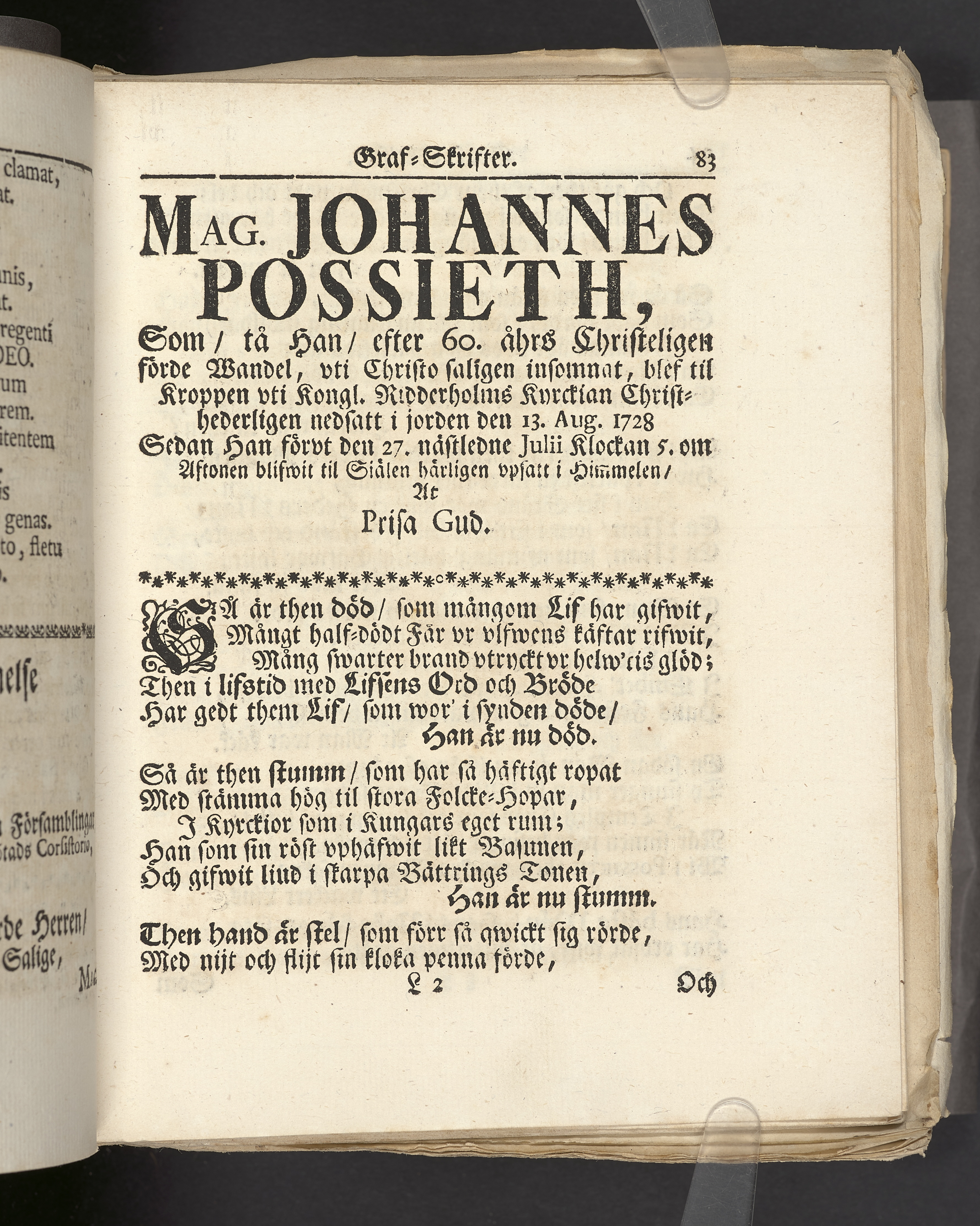 En trogen siäla-herde, uti en christelig lik-predikan öfwer för thetta kyrckioherden uti kungl. Ridderholmens och Bromma församlingar ... nu mehra ewinnerligen hos Gud sal. herren, herr M. Johannes Possieth, som med tillbörlig heder till sin graf och hwilo-kammar blef beledsagad i kungl. Ridderholms kyrckan then 13. aug. anno 1729. före stäld af Nicolao Barchio ... Tryckt hos Joh. L. Horrn, kongl. ant. arch. boktr.